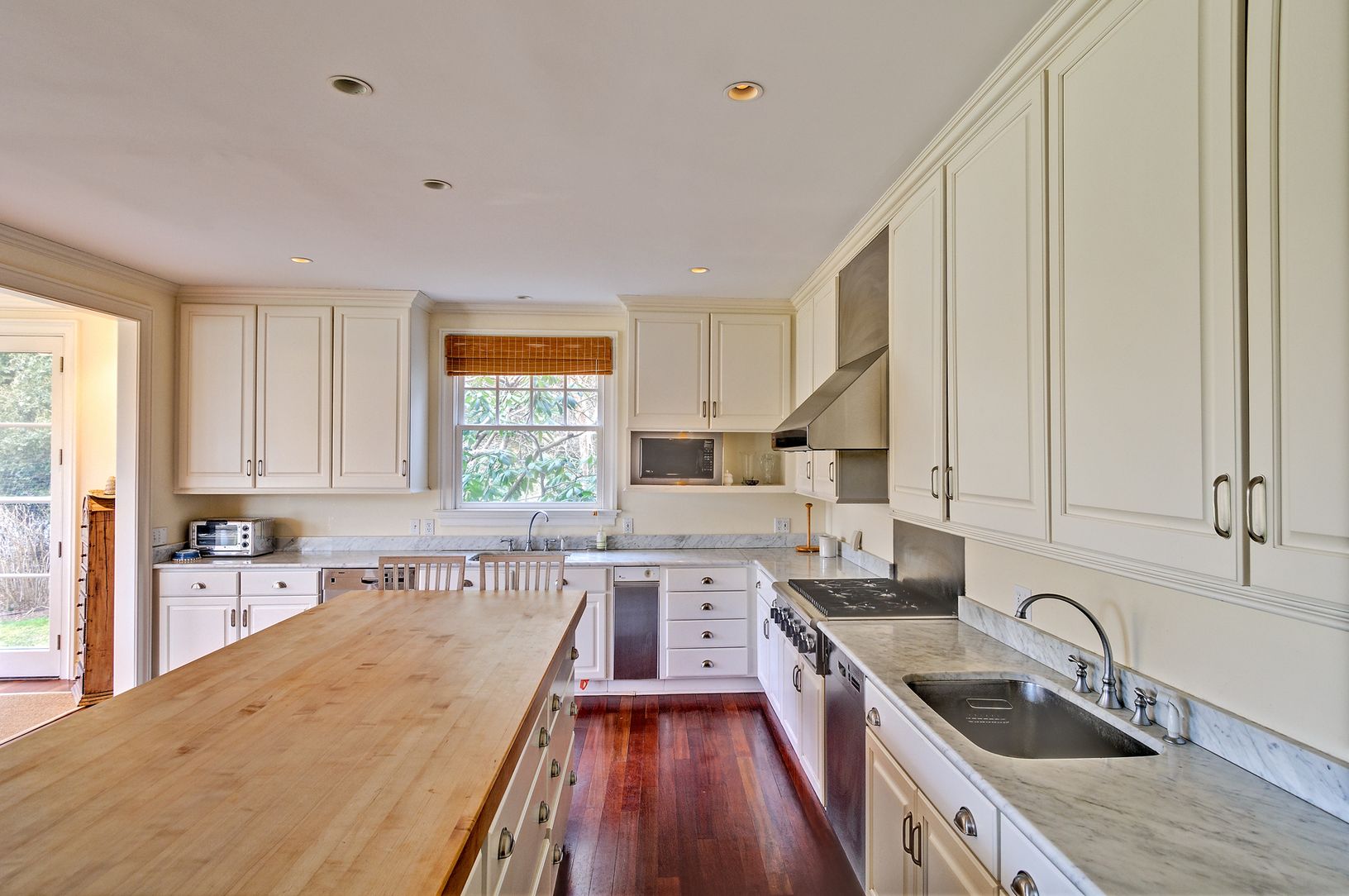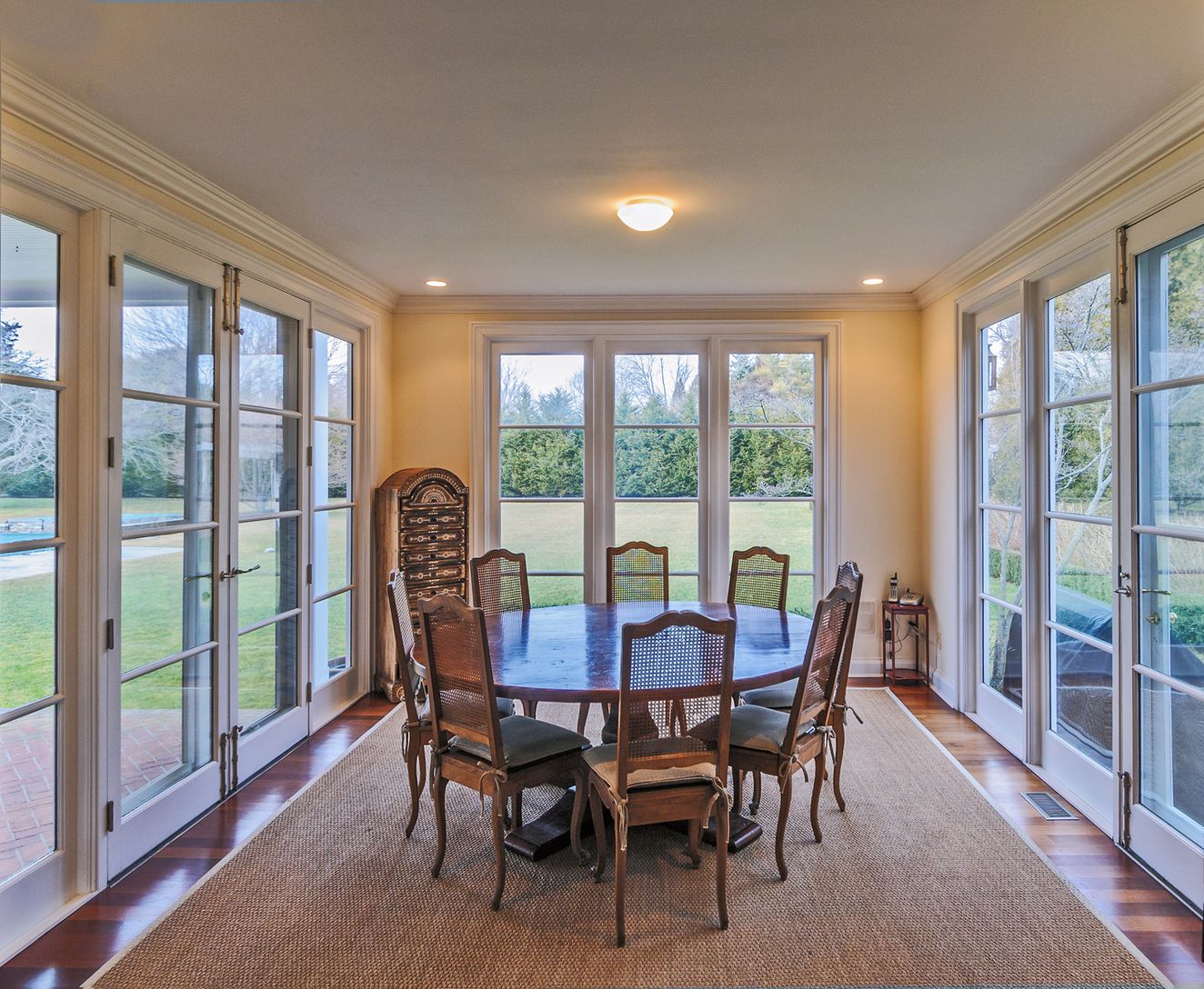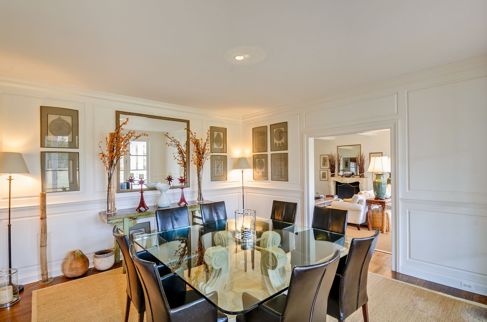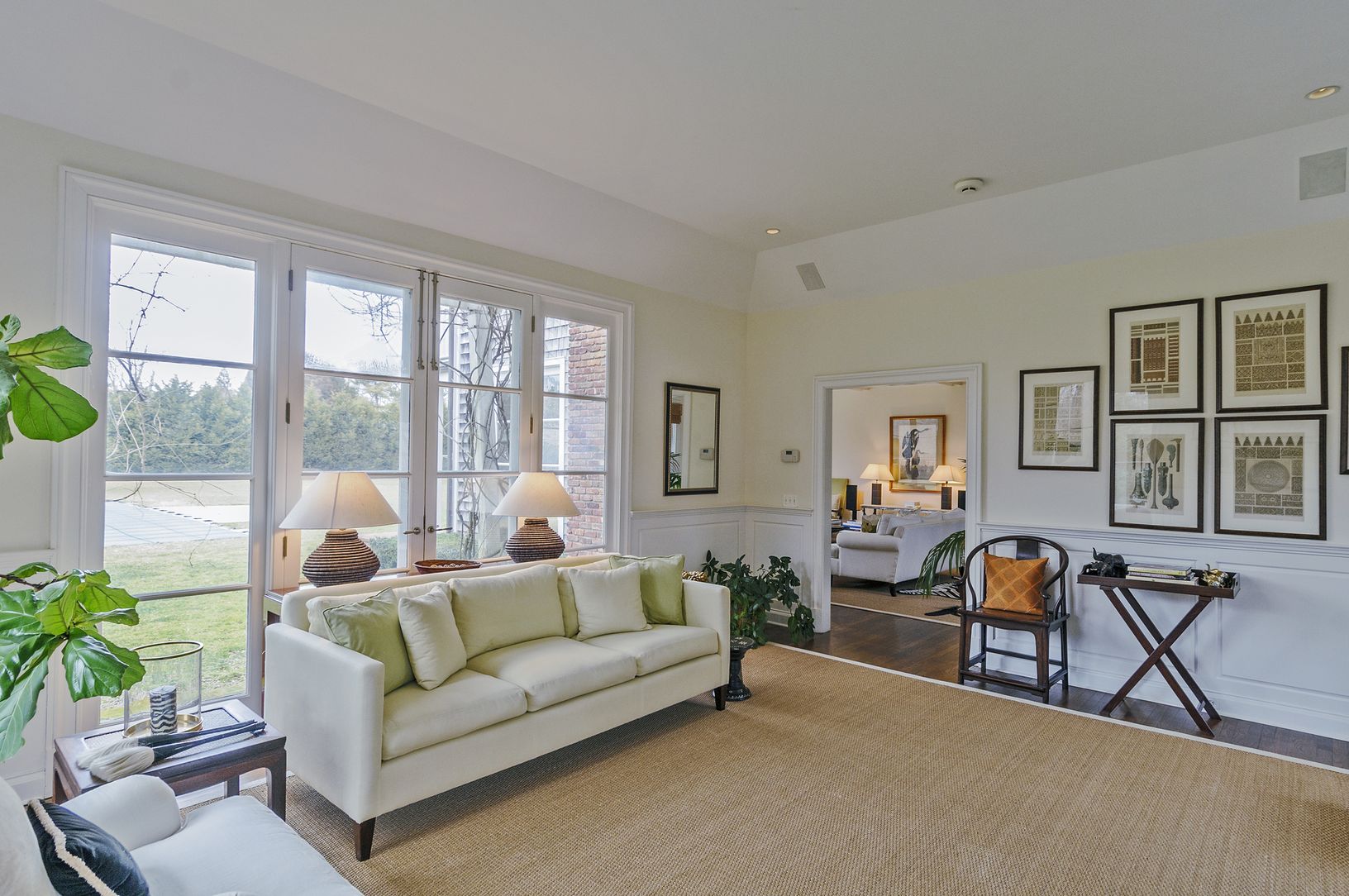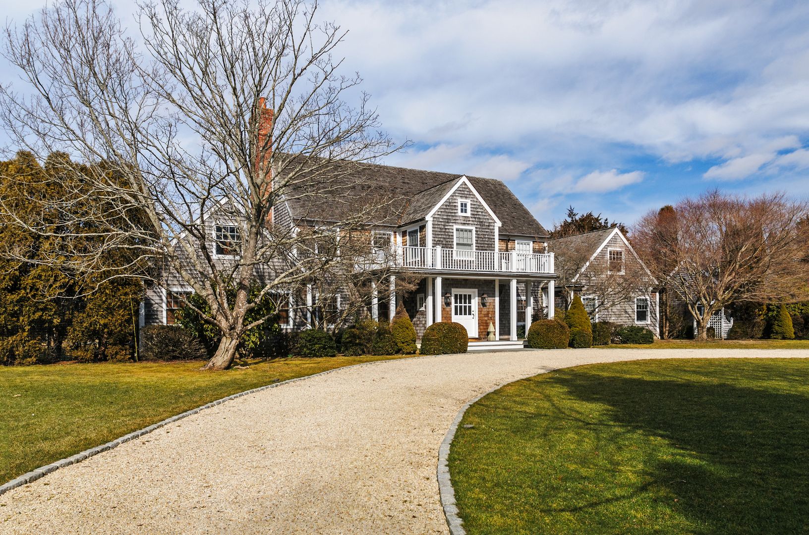 In Southampton's Estate Section, shielded down a long shared driveway, this classic, cedar-shingled, Roger Roberts traditional home on over two acres stylishly presents everything for the most discerning owner, including Har-Tru tennis, half-court basketball, heated Gunite pool, and pool house/studio. With 5000 s.f. of living space, the ground floor opens with foyer, powder room, and moves through to a formal dining room, living room with fire