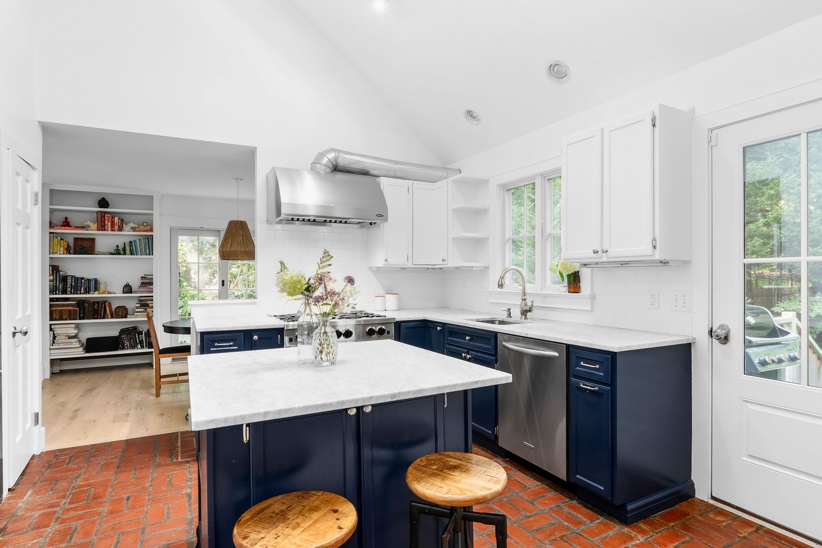 Surrounded by enchanting gardens and a fenced-in yard, this East Hampton 3-bed, 2-bath Cape home is turnkey and ready for your arrival. A large, bright kitchen features Carrera marble, a BlueStar range, an eat-in kitchen, and direct access to the large deck that is perfect for entertaining. The living room with a wood-burning fireplace flows seamlessly and floods with natural light from the surrounding windows and sliding glass doors to a side