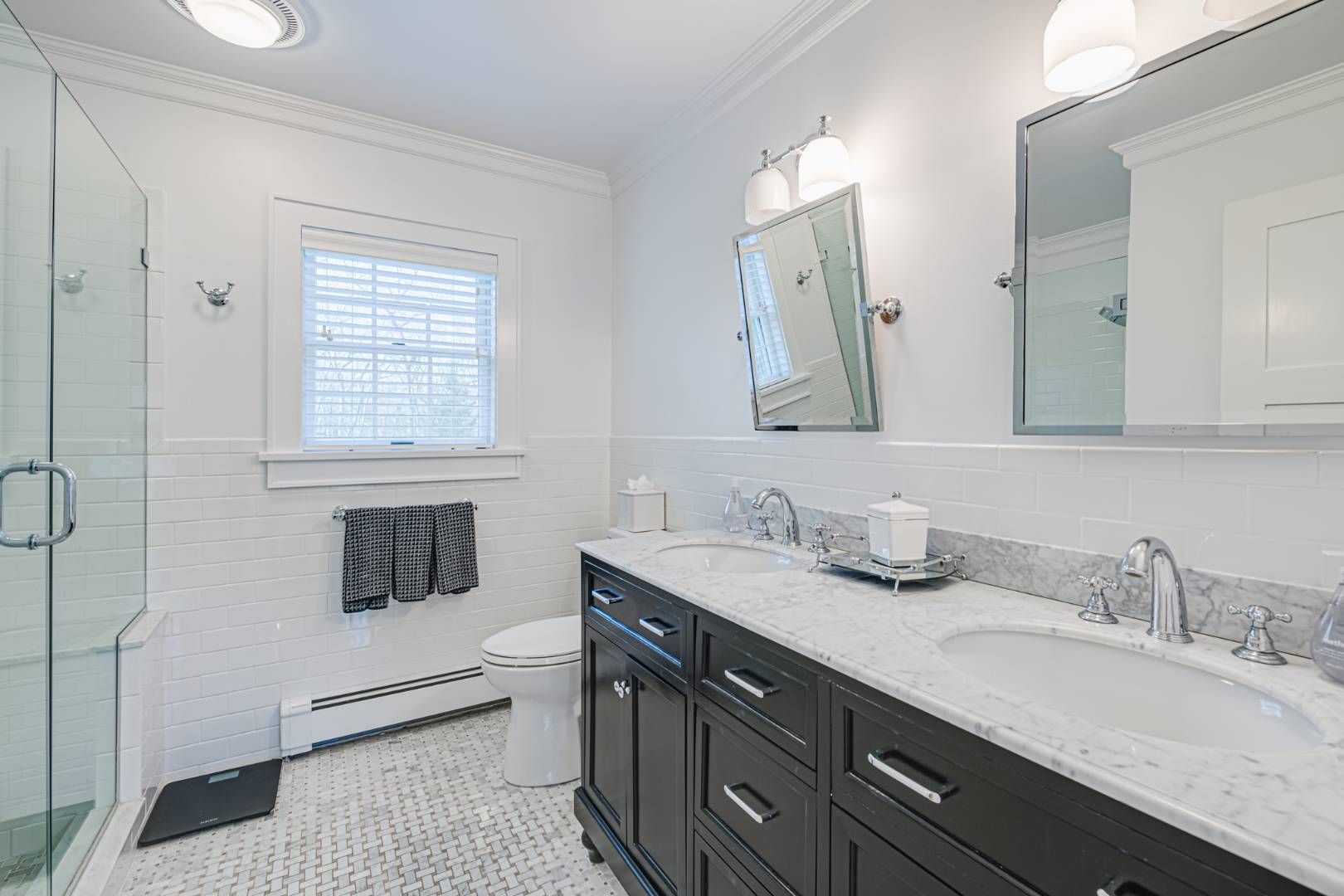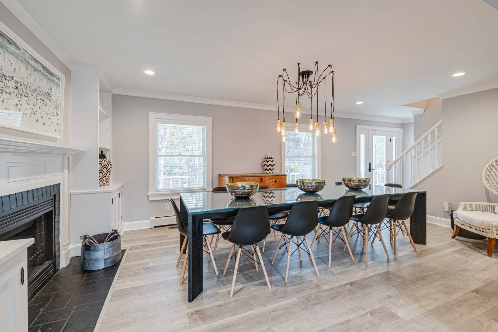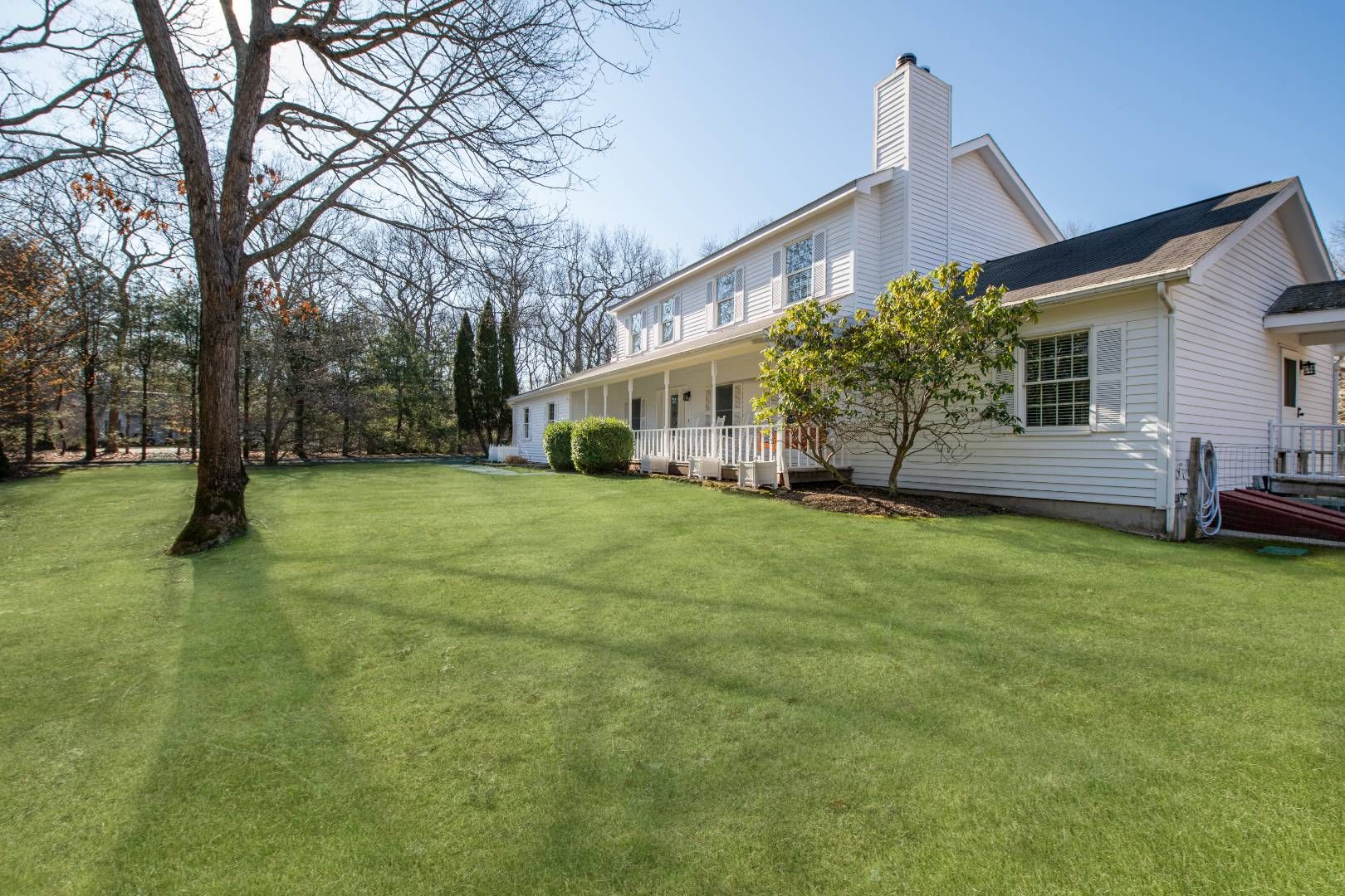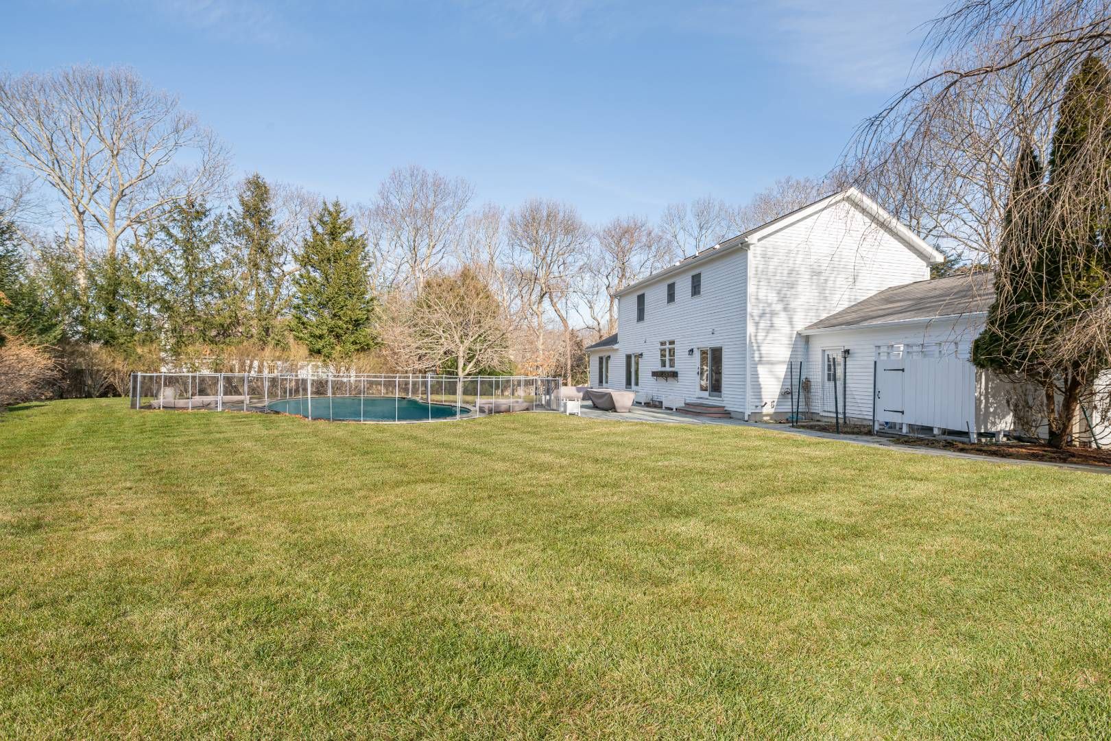 On a flag lot off a quiet street in Springs, this two-story 2,864+/- sq. ft., five bedroom, three and a half bath traditional built in 1992 has been extensively renovated in recent years, with many new upgrades in 2019. First floor living areas include a living room with fireplace, kitchen with newly restained cherry cabinets, new Caesarstone countertops and new stainless steel appliances. A renovated guest bedroom/office features a large new