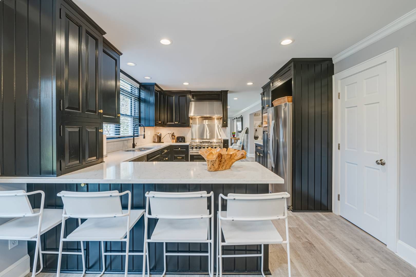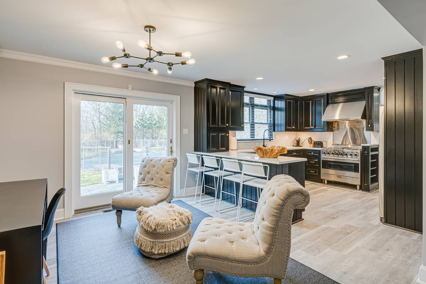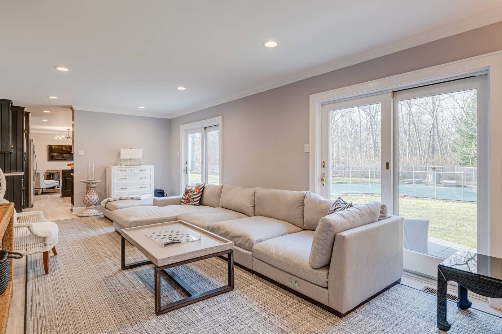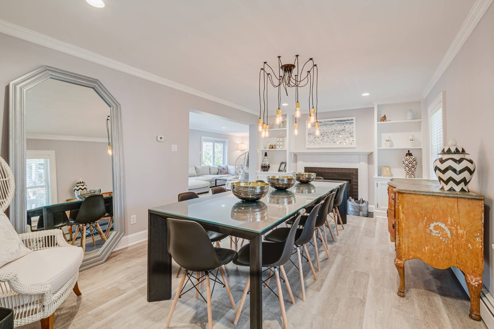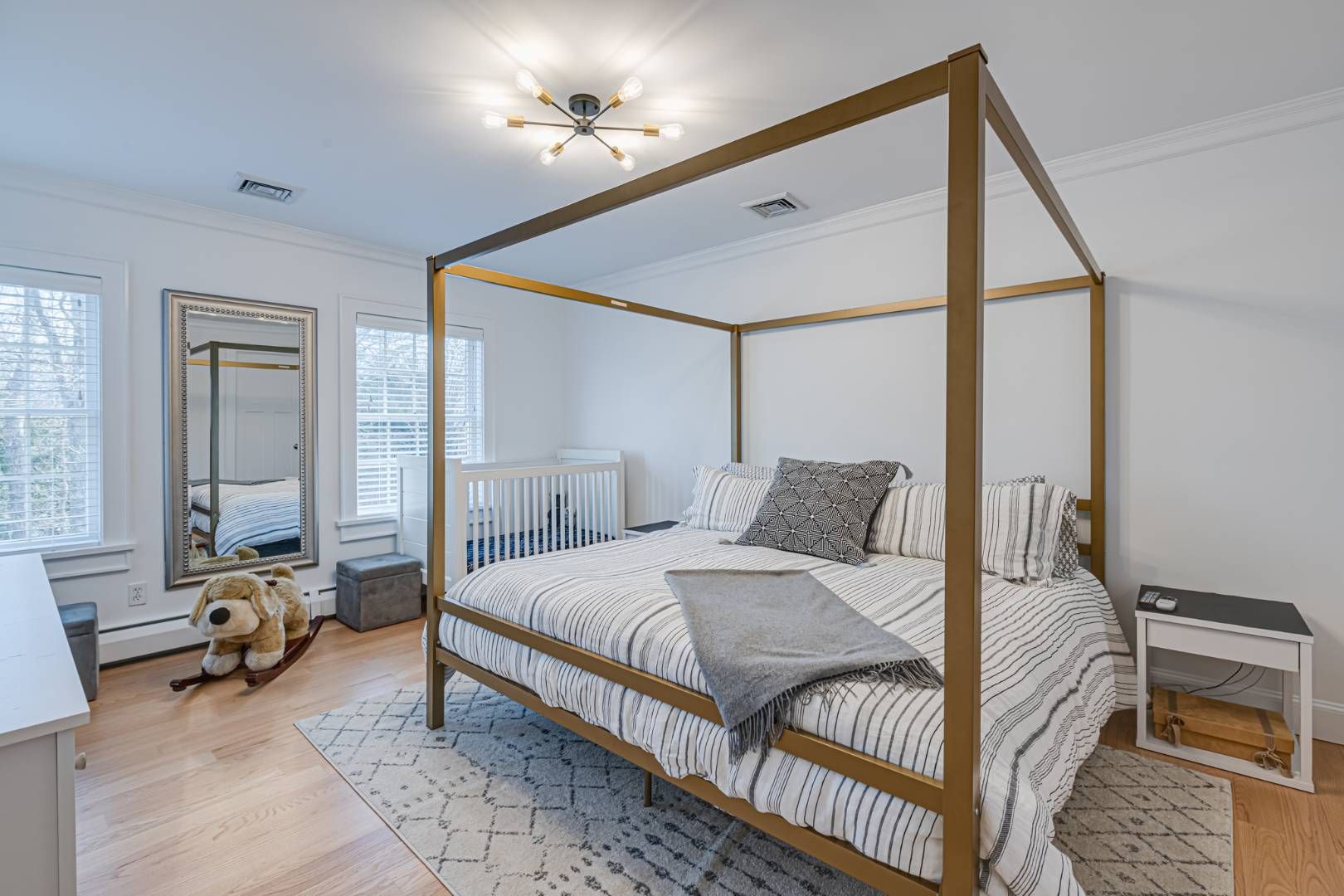 On a flag lot off a quiet street in Springs, this two-story 2,864+/- sq. ft., five bedroom, three and a half bath traditional built in 1992 has been extensively renovated in recent years, with many new upgrades in 2019. First floor living areas include a living room with fireplace, kitchen with newly restained cherry cabinets, new Caesarstone countertops and new stainless steel appliances. A renovated guest bedroom/office features a large new