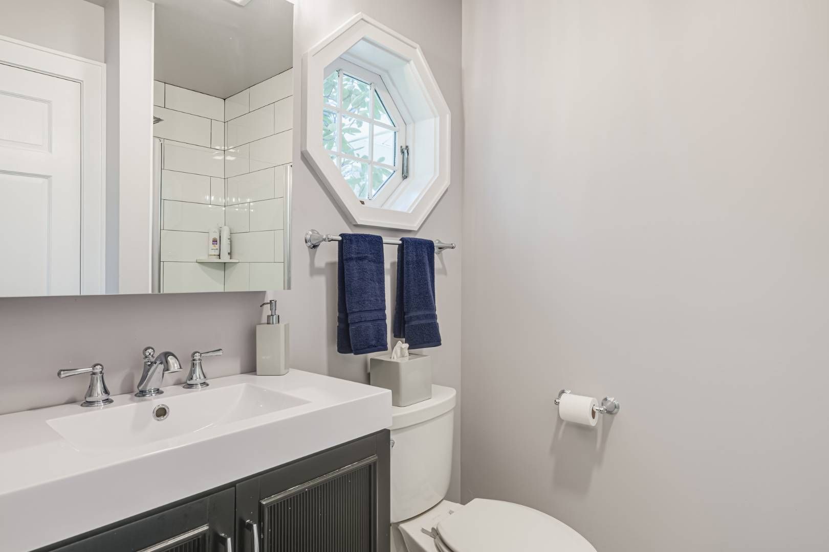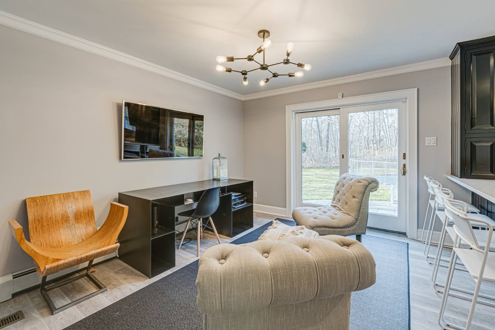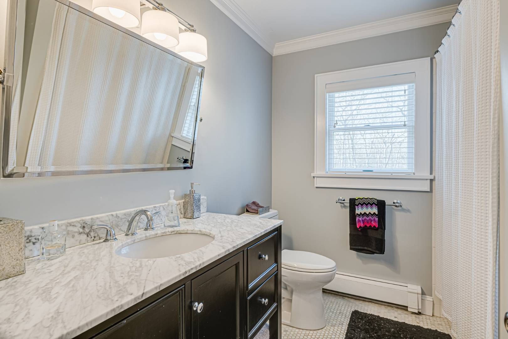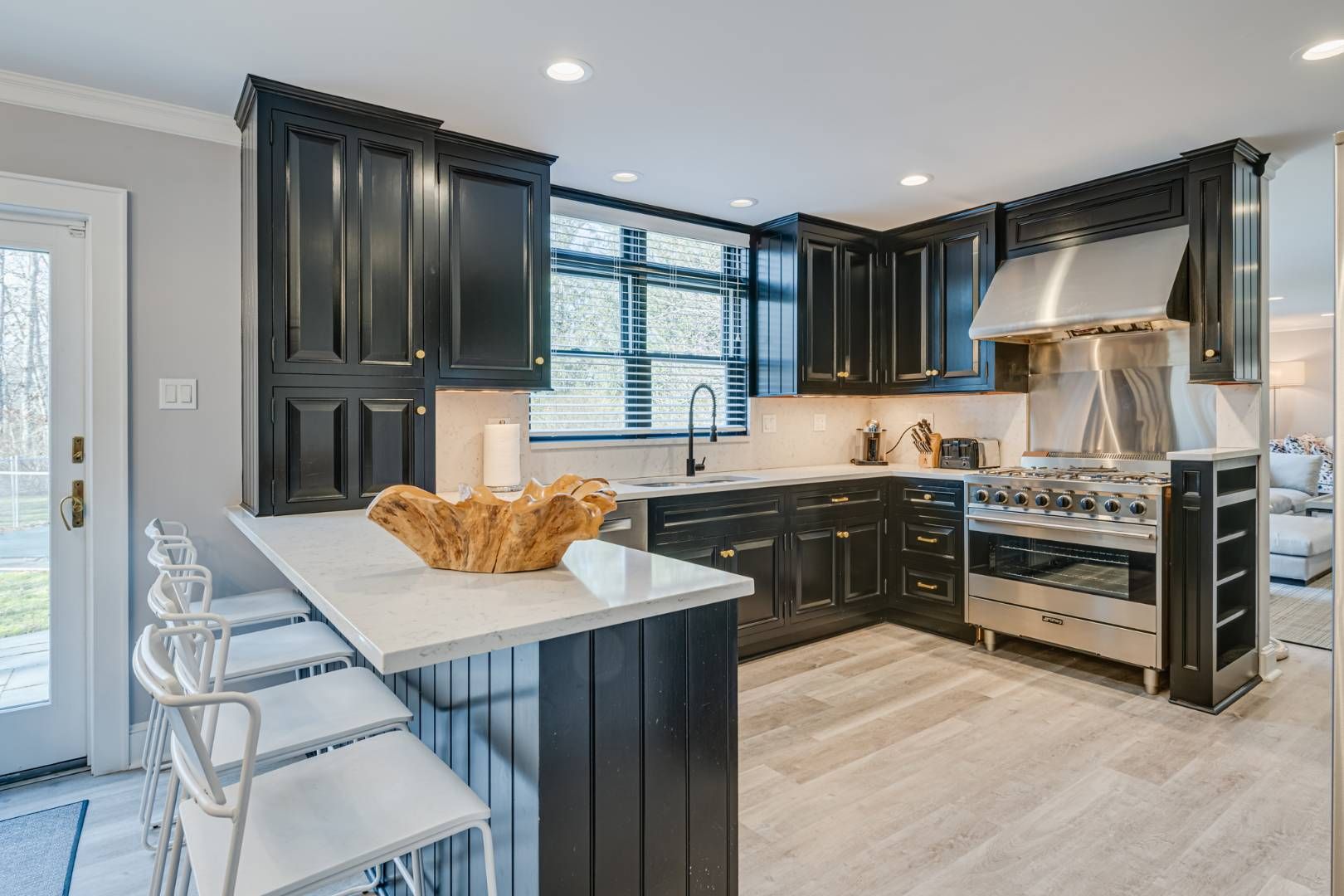 On a flag lot off a quiet street in Springs, this two-story 2,864+/- sq. ft., five bedroom, three and a half bath traditional built in 1992 has been extensively renovated in recent years, with many new upgrades in 2019. First floor living areas include a living room with fireplace, kitchen with newly restained cherry cabinets, new Caesarstone countertops and new stainless steel appliances. A renovated guest bedroom/office features a large new