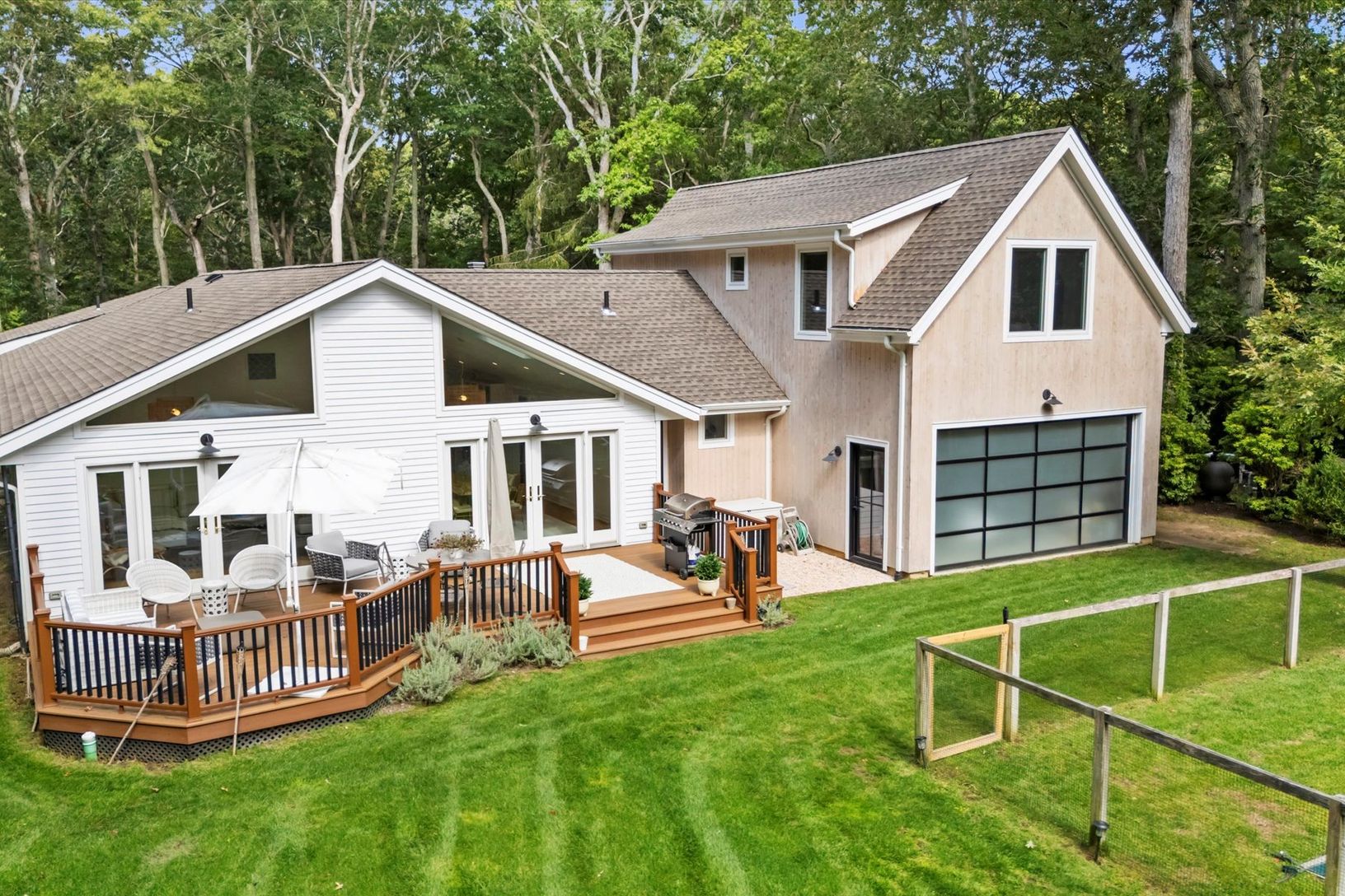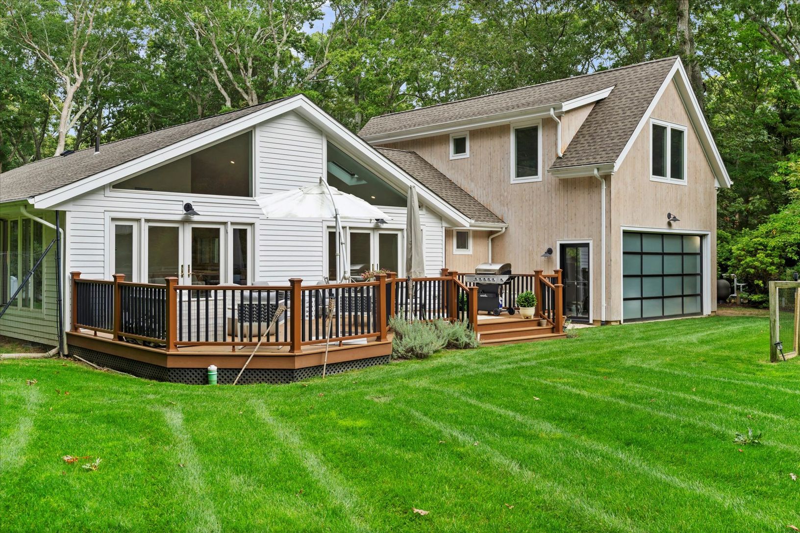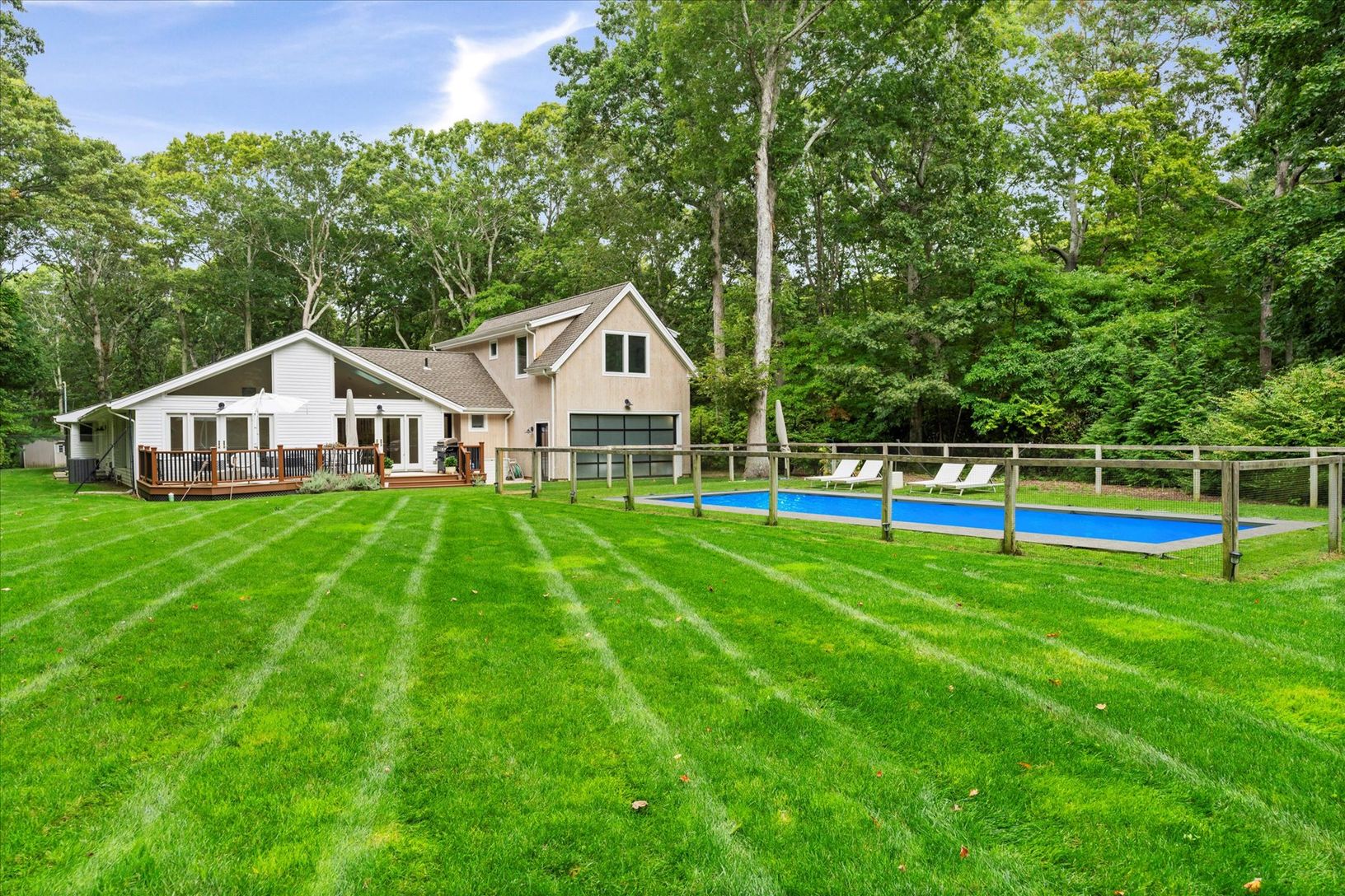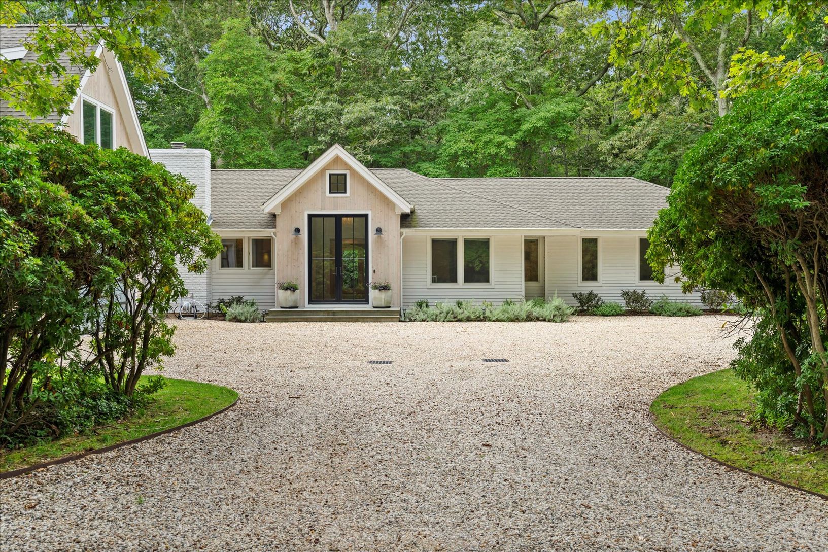 Tucked away in a serene and secluded corner of the Indian Neck Lane Community of Peconic, this stunning, state of the art modern residence offers the perfect balance of privacy, sophistication, and functionality. The manicured landscaping, accented by partial wooded surroundings, creates a park-like setting ideal for relaxation and entertaining. A welcoming foyer with French glass doors opens to an airy open-concept layout featuring soaring ce