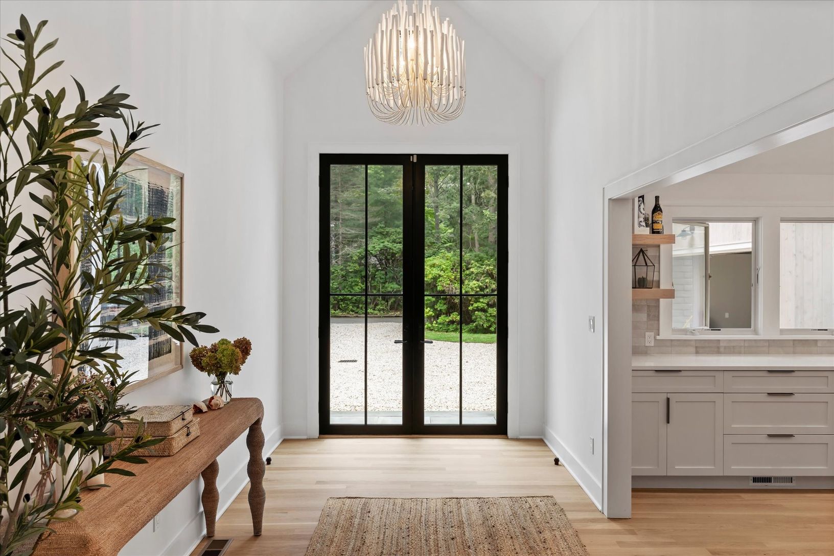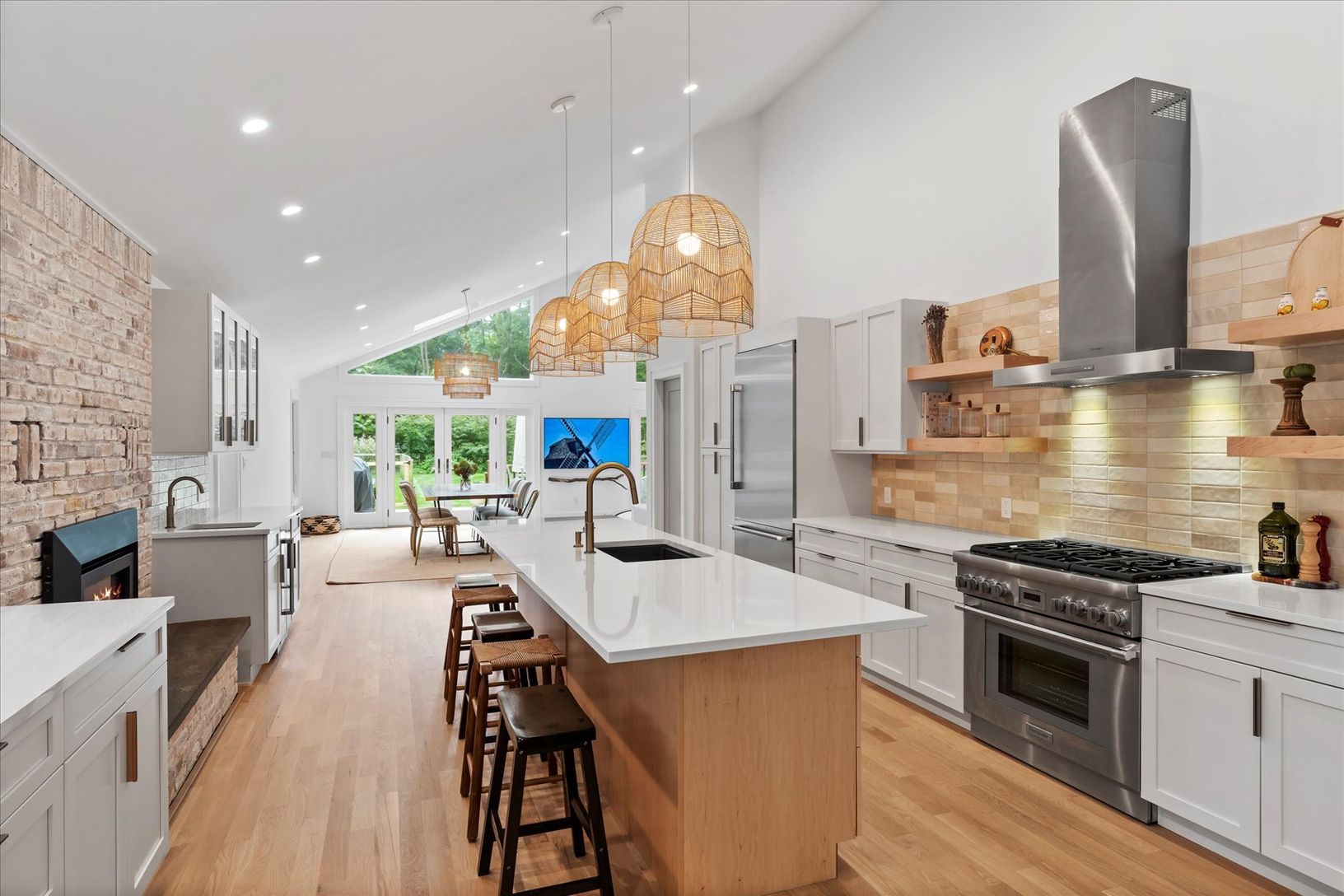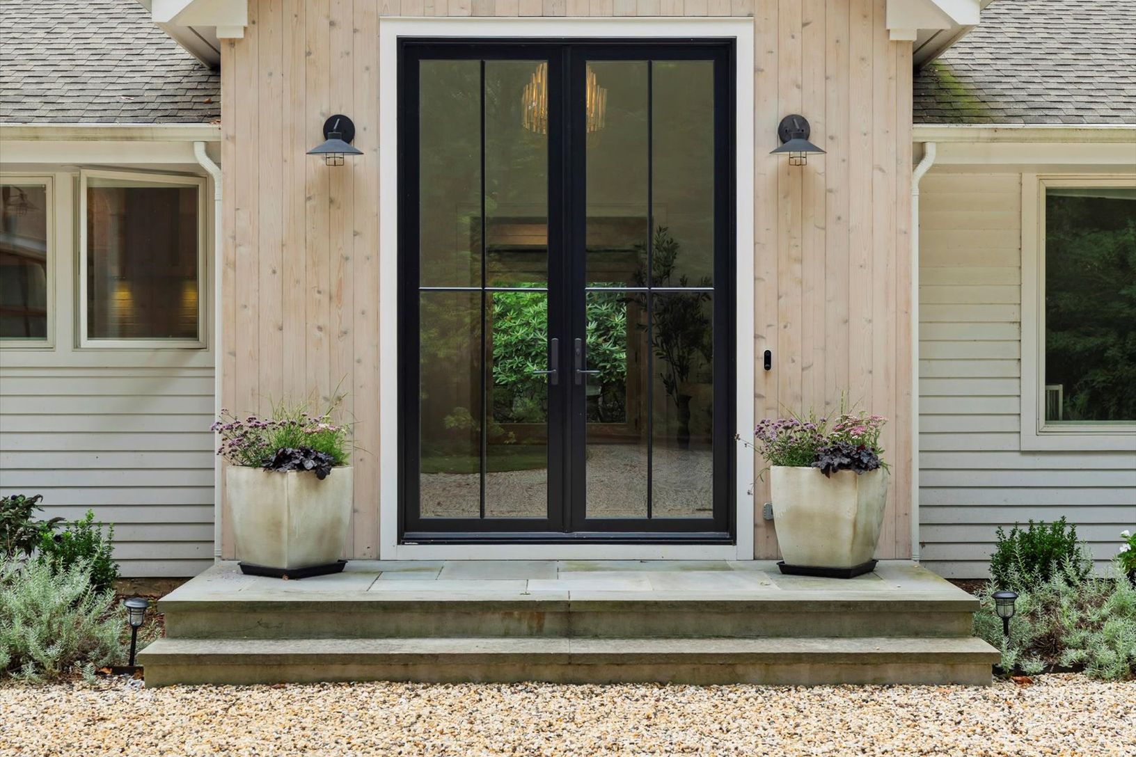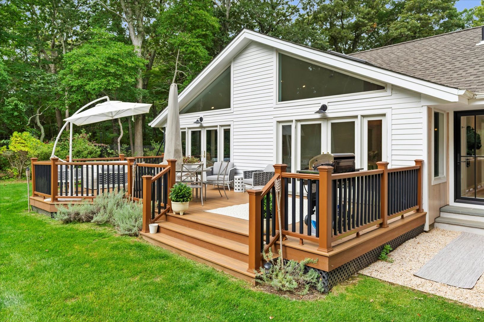 Tucked away in a serene and secluded corner of the Indian Neck Lane Community of Peconic, this stunning, state of the art modern residence offers the perfect balance of privacy, sophistication, and functionality. The manicured landscaping, accented by partial wooded surroundings, creates a park-like setting ideal for relaxation and entertaining. A welcoming foyer with French glass doors opens to an airy open-concept layout featuring soaring ce
