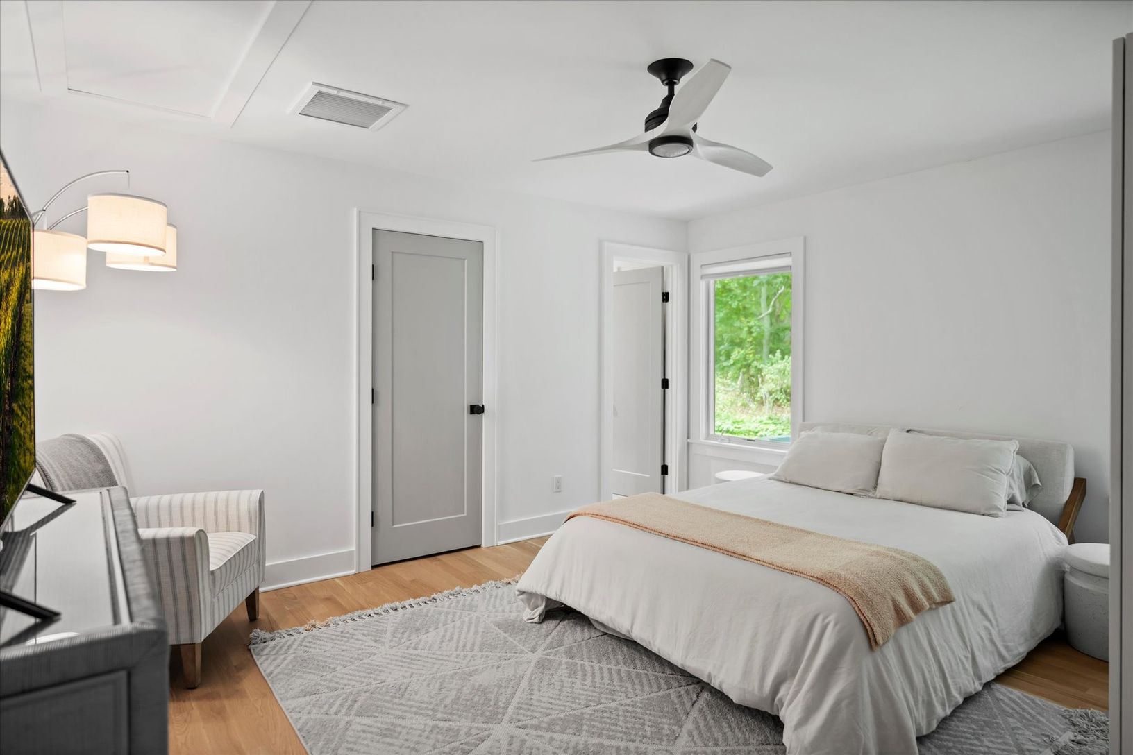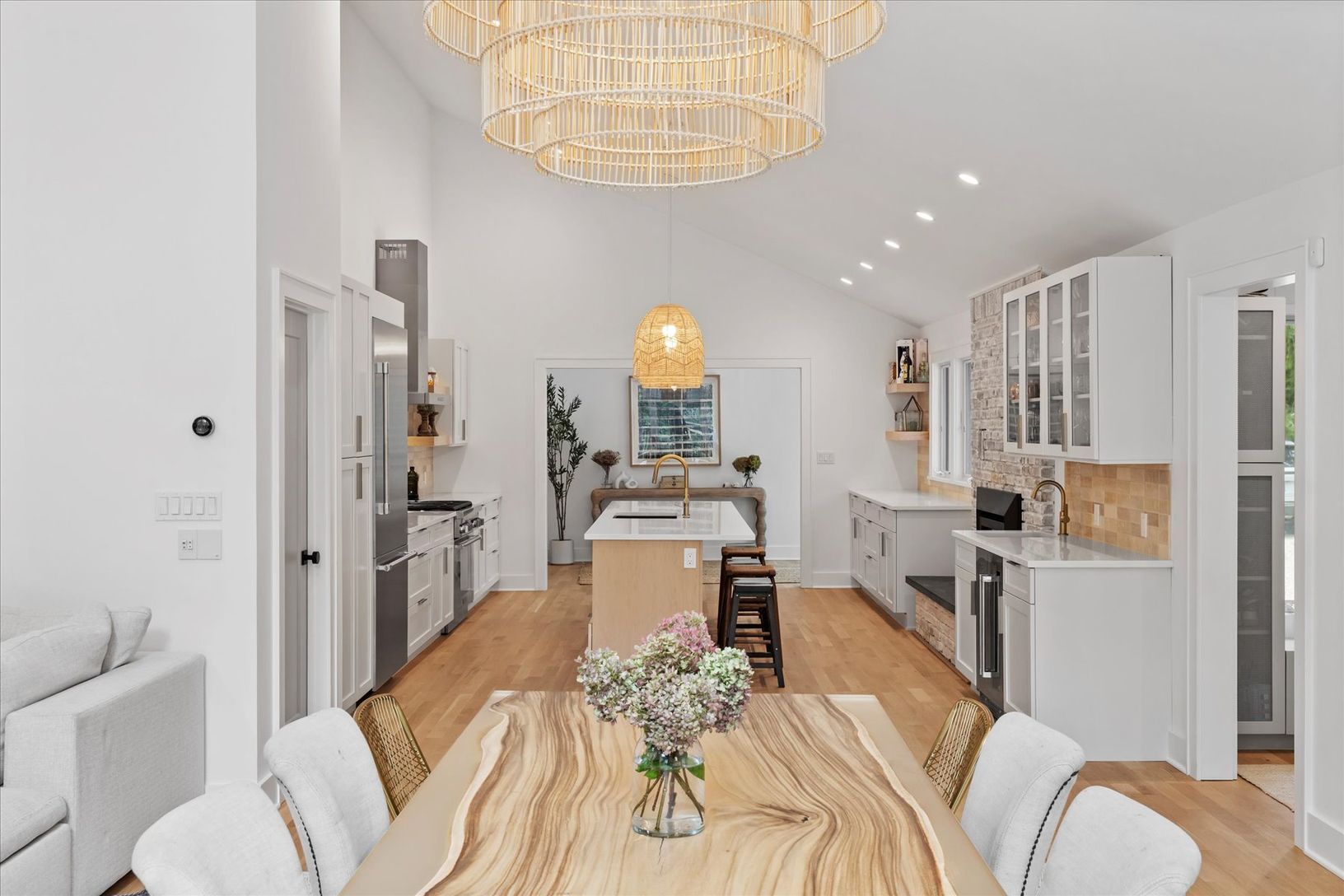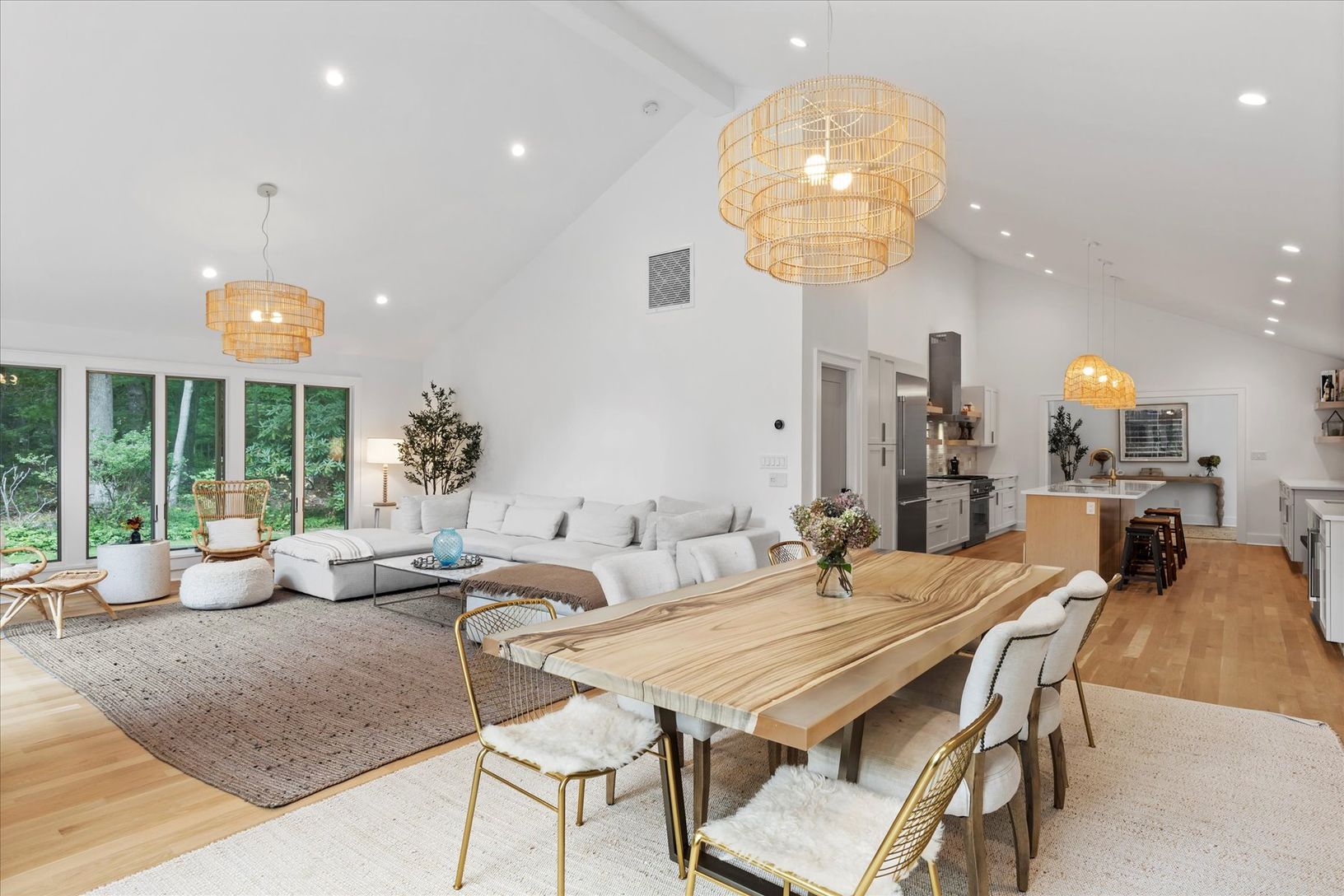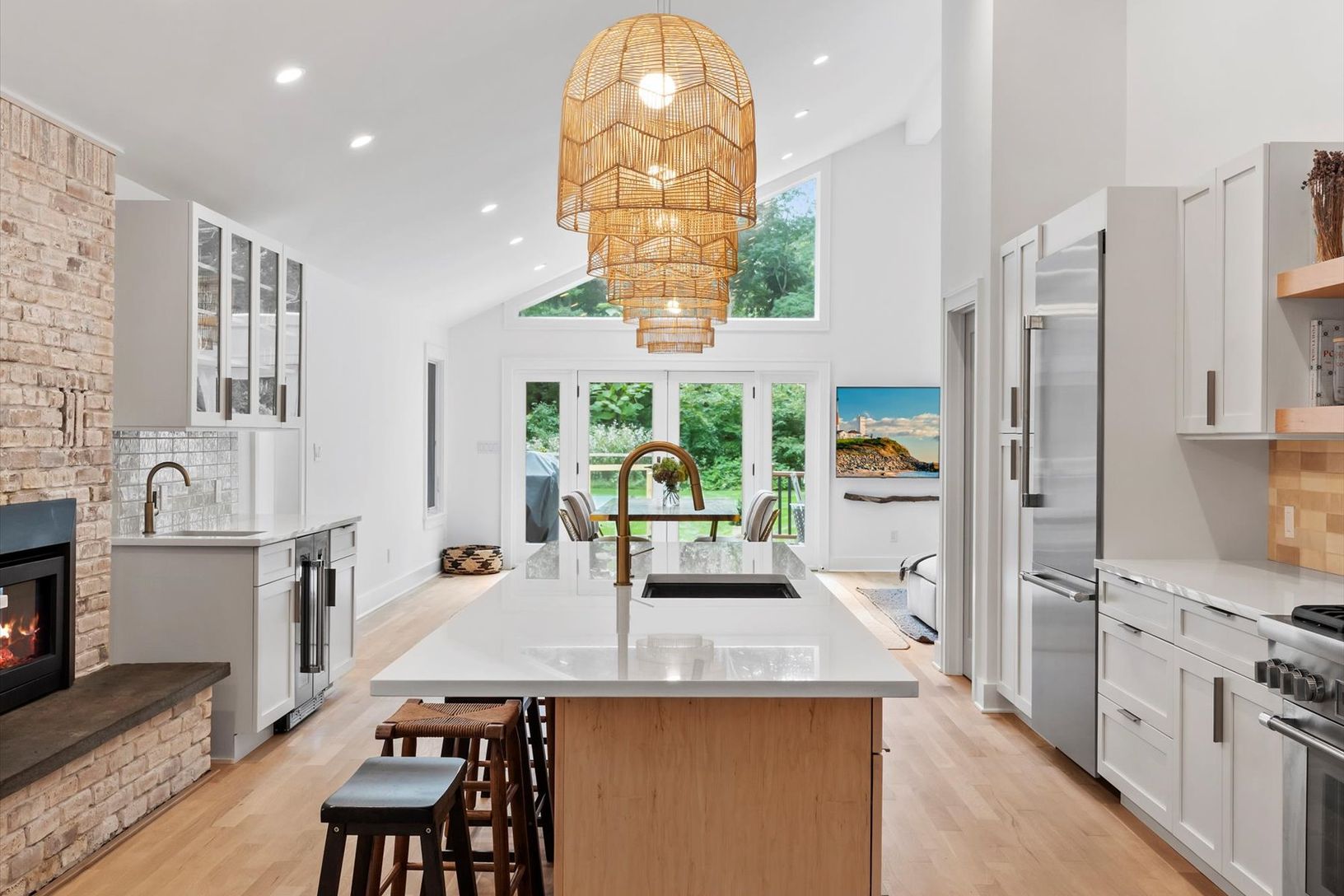 Tucked away in a serene and secluded corner of the Indian Neck Lane Community of Peconic, this stunning, state of the art modern residence offers the perfect balance of privacy, sophistication, and functionality. The manicured landscaping, accented by partial wooded surroundings, creates a park-like setting ideal for relaxation and entertaining. A welcoming foyer with French glass doors opens to an airy open-concept layout featuring soaring ce
