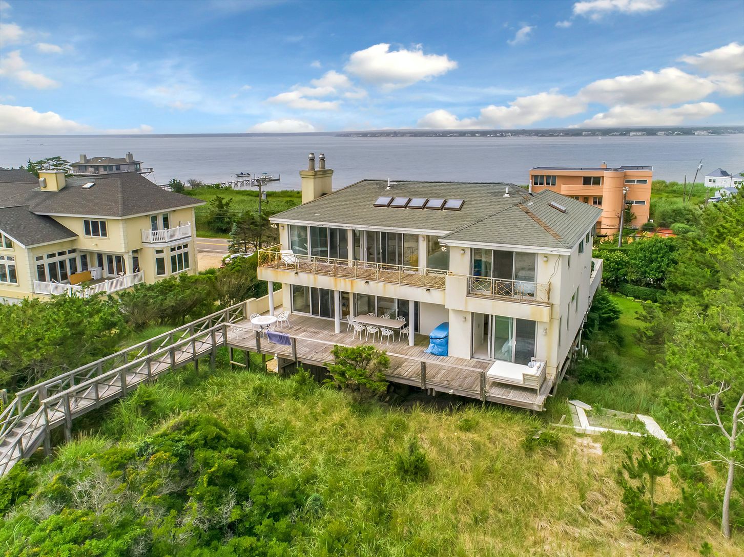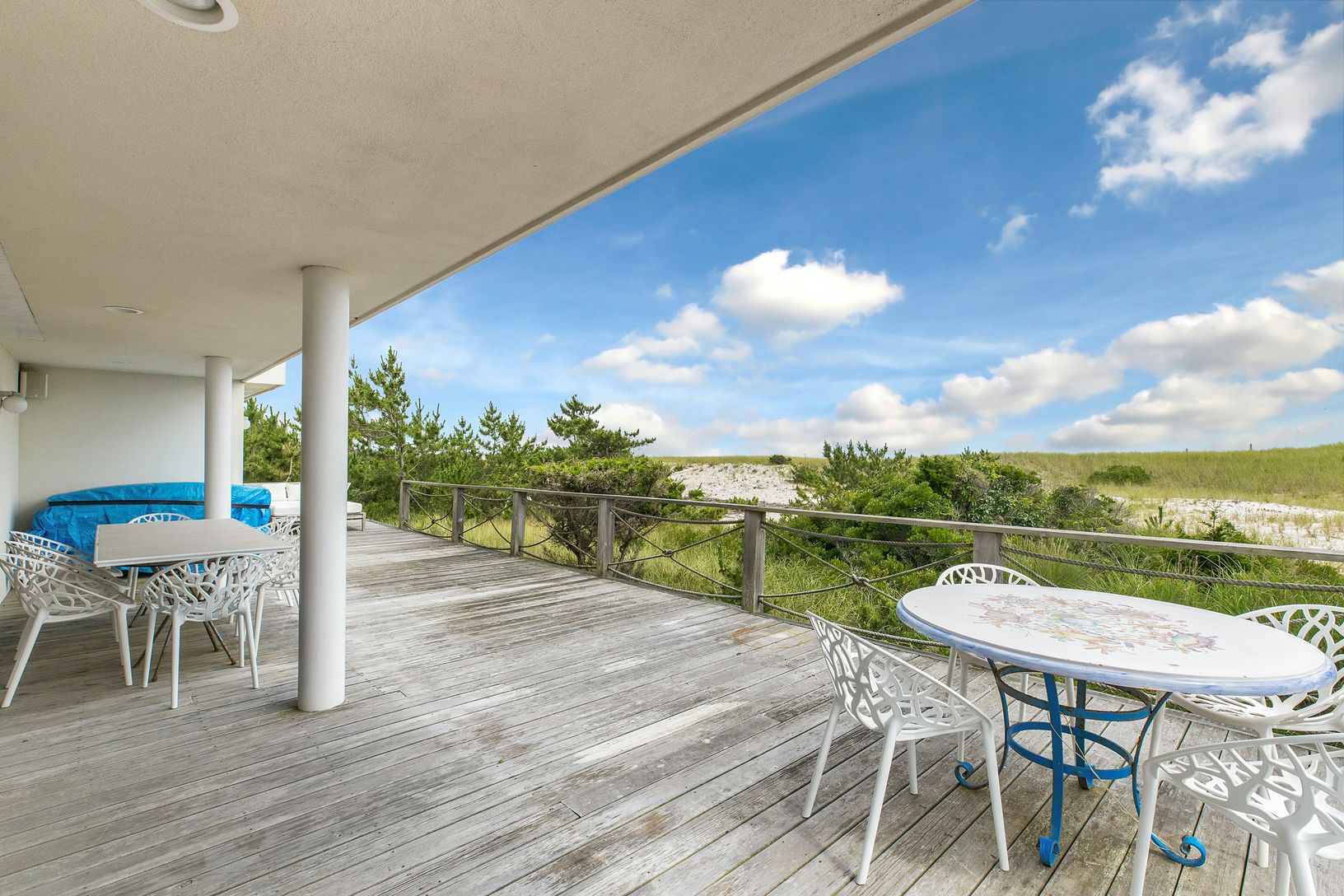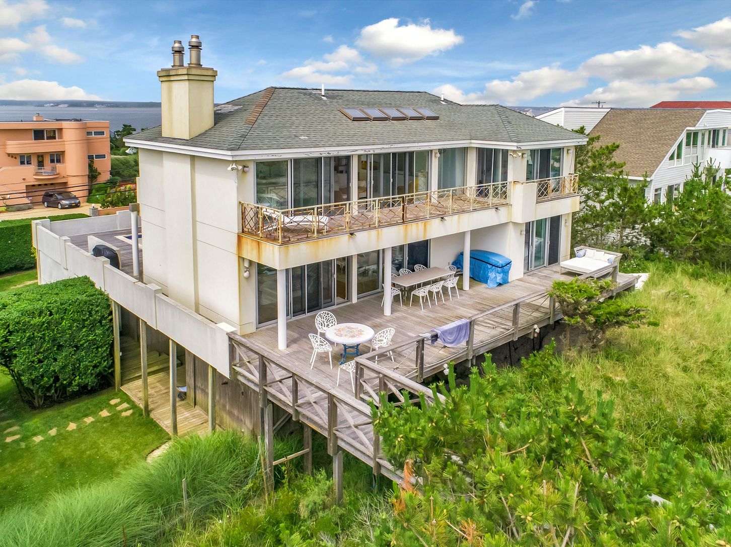 Nestled in the Ocean Dunes in Westhampton is this stunning contemporary oceanfront home. Entering this residence, you are welcomed by stunning views from numerous levels throughout this home of the Atlantic ocean beach and Moriches bay. The main level offers an open living and dining area with dual wide opening sliders that bring the ocean and the bay right into your living space. The kitchen area over looks the gunite pool with expansive v