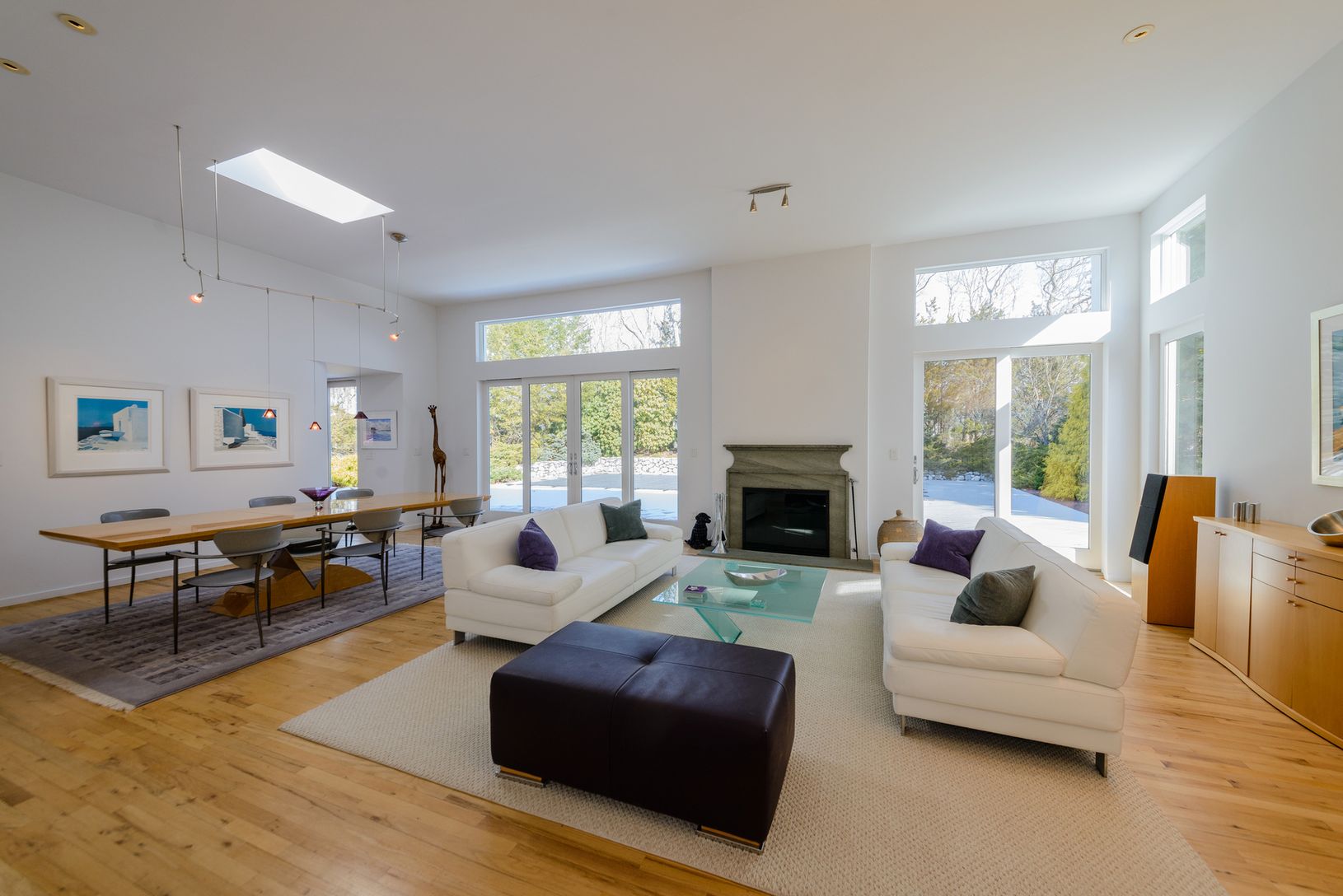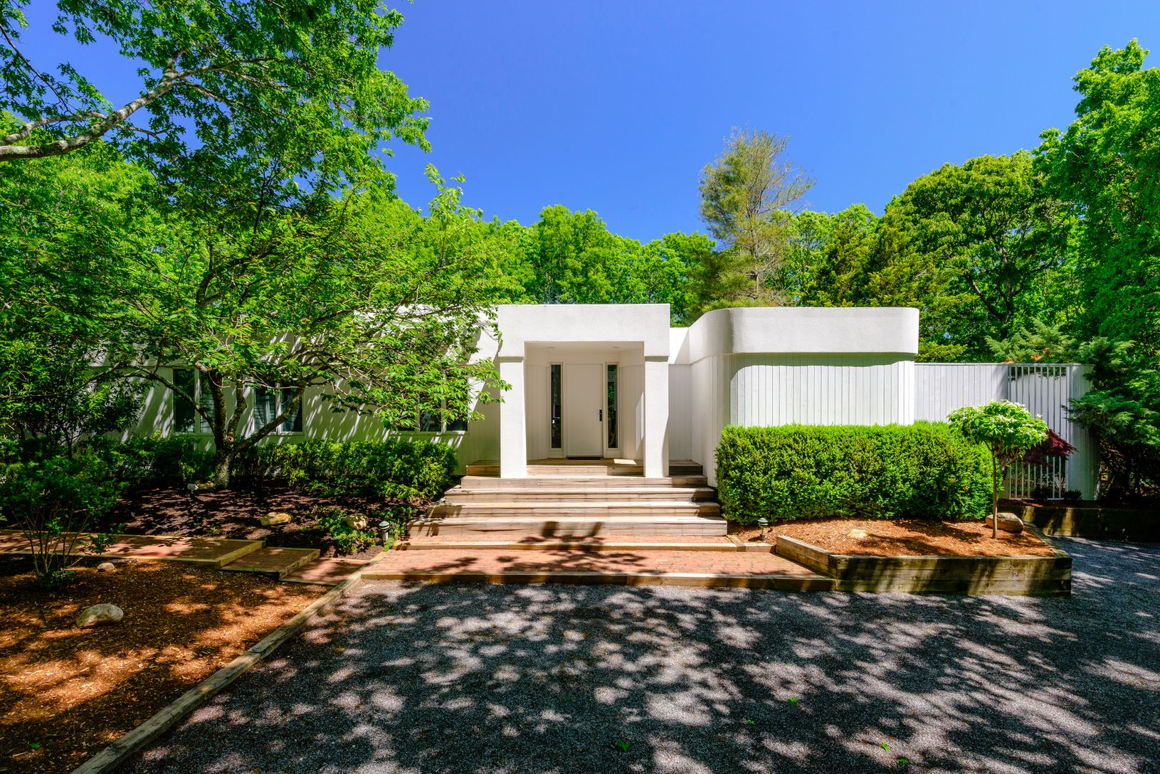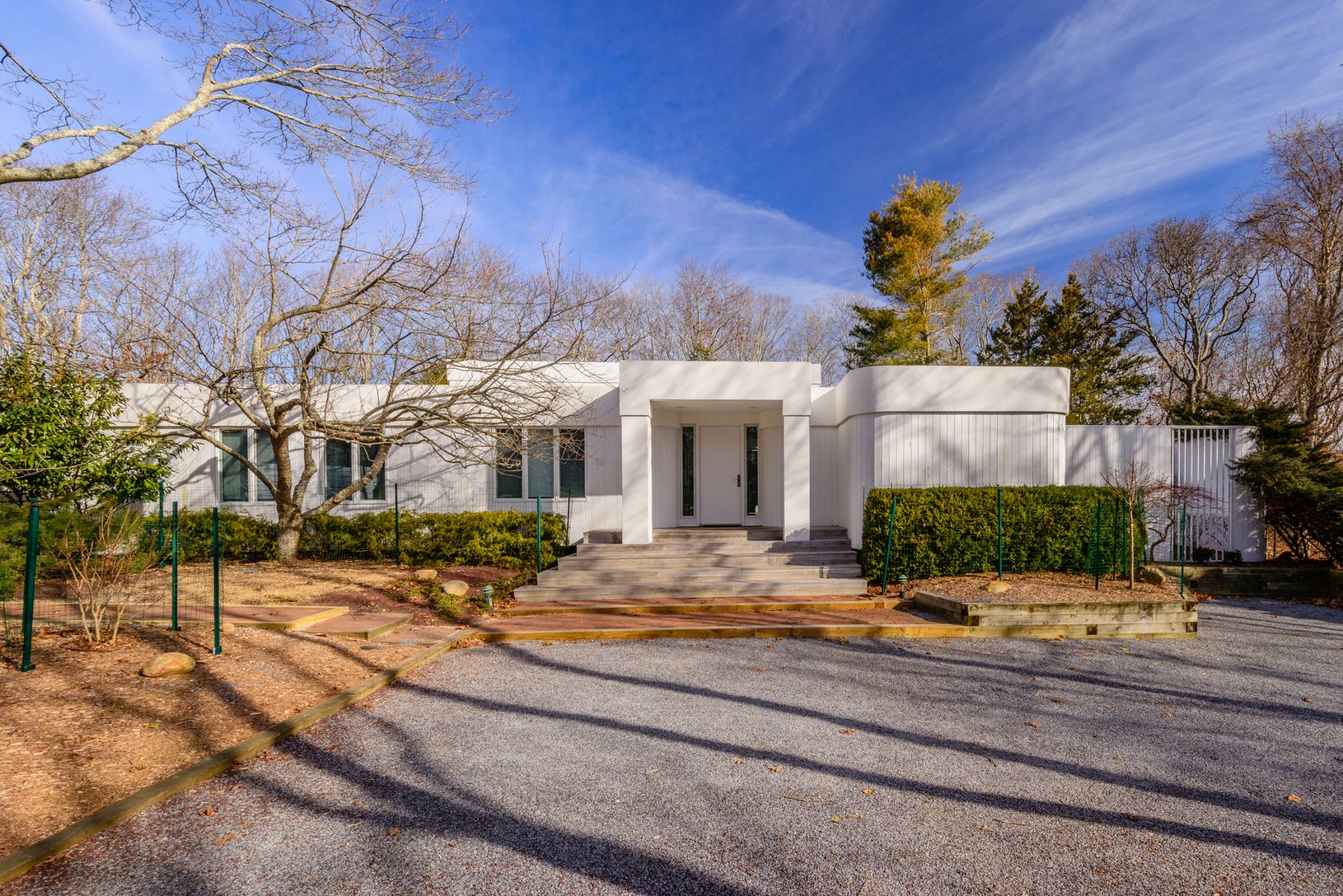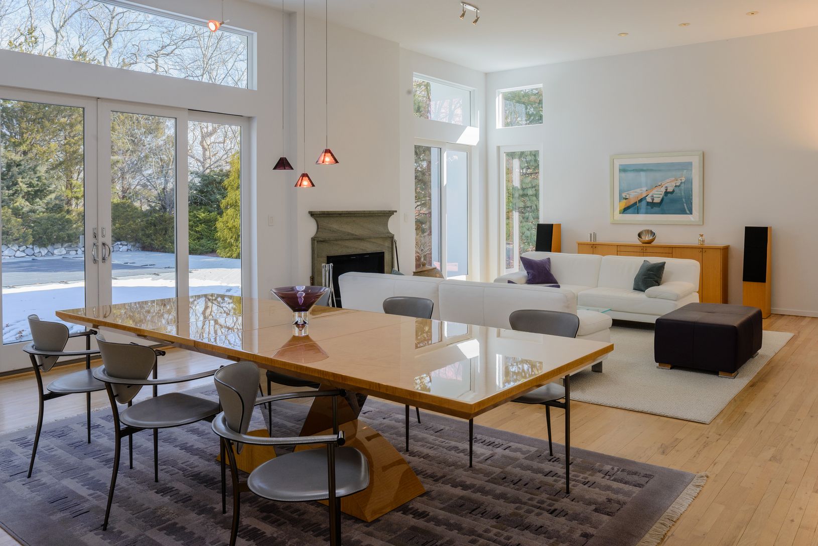 With double height ceilings and walls of glass doors topped by clerestory windows this chic, perfectly immaculate and completely private modern home offers a serene escape. Features include open light -filled living/dining room with fireplace and open view of the grounds, gourmet eat-in kitchen with center island and curved glass wall surrounding the dining area, top-of-the-line custom built-ins throughout, first floor master suite, 2 addition