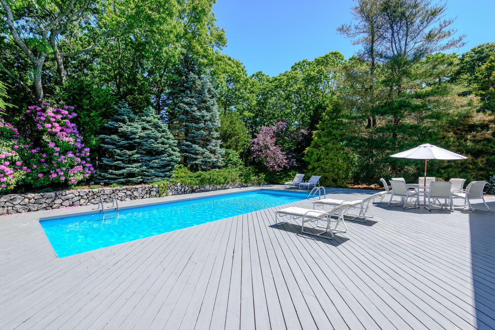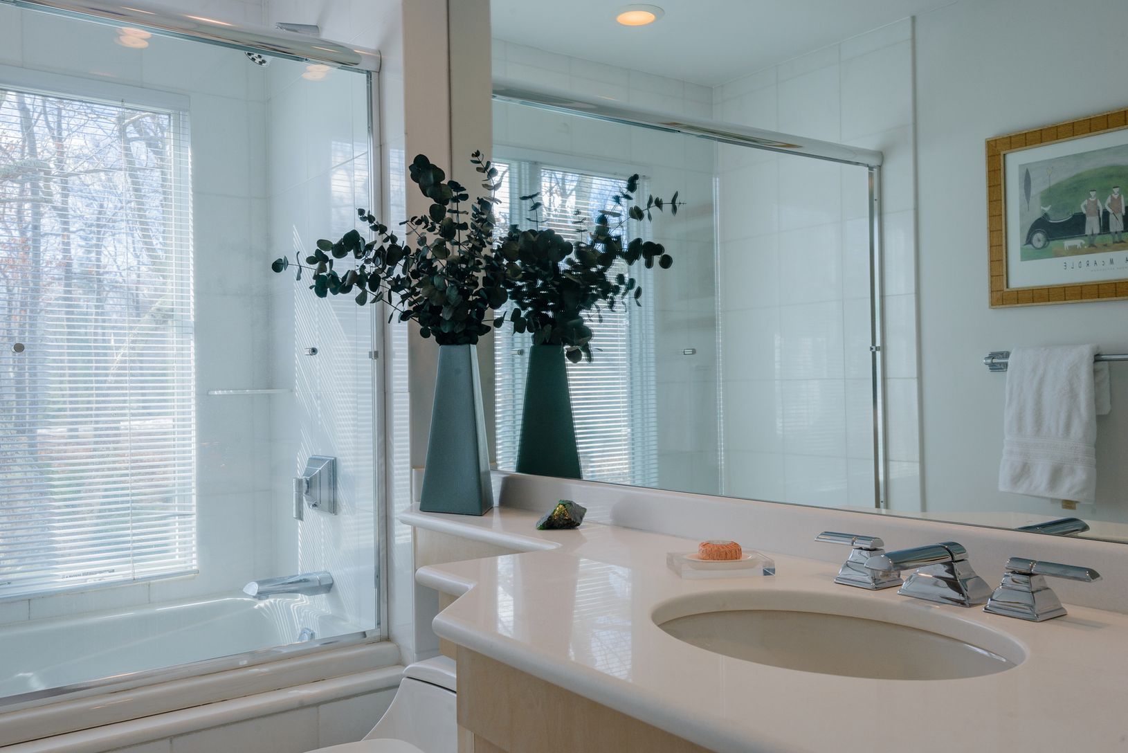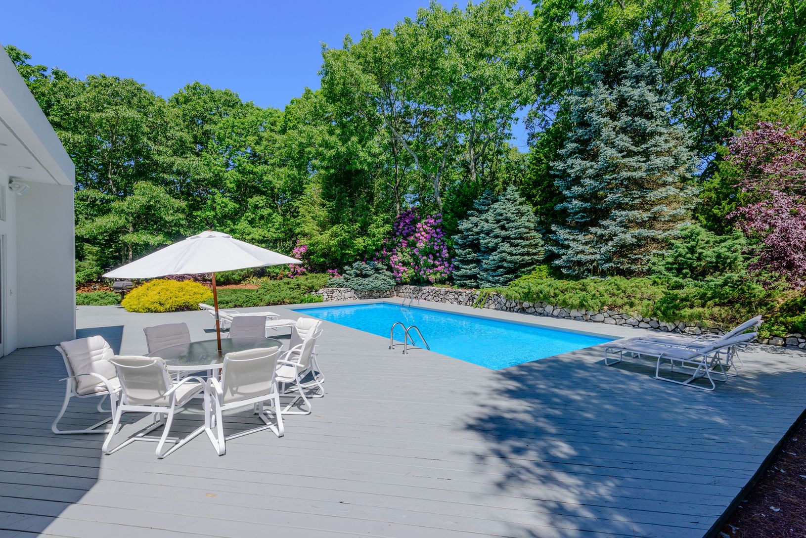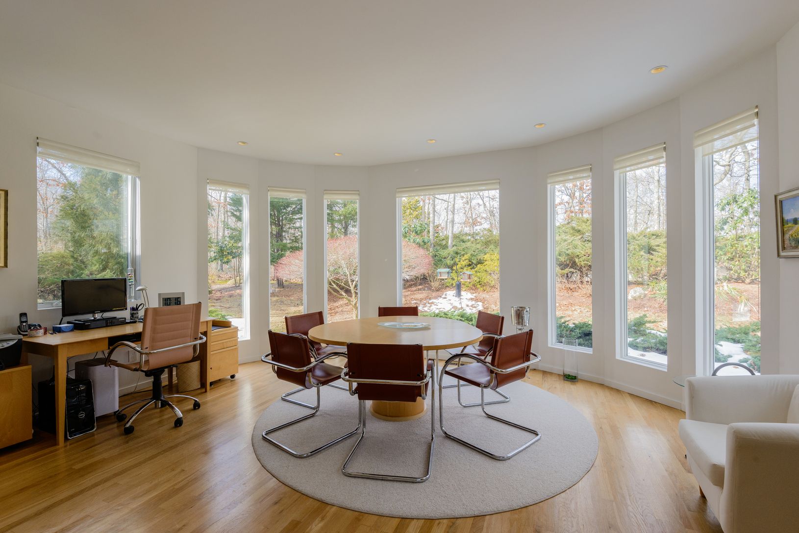 With double height ceilings and walls of glass doors topped by clerestory windows this chic, perfectly immaculate and completely private modern home offers a serene escape. Features include open light -filled living/dining room with fireplace and open view of the grounds, gourmet eat-in kitchen with center island and curved glass wall surrounding the dining area, top-of-the-line custom built-ins throughout, first floor master suite, 2 addition