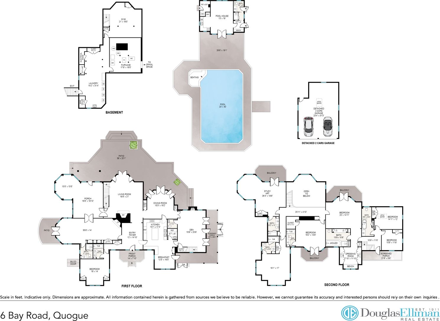 Welcome to 6 Bay Road, a seven bedroom, eight- and one-half bathroom Estate like no other, mixing old-world charm with modern day living and amenities, in the village of Quogue. Sited on 2 acres, sprawling from Bay Road to Heatherwood Lane, no attention to detail has been spared in this statuesque 8,800 +/- sq.ft. shingle-style fortress. Upon entering the gated compound, the lush landscape and specimen-tree-lined drive lead to the grand entran