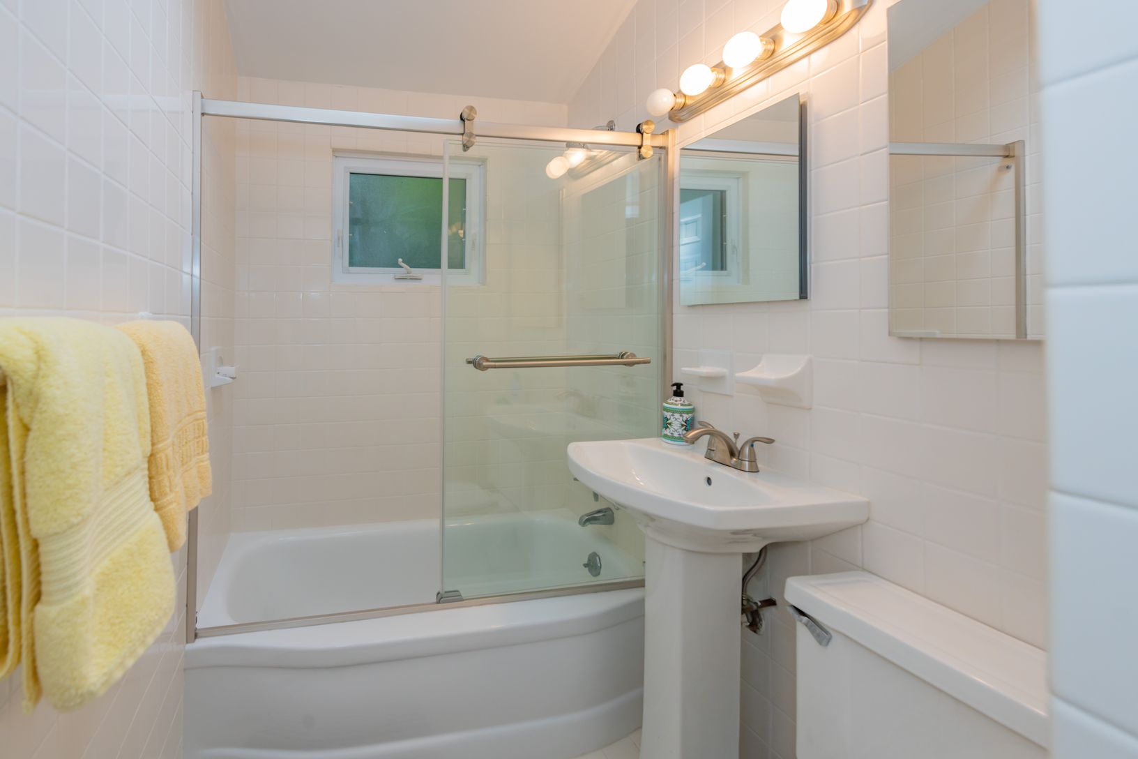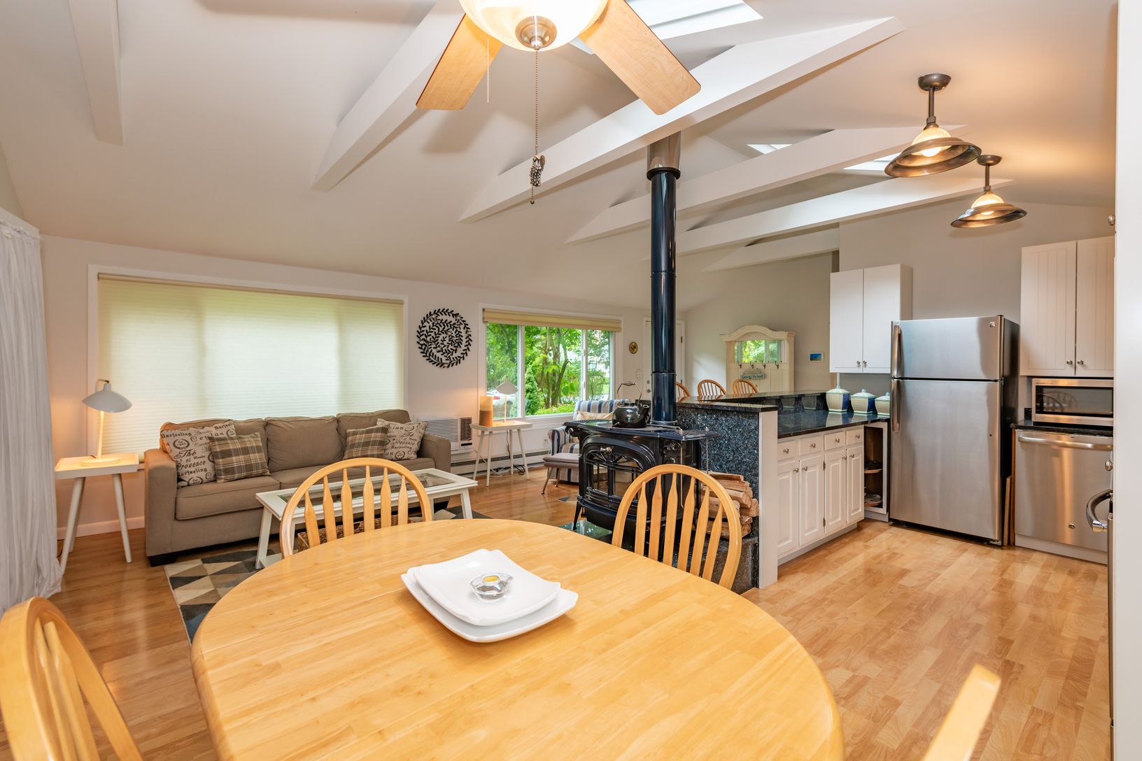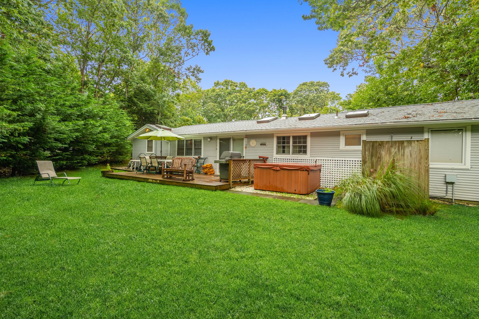 Newly renovated three Bedroom two bathrooms is just 1 1/2 blocks distance to the Peconic bay beach. This home offers beautiful cathedral high ceilings, with skylights throughout allowing the sunlight to shine inside the house. A large master bedroom with a separate additional sitting area (Den) used as another bedroom it has a sizeable sofa that turns into a queen-size bed. The bathrooms have been renovated and have skylights, and the laundry