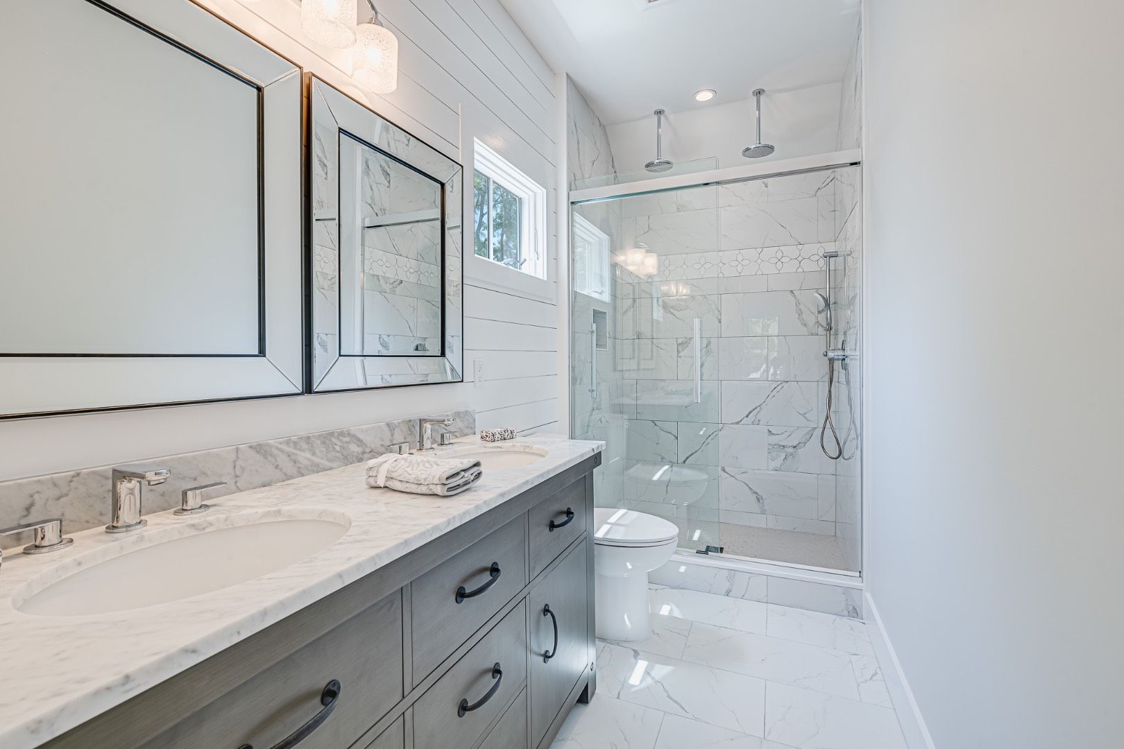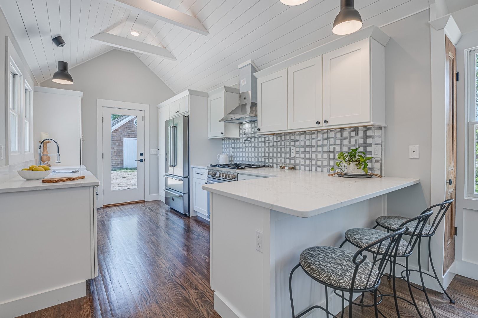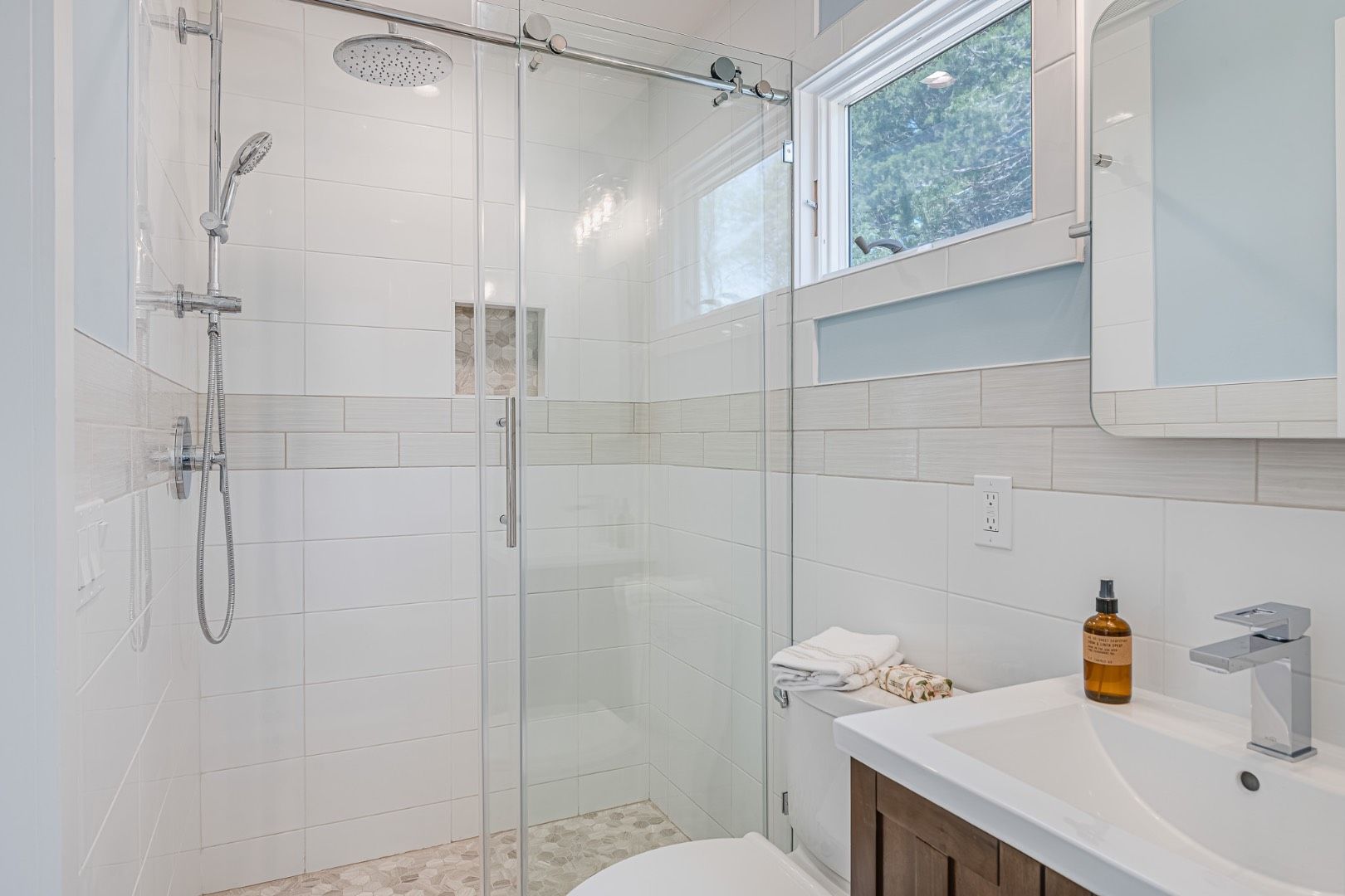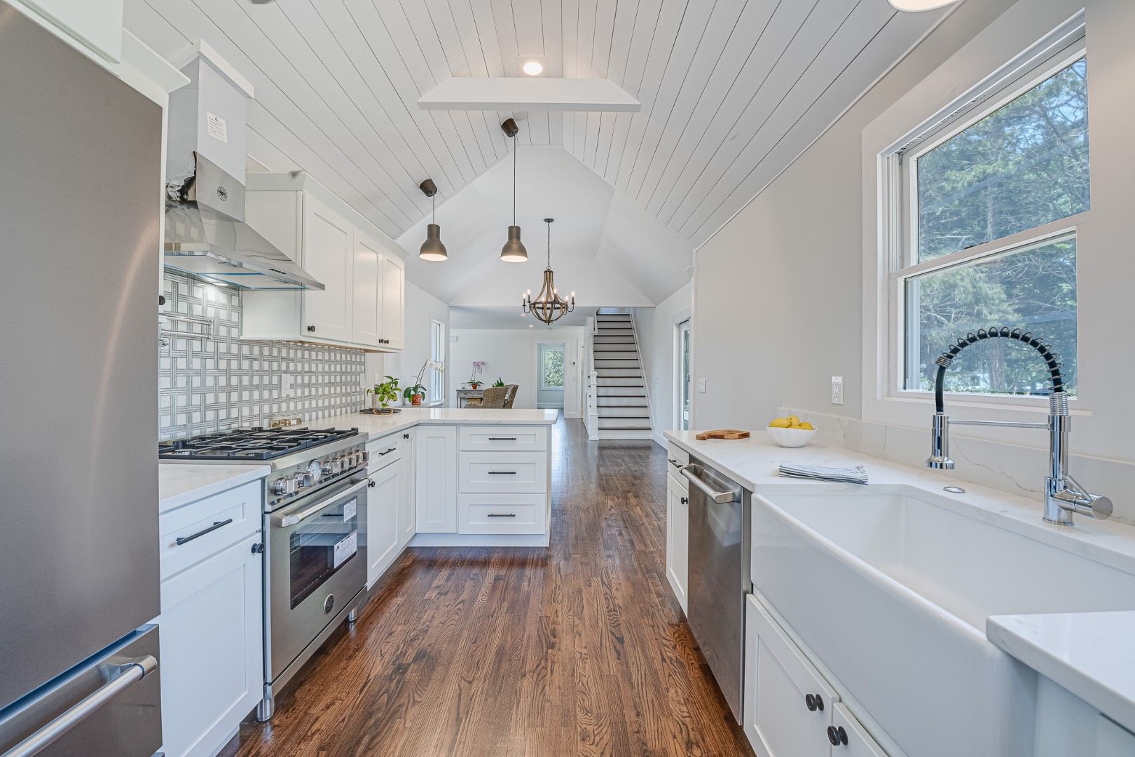 This light-filled, stylish 3 Bed 3 Bath Hamptons farmhouse has been completely renovated for 21st century living. Enter to bright, open living spaces with shiplap walls and rich dark hardwood floors - living room with gas fireplace, a large dining space with glass doors to the grounds, and eat-in kitchen with high, vaulted ceiling, counter seating, quartzite countertops, high end stainless European appliances including a gas range. The first-f