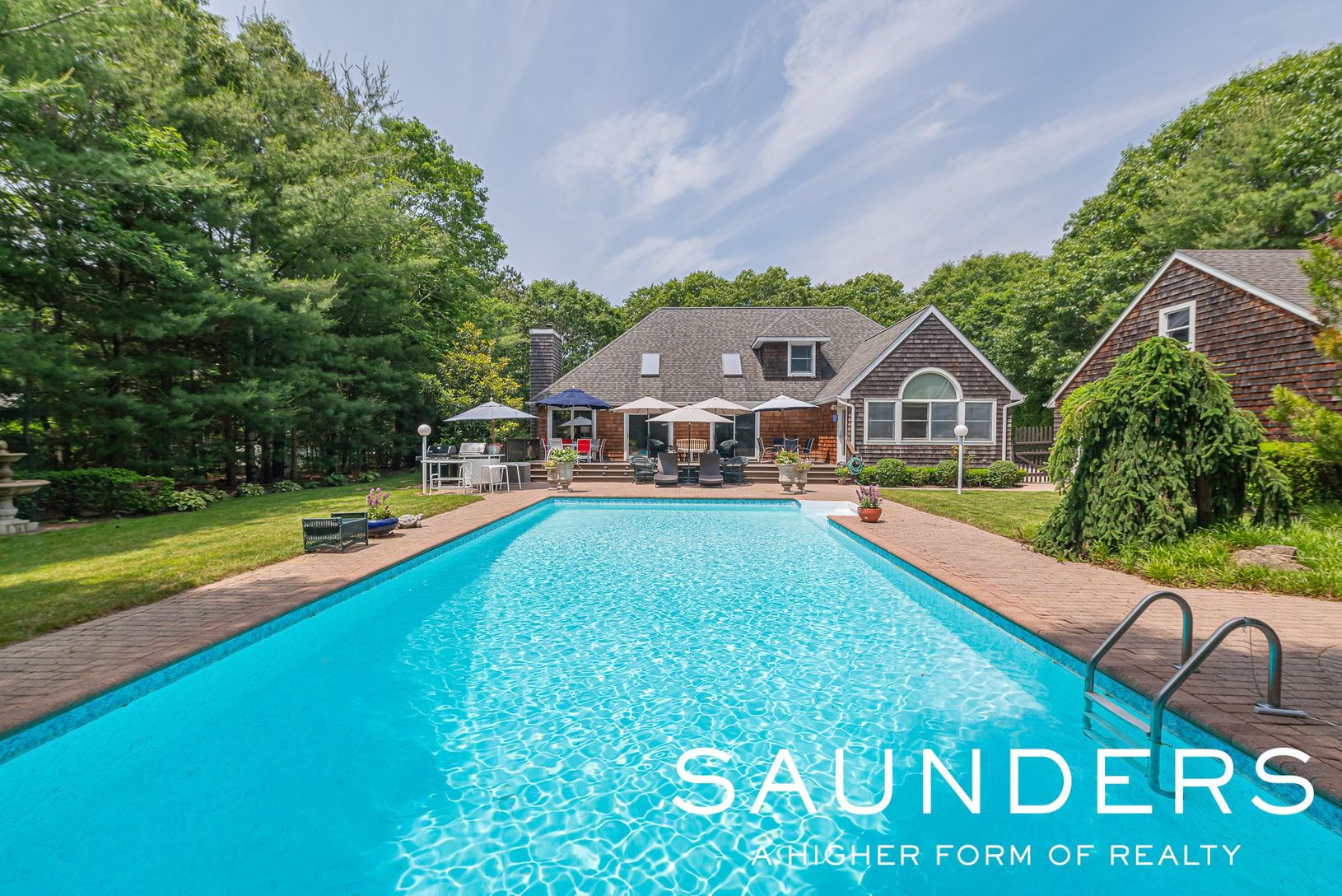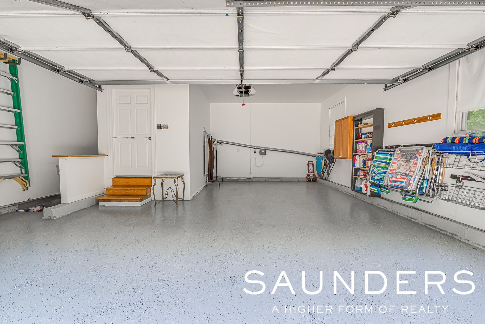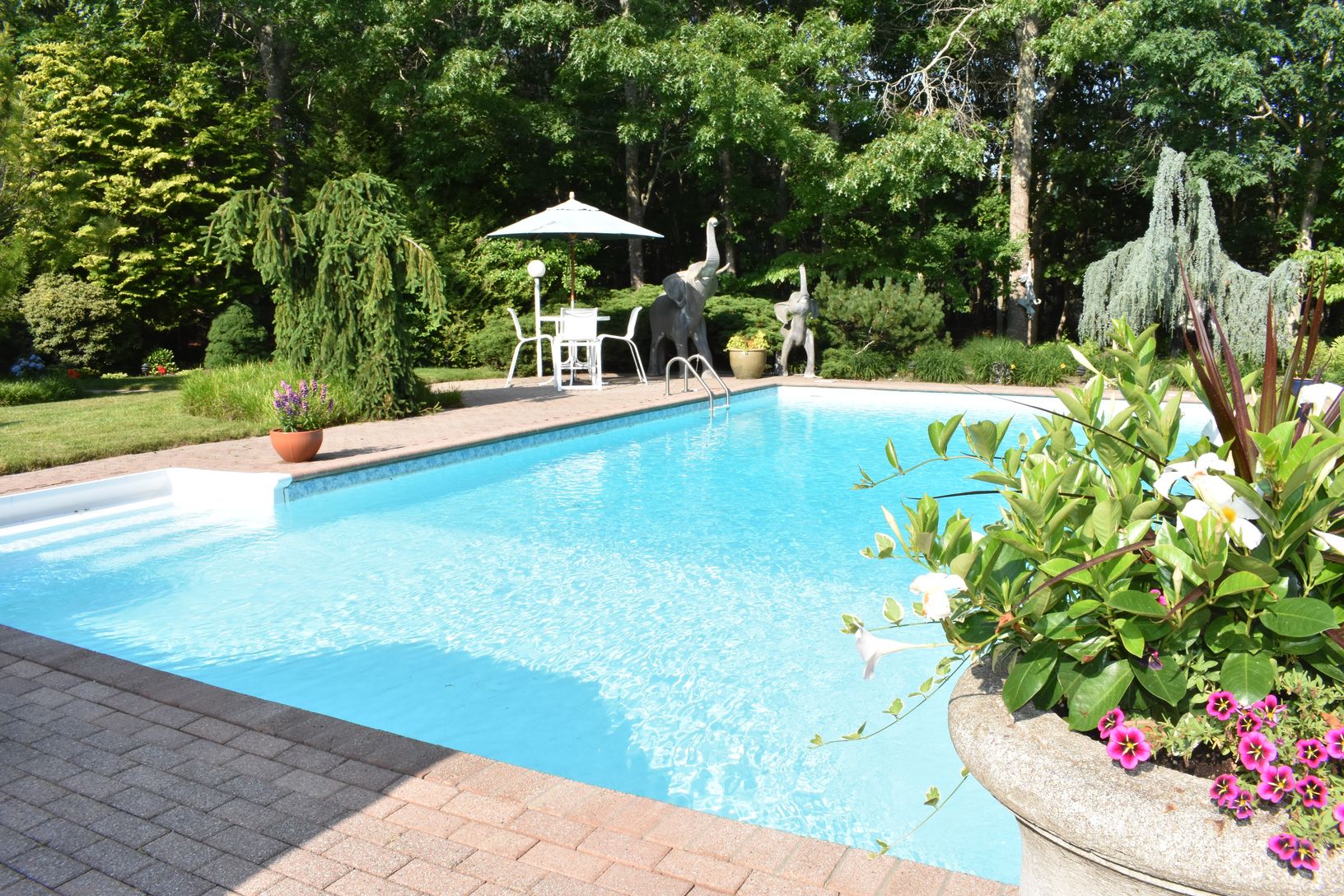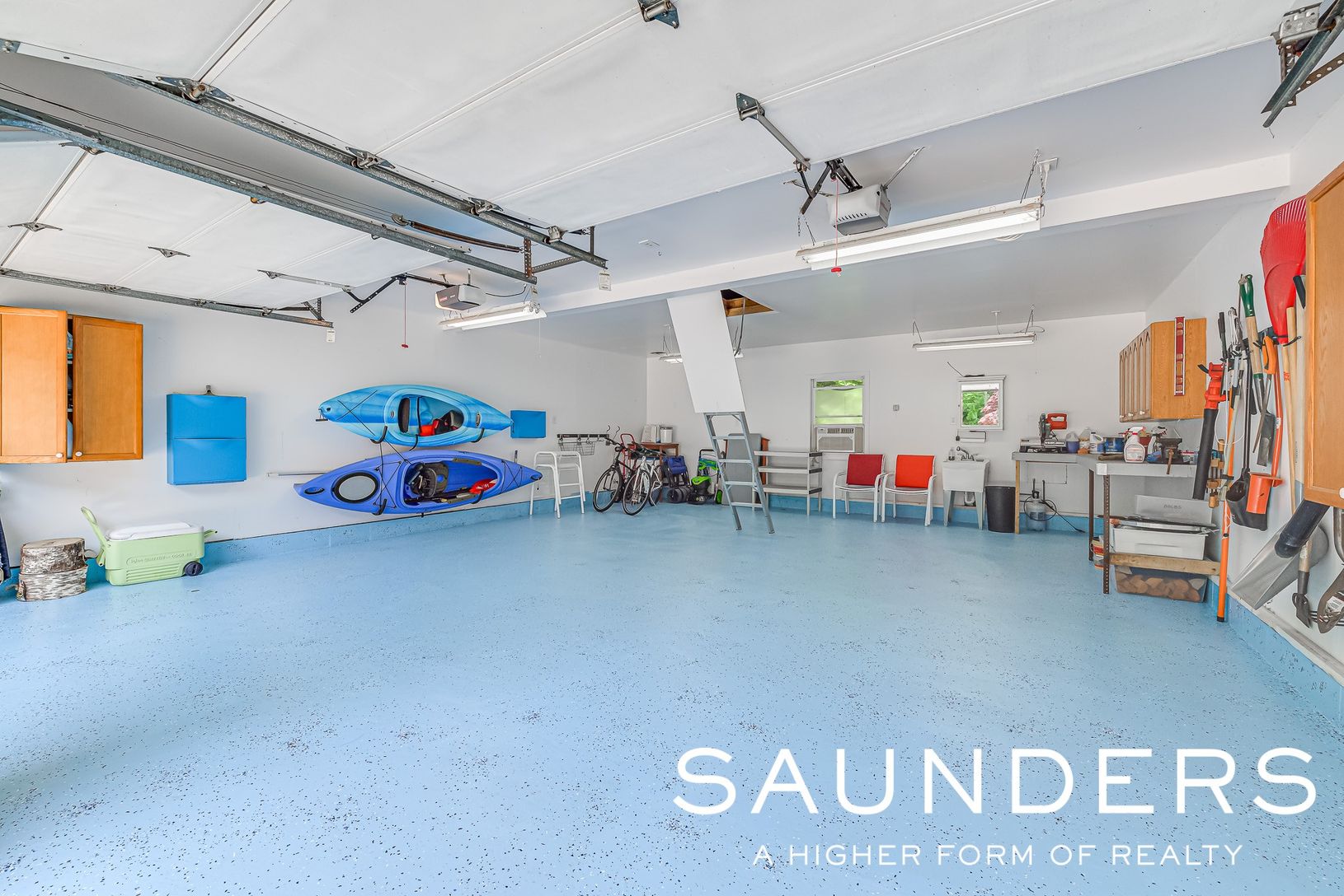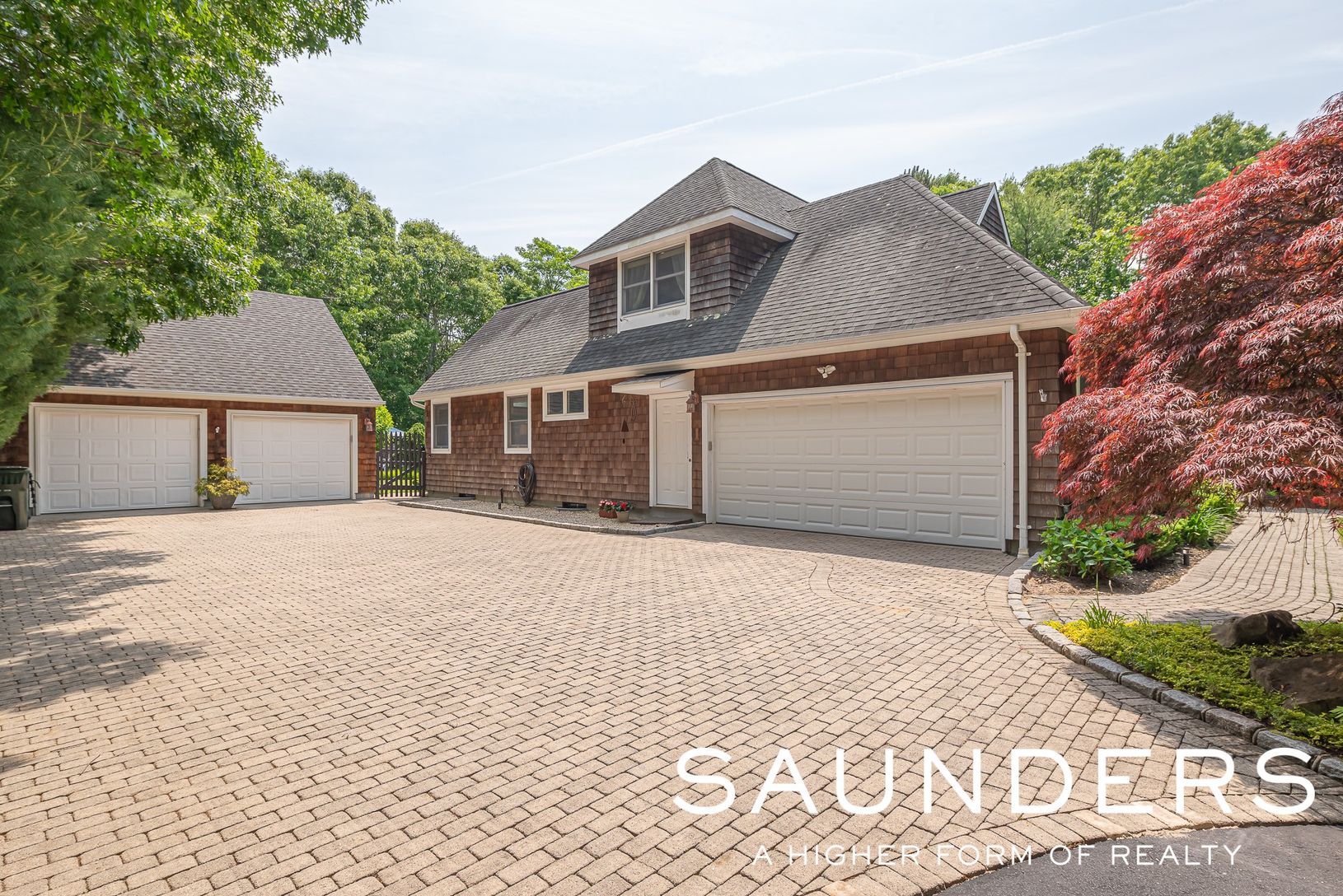 Nestled in privacy on a cul-de-sac in East Quogue, this Hamptons retreat offers a fabulous rear yard with a heated swimming pool, paver patio, Trex deck, and beautiful landscaping with specimen trees on a wooded shy acre. The outdoor setting enjoys southeast exposure and welcomes al fresco dining and lounging. There is an extra-large 672 +/- sq. ft. detached 2-car garage with bonus storage loft above, plus an attached 1.5 car garage on the 2-s