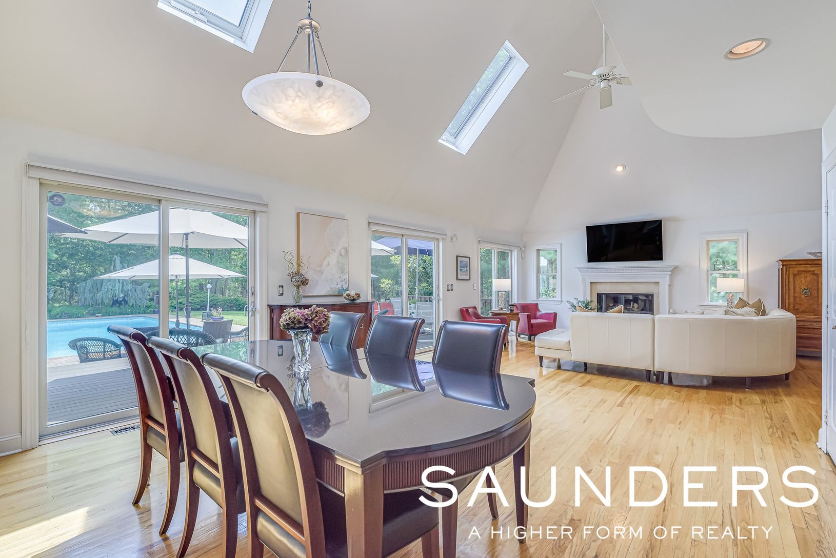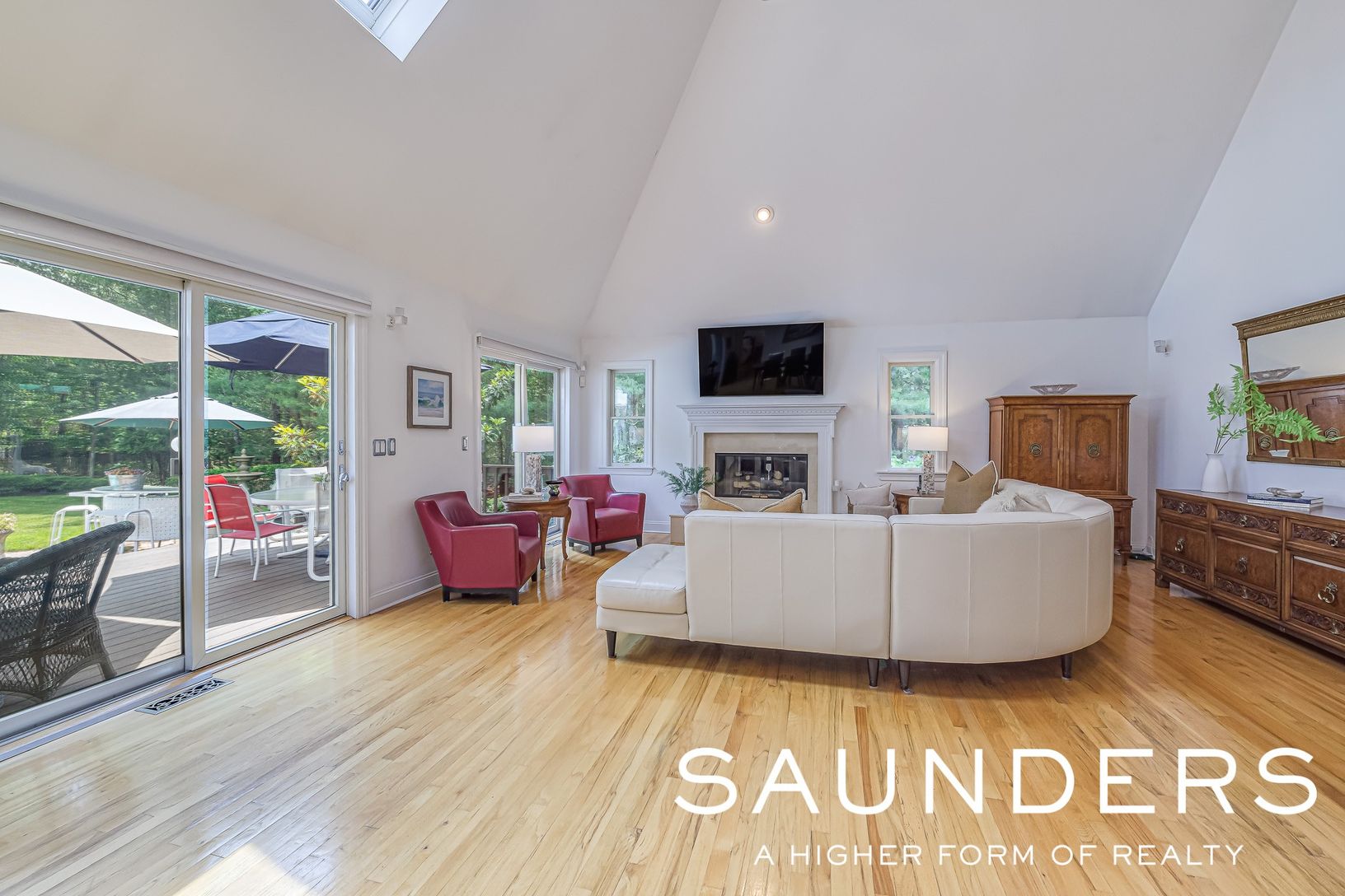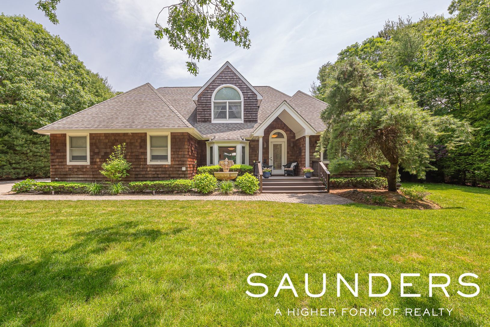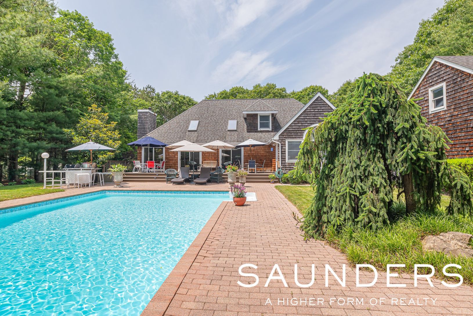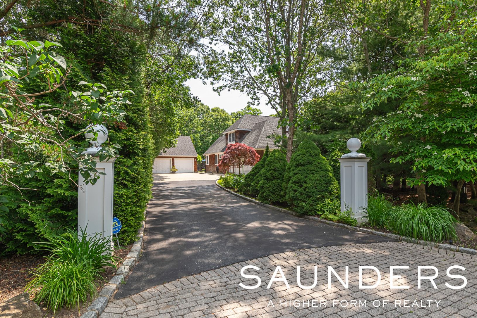 Nestled in privacy on a cul-de-sac in East Quogue, this Hamptons retreat offers a fabulous rear yard with a heated swimming pool, paver patio, Trex deck, and beautiful landscaping with specimen trees on a wooded shy acre. The outdoor setting enjoys southeast exposure and welcomes al fresco dining and lounging. There is an extra-large 672 +/- sq. ft. detached 2-car garage with bonus storage loft above, plus an attached 1.5 car garage on the 2-s