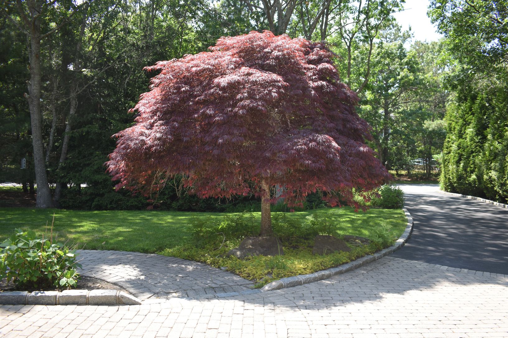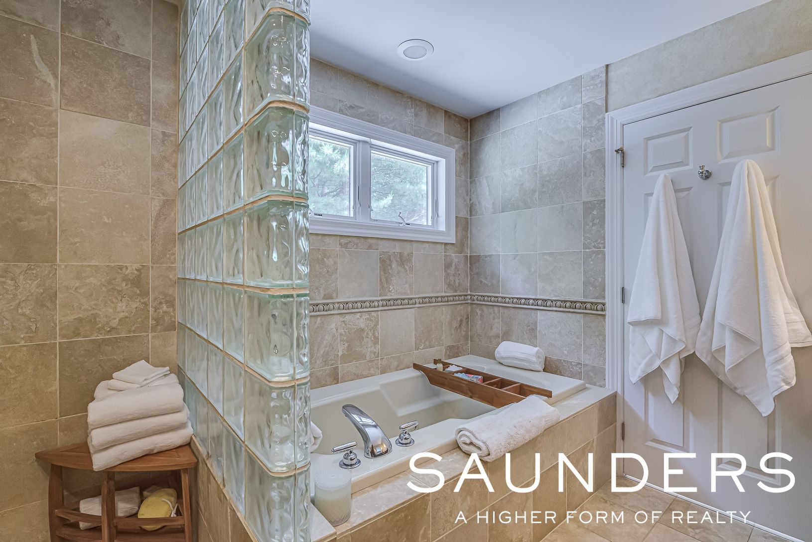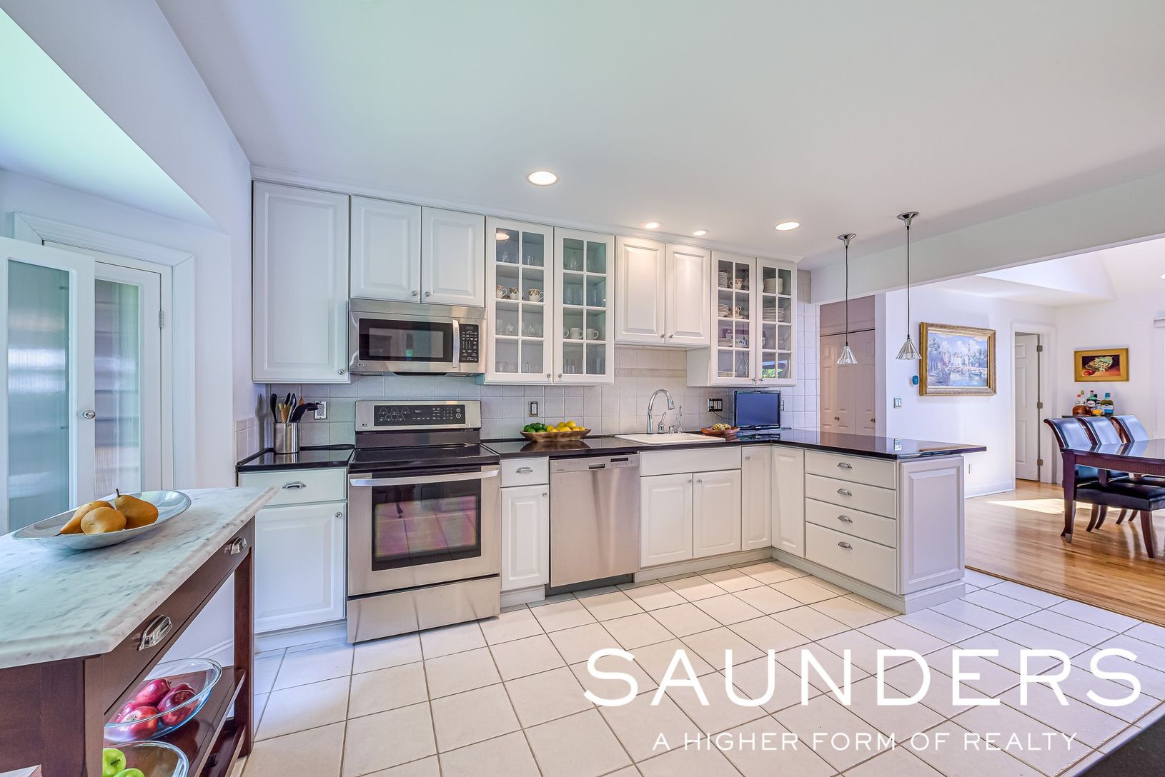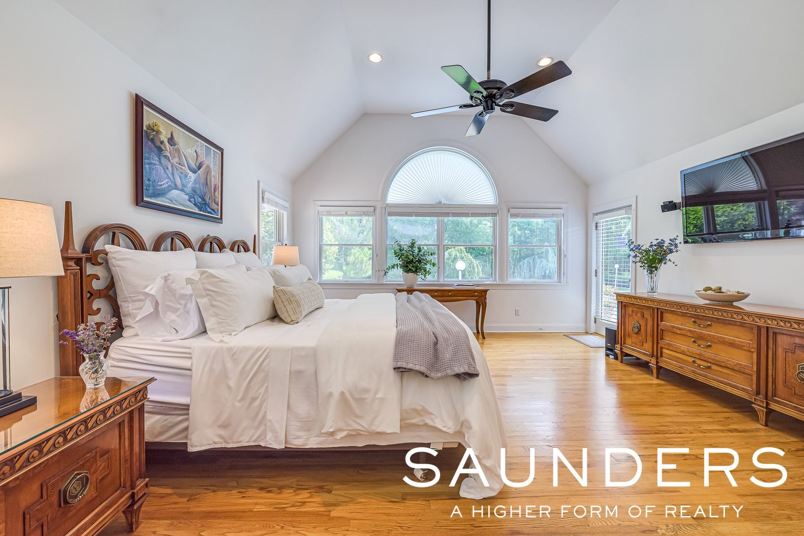 Nestled in privacy on a cul-de-sac in East Quogue, this Hamptons retreat offers a fabulous rear yard with a heated swimming pool, paver patio, Trex deck, and beautiful landscaping with specimen trees on a wooded shy acre. The outdoor setting enjoys southeast exposure and welcomes al fresco dining and lounging. There is an extra-large 672 +/- sq. ft. detached 2-car garage with bonus storage loft above, plus an attached 1.5 car garage on the 2-s