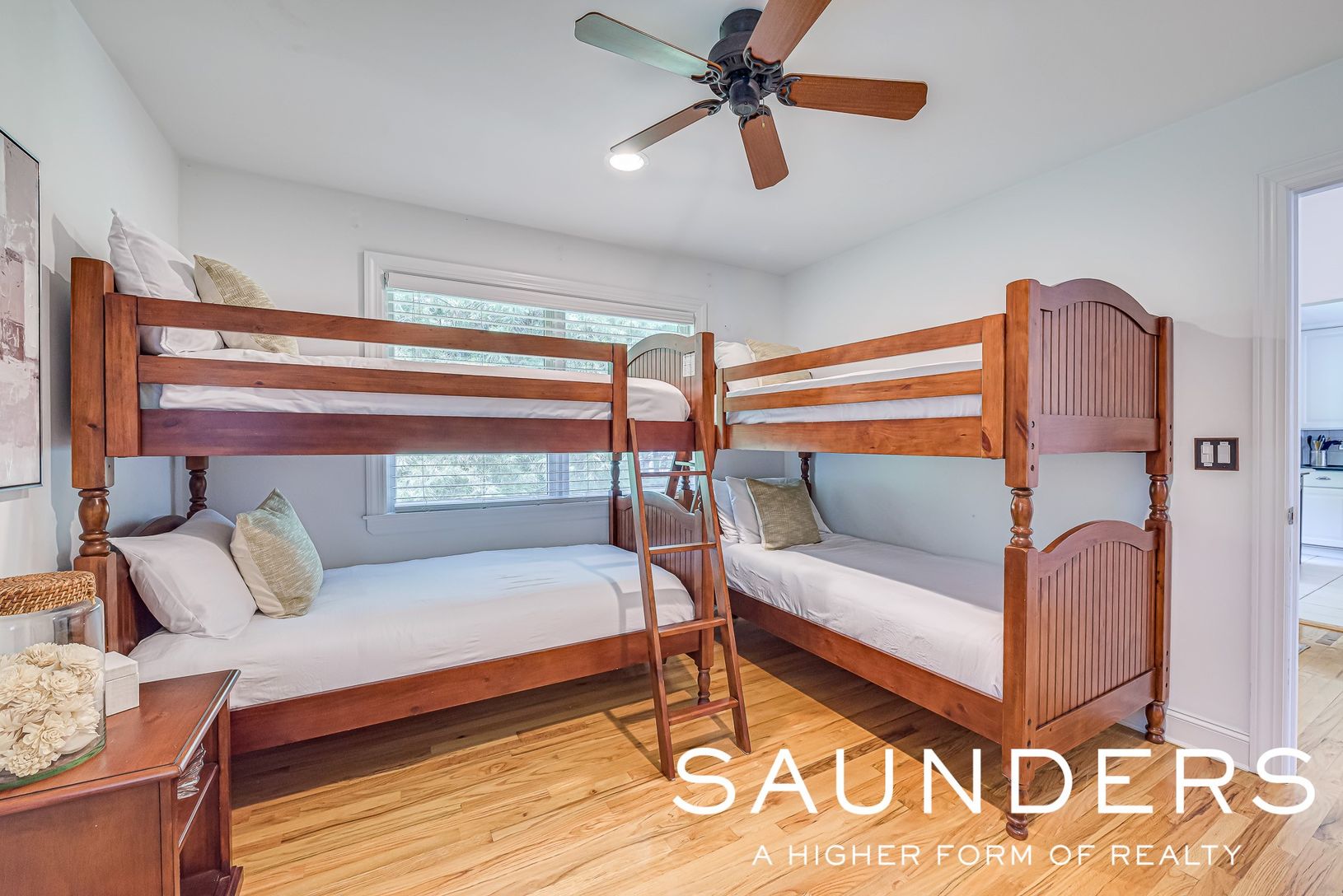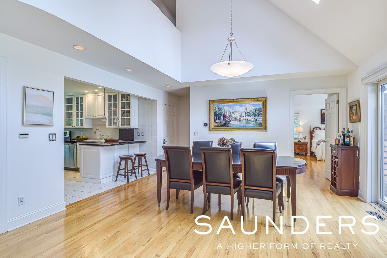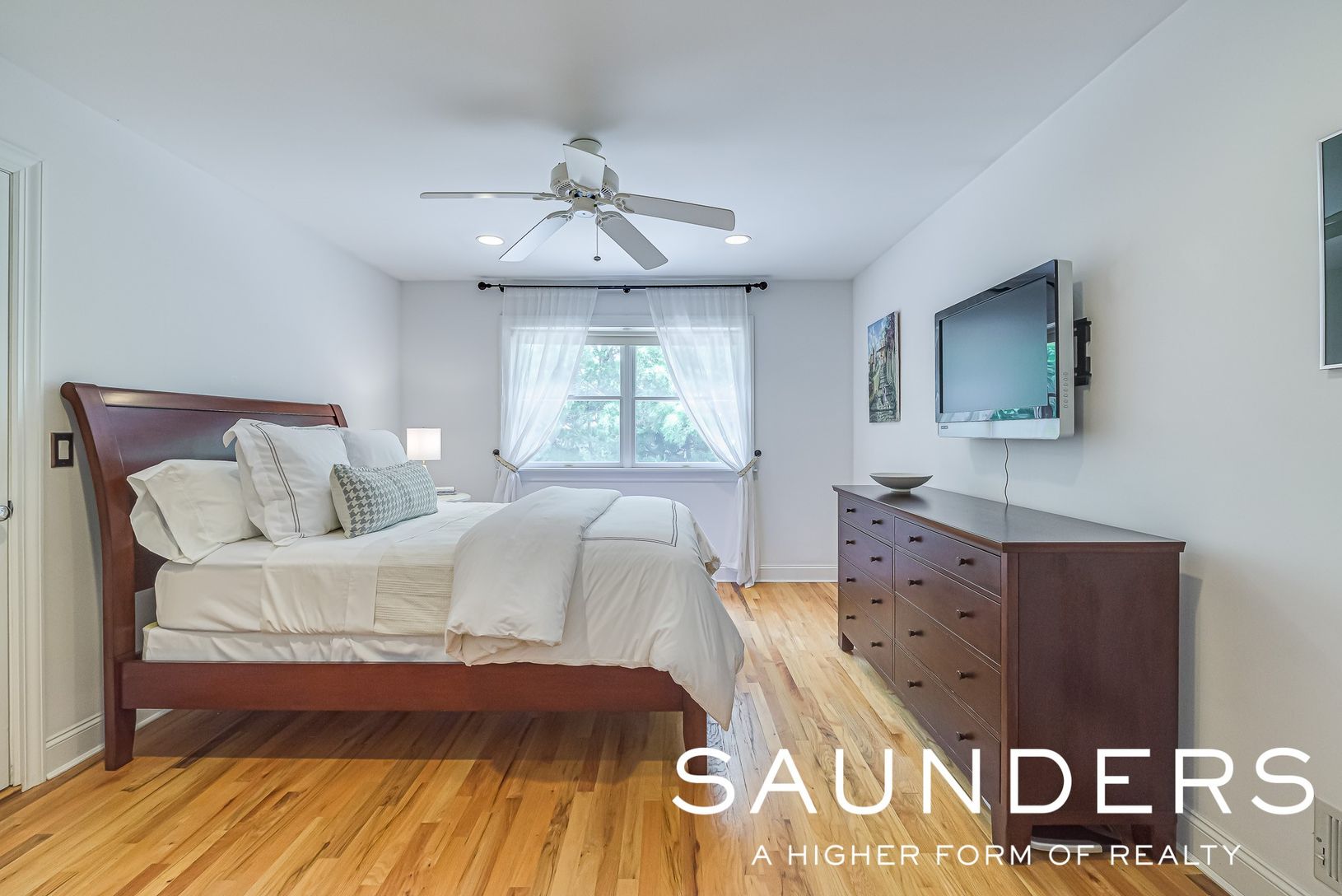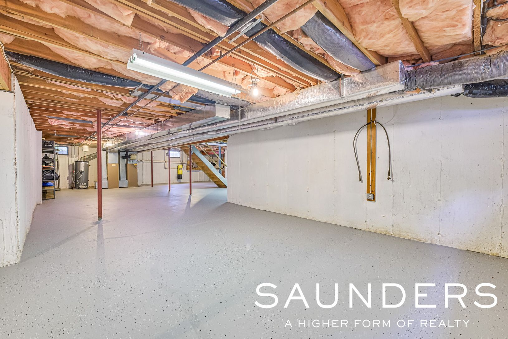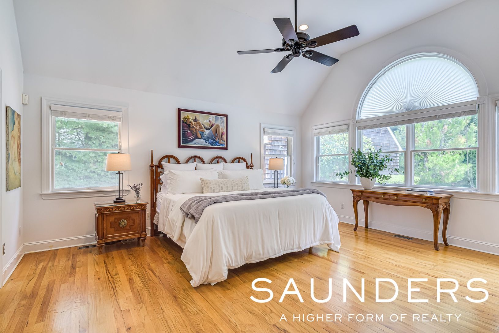 Nestled in privacy on a cul-de-sac in East Quogue, this Hamptons retreat offers a fabulous rear yard with a heated swimming pool, paver patio, Trex deck, and beautiful landscaping with specimen trees on a wooded shy acre. The outdoor setting enjoys southeast exposure and welcomes al fresco dining and lounging. There is an extra-large 672 +/- sq. ft. detached 2-car garage with bonus storage loft above, plus an attached 1.5 car garage on the 2-s