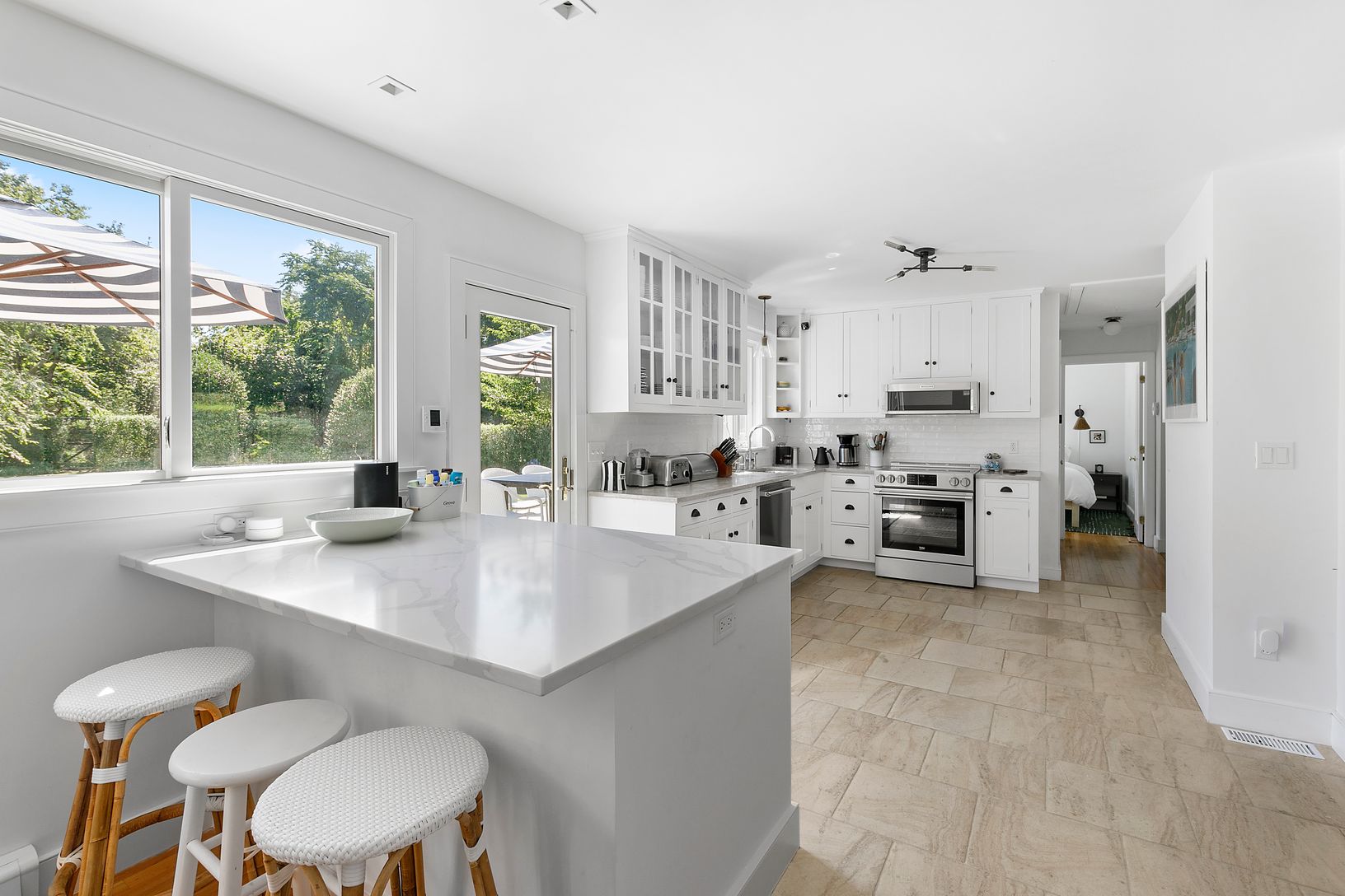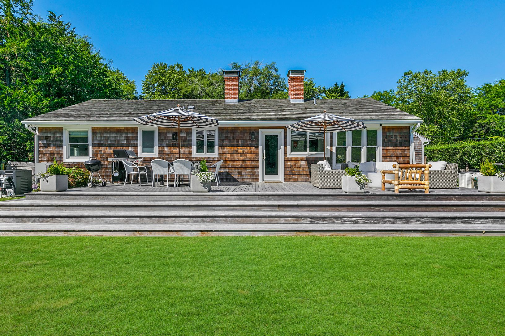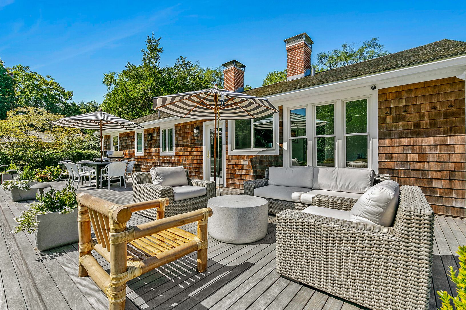 Near to the most beautiful village in the Hamptons, on a quiet cul-de-sac court, this stunningly renovated and furnished 3br 3ba home is perfectly appointed for summering in style. The living room with fireplace and separate family room both showcase exposed beams, built-ins, beautiful wood floors and tons of charm. The eat-in-kitchen features additional island seating, top-of-the-line appliances, and direct access to the oversized dining and