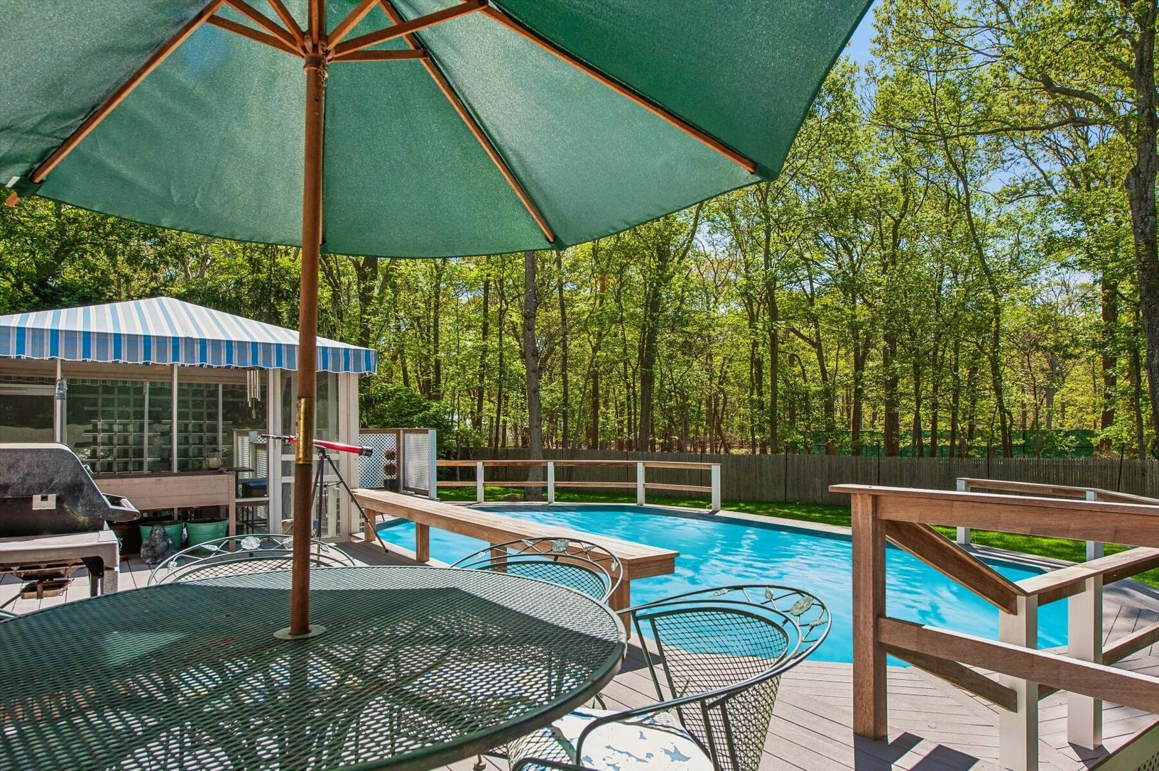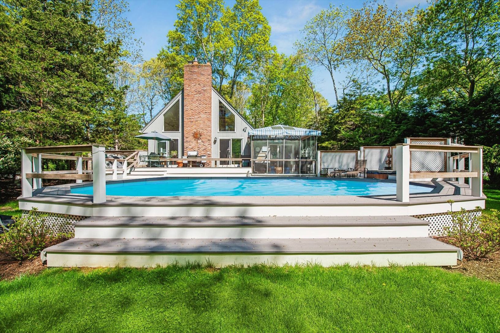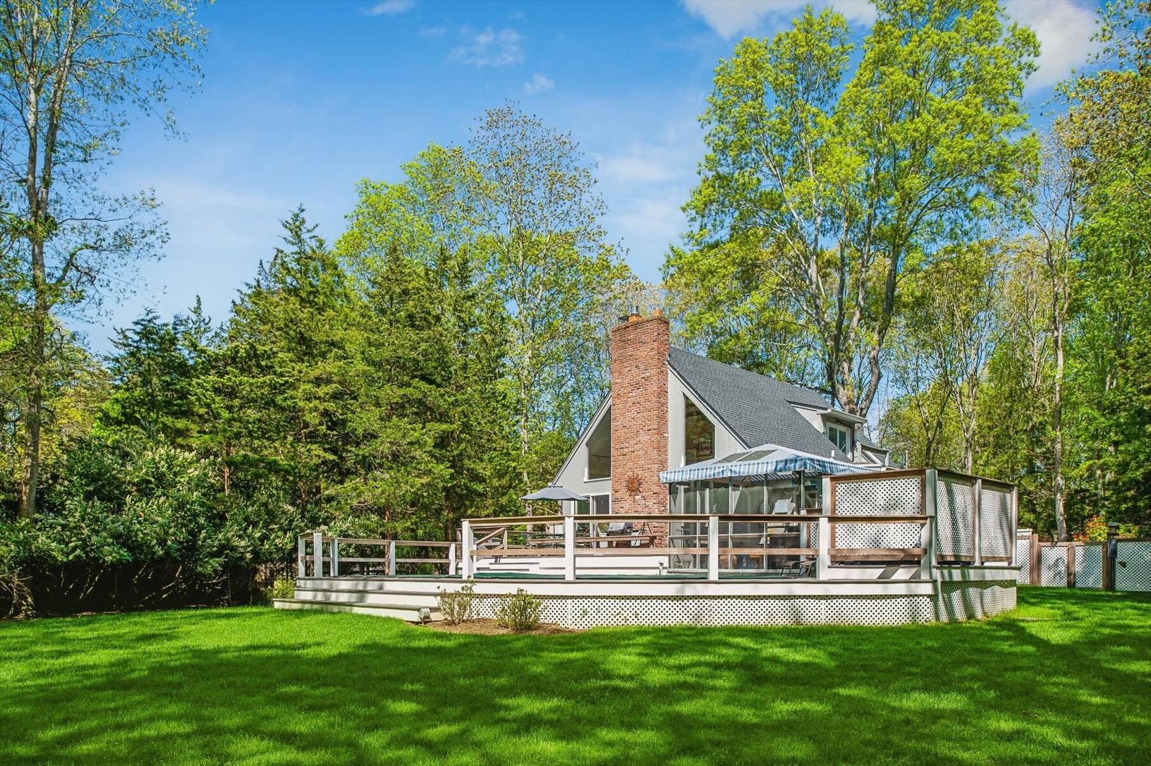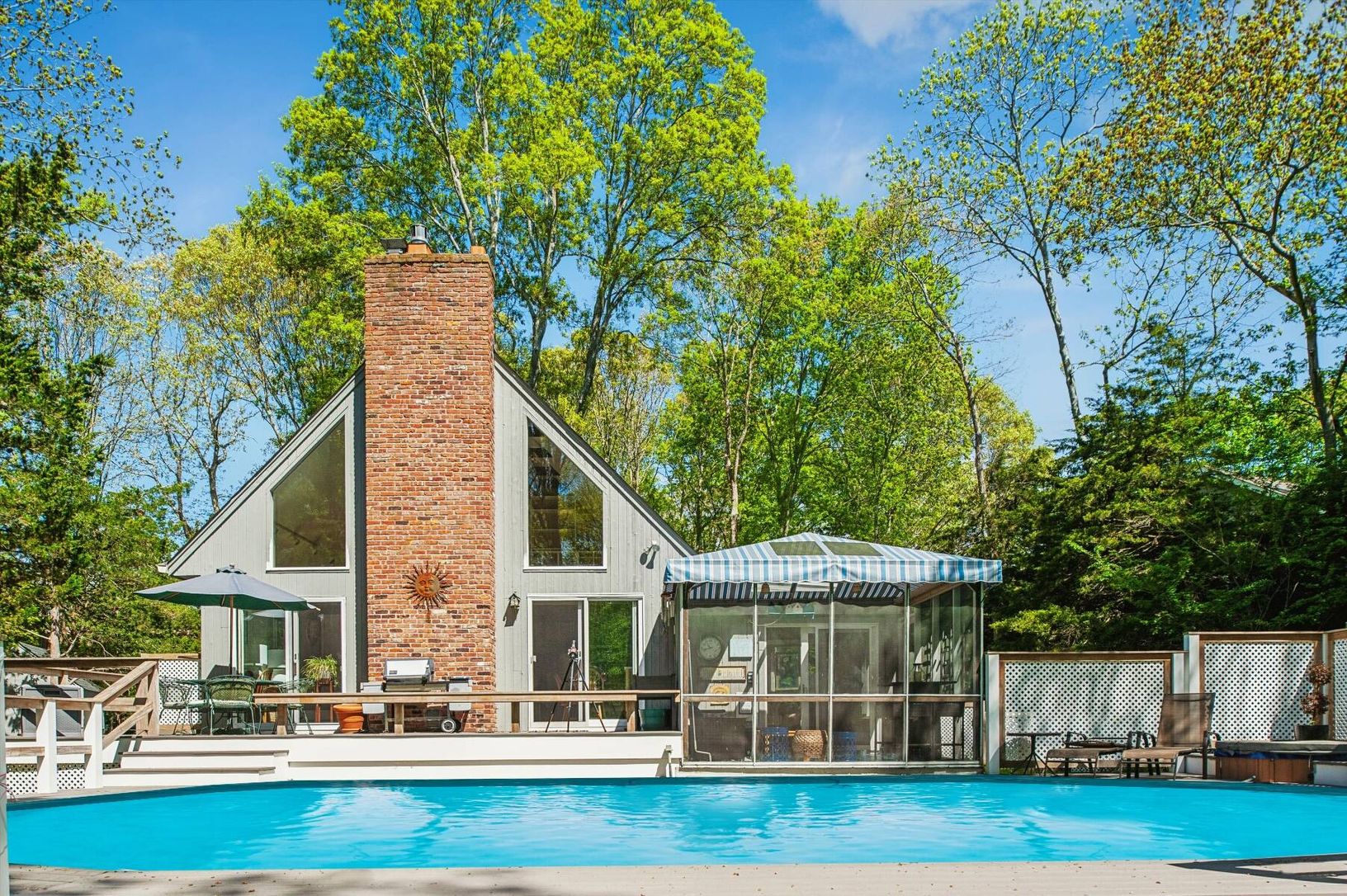 Located in a serene and private waterside enclave, this 3-bedroom, 3-bathroom beach house offers the ideal blend of relaxed elegance and thoughtful design. Set on .38 acres of beautifully landscaped grounds, the 1,472 sq ft home welcomes you with a light-filled living room featuring double-height ceilings, a wood-burning fireplace, and a dramatic wall of glass with sliders that open to an expansive deck and pool area-perfect for seamless indoo