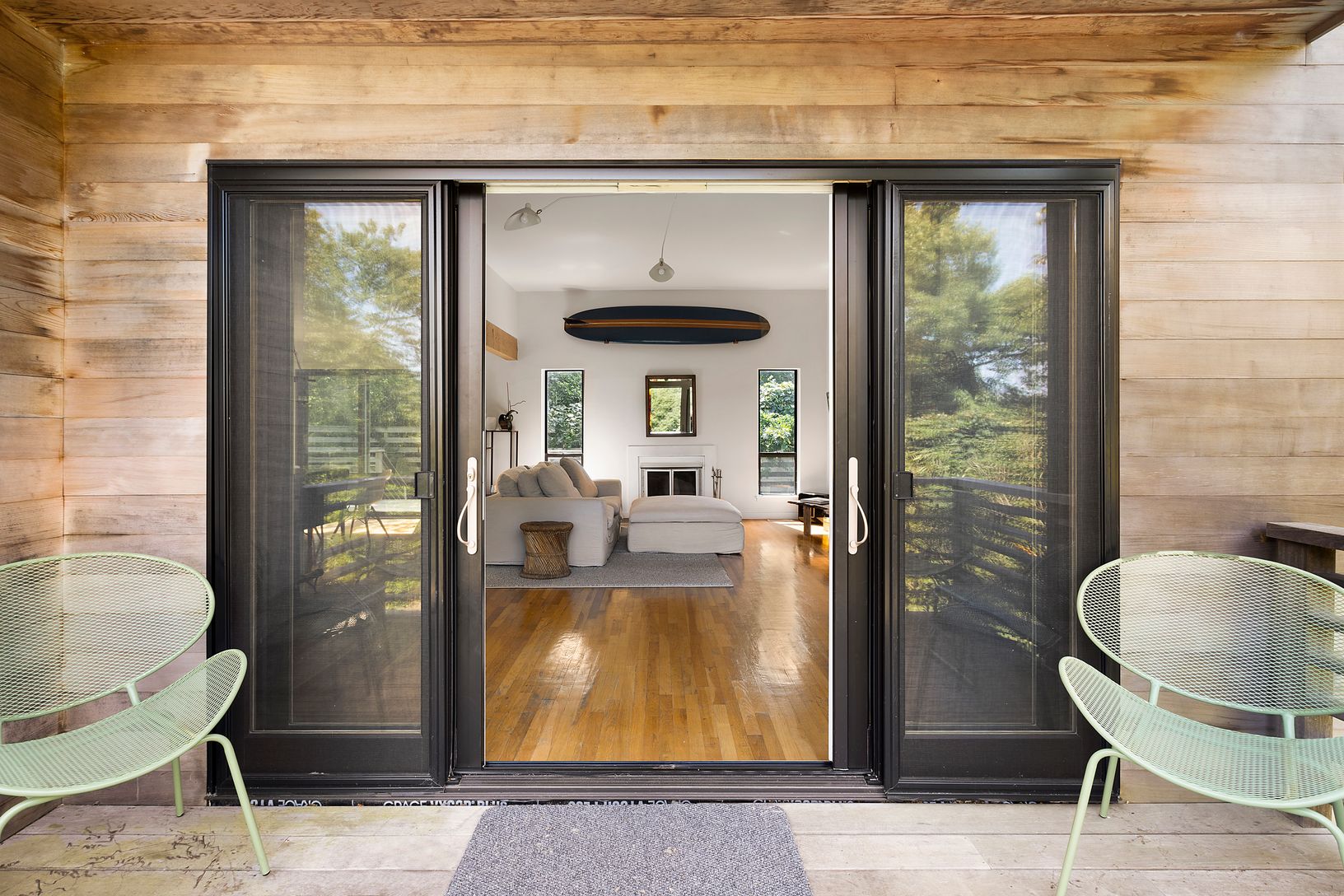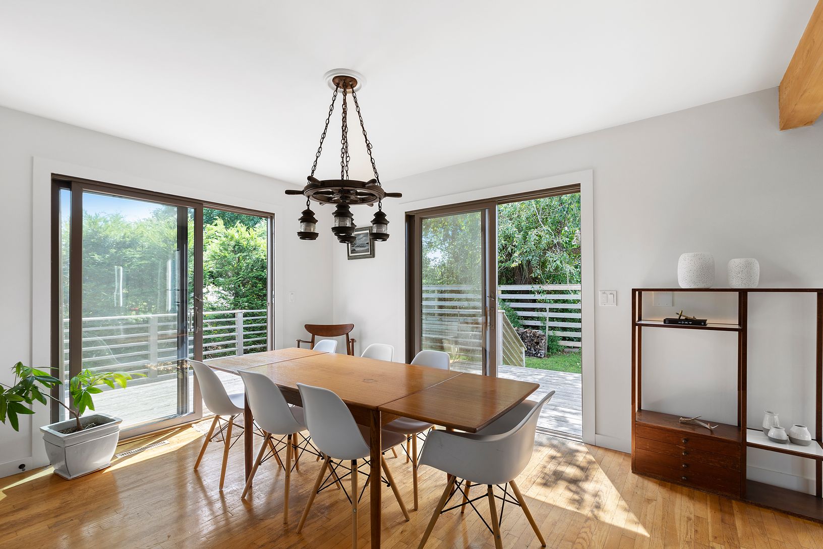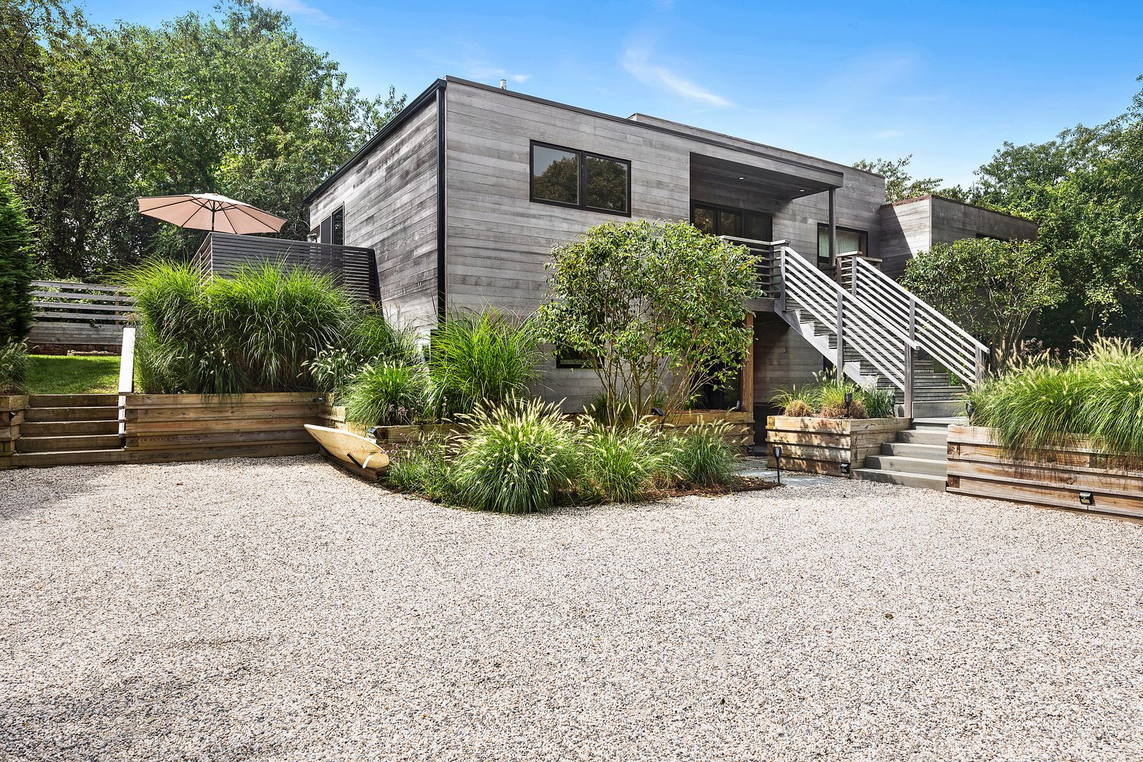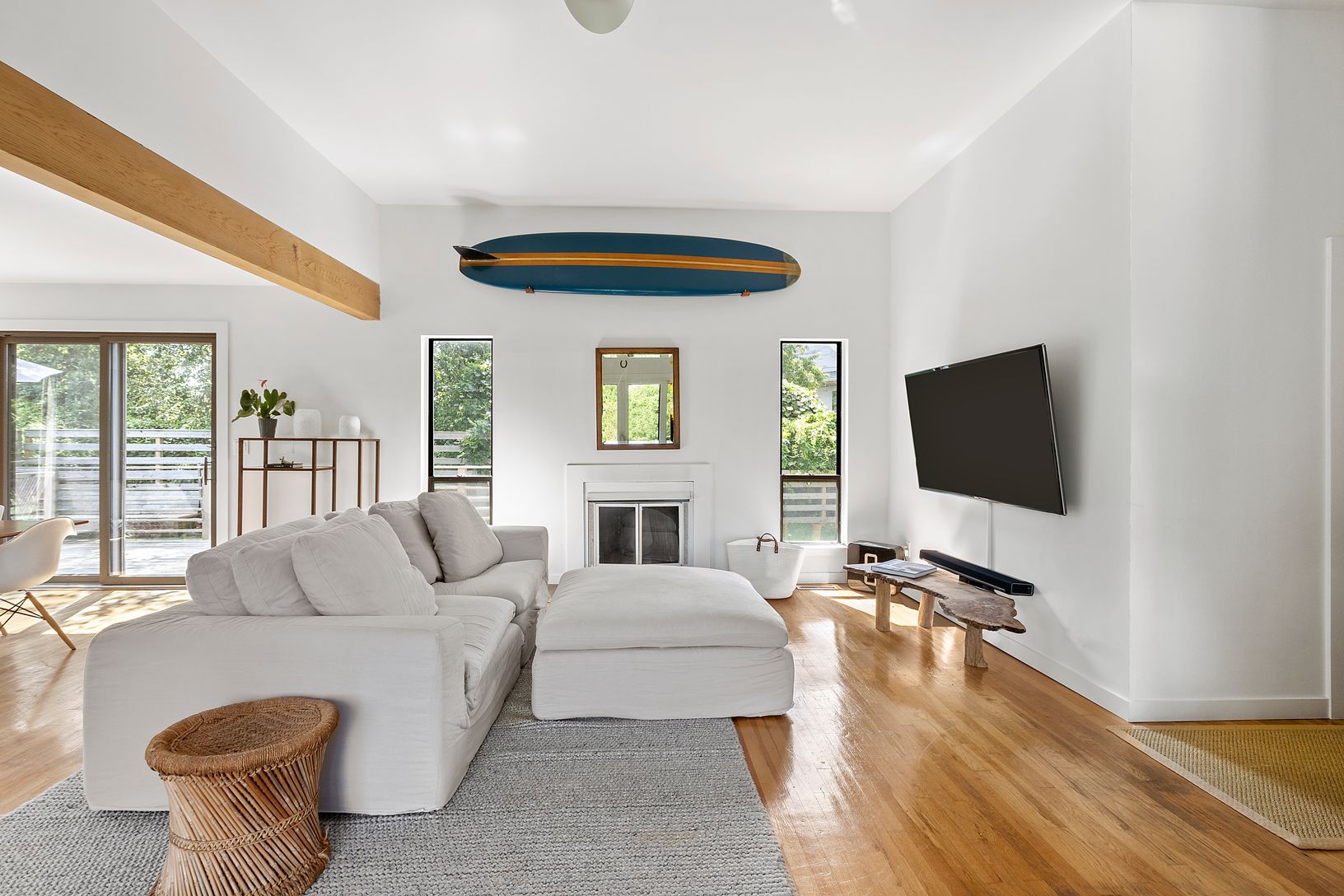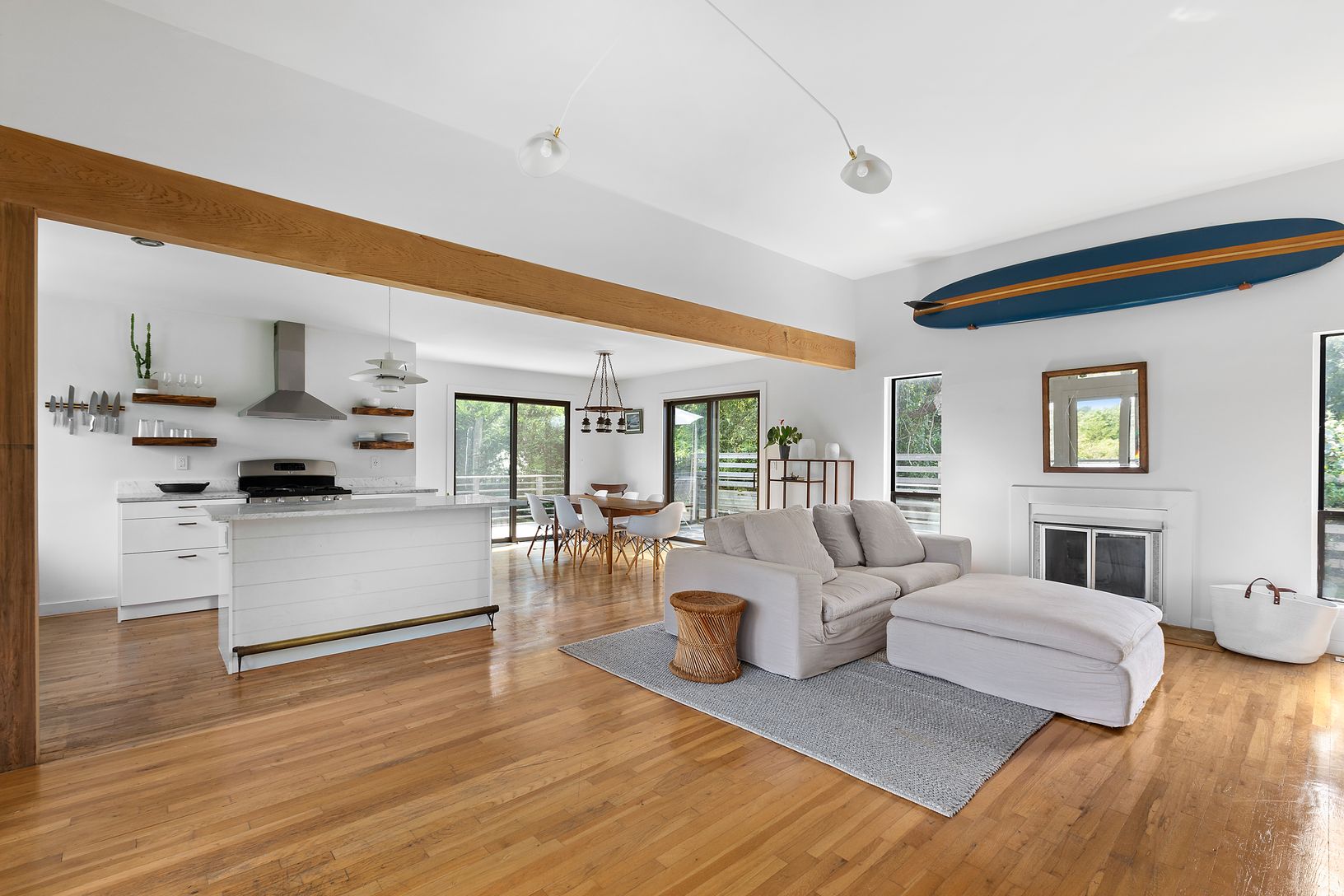 Tucked away off the street in a quiet and central location, this updated Montauk home is a true oasis. Newly renovated the main floor is open and airy featuring a living room with fireplace, high ceilings, and sliders to the back deck. The kitchen has marble counters and brass fixtures, pantry closet, and opens to the dining area. This main floor also features the master suite with private bath and outdoor access, two guest bedrooms and a seco