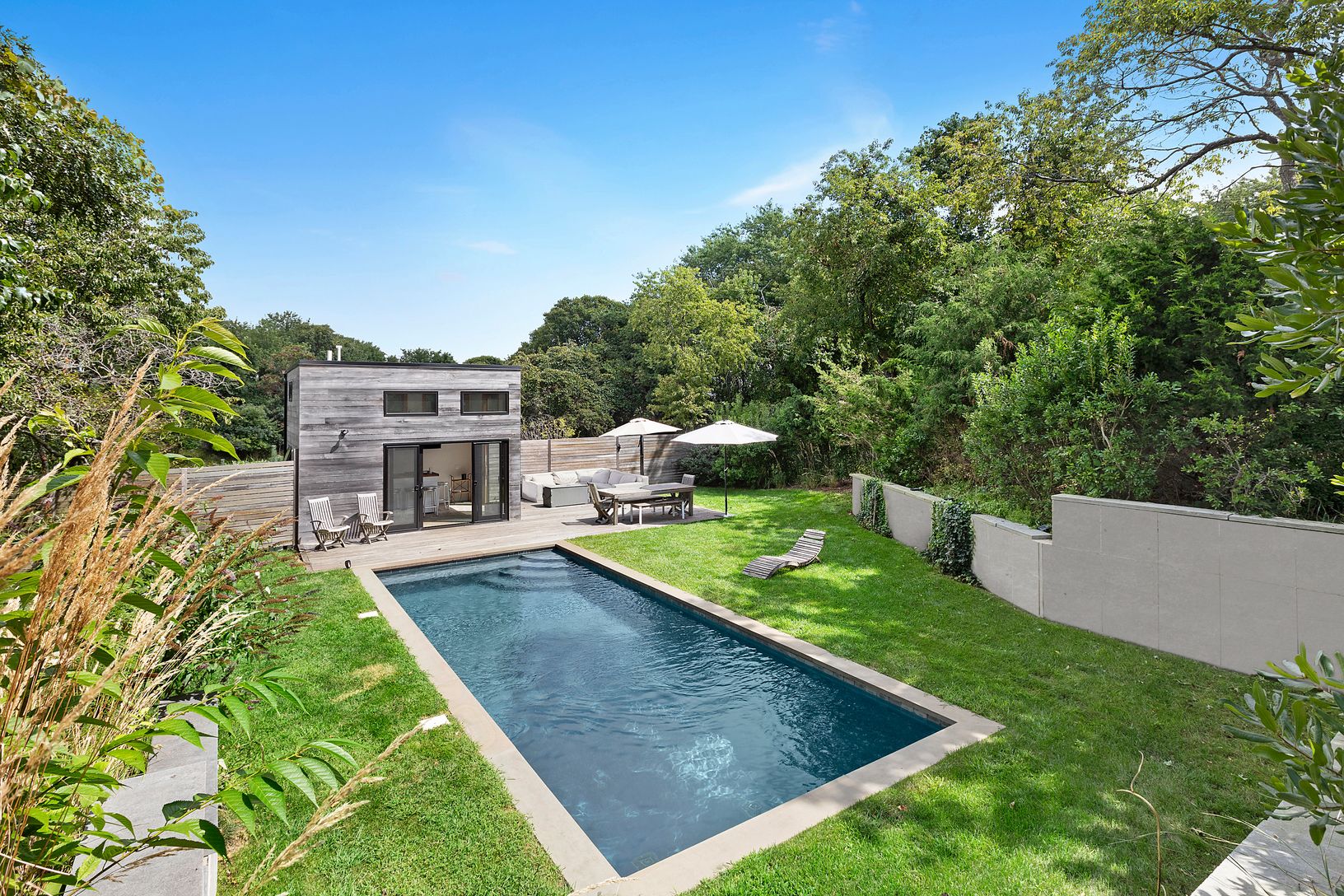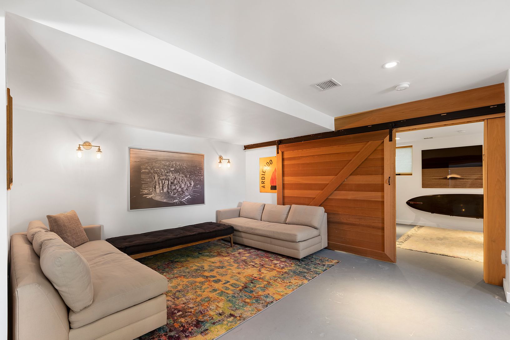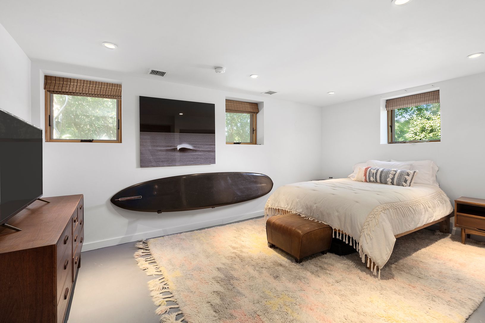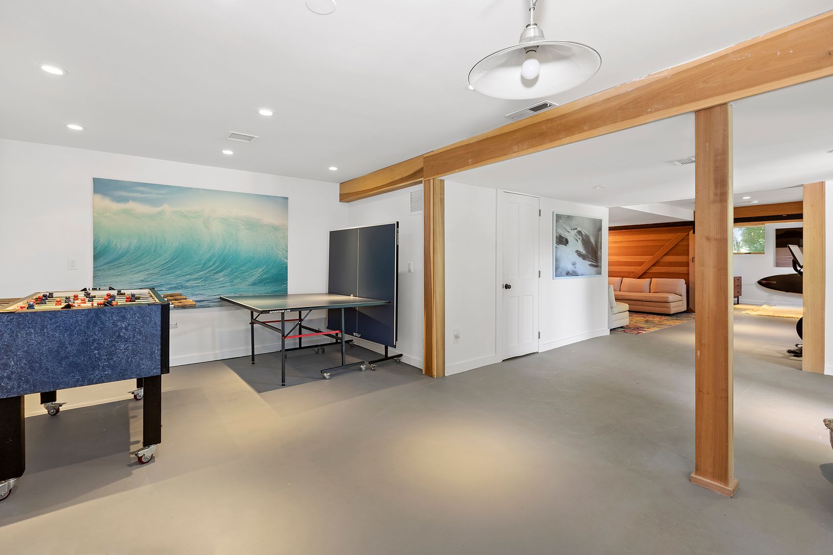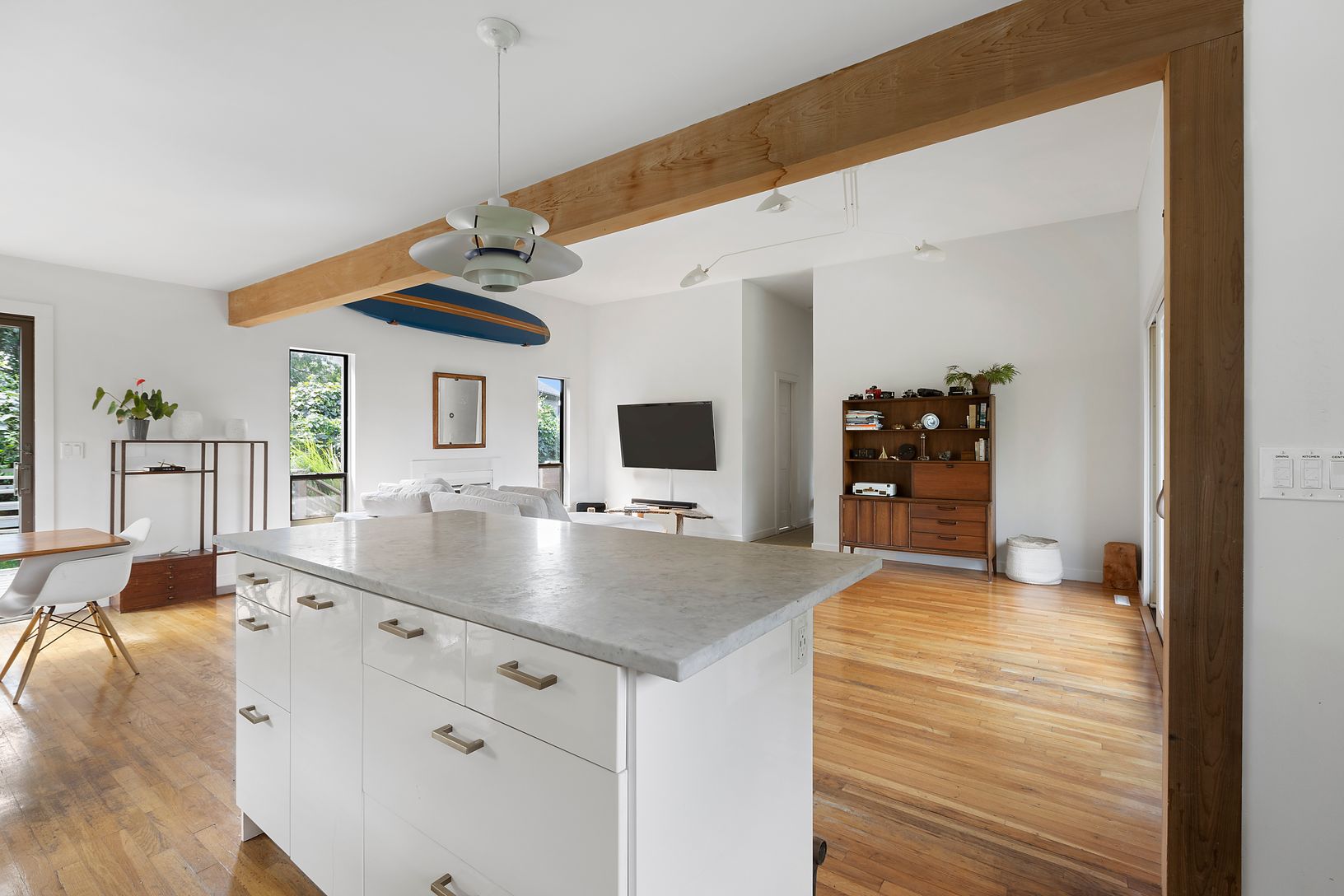 Tucked away off the street in a quiet and central location, this updated Montauk home is a true oasis. Newly renovated the main floor is open and airy featuring a living room with fireplace, high ceilings, and sliders to the back deck. The kitchen has marble counters and brass fixtures, pantry closet, and opens to the dining area. This main floor also features the master suite with private bath and outdoor access, two guest bedrooms and a seco