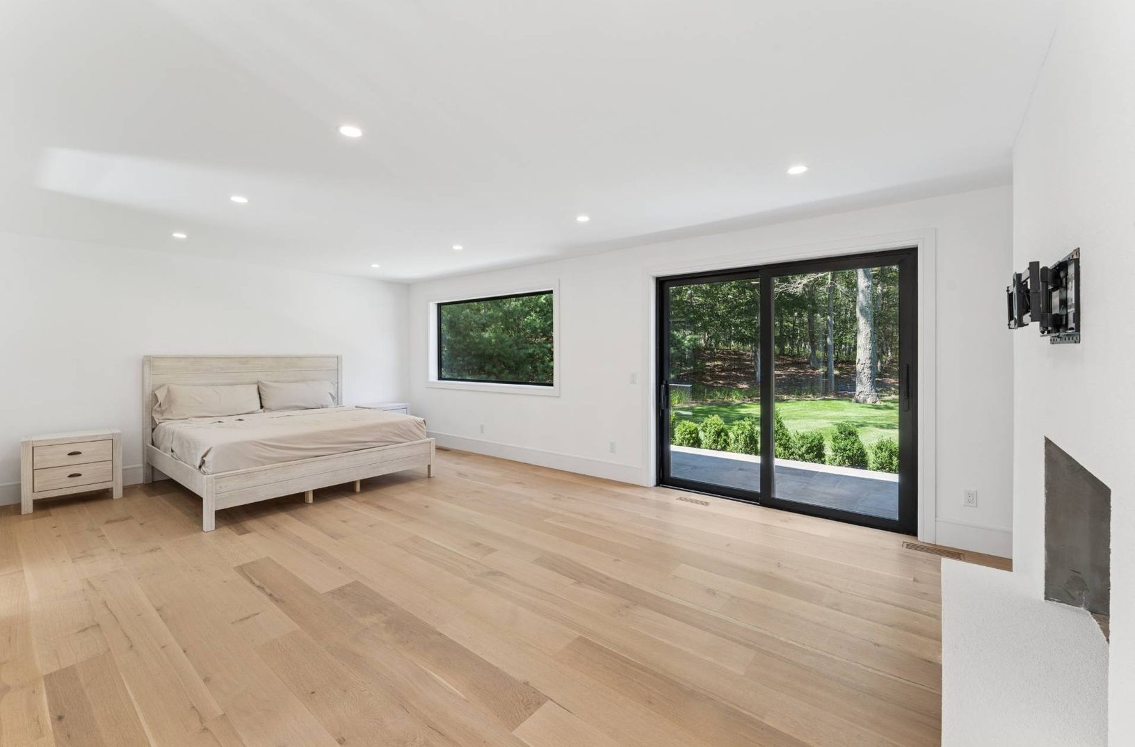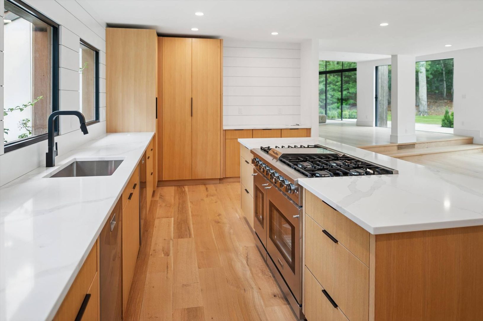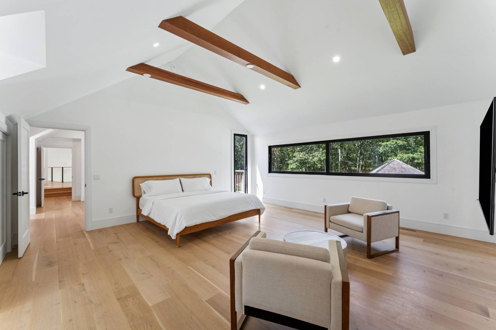 A welcoming foyer with 25-foot cathedral ceilings and large iron-framed windows sets the tone for this spacious, light-filled home. Sliding glass walls open to the landscaped grounds, and a plaster-finished fireplace anchors the main living area. The open floor plan features white oak flooring and a well-appointed chef’s kitchen with rift-sawn oak cabinetry and quality European fixtures. A floating staircase leads to the second floor, where th