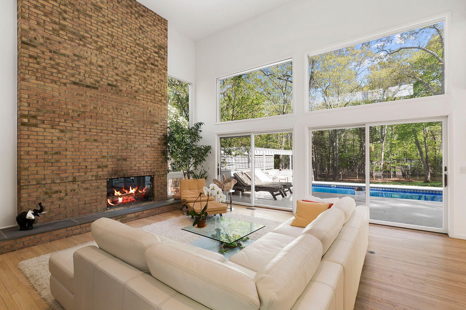 This meticulously maintained contemporary is situated on nearly two private acres in a prestigious, private beach community with over 3000 square feet of living space and four nicely appointed bedrooms and four full baths. The open living room offers soaring ceilings and brick fireplace, and leads to the recently renovated kitchen and dining area. The first floor master suite features decking leading outside and also has its own cozy fireplace
