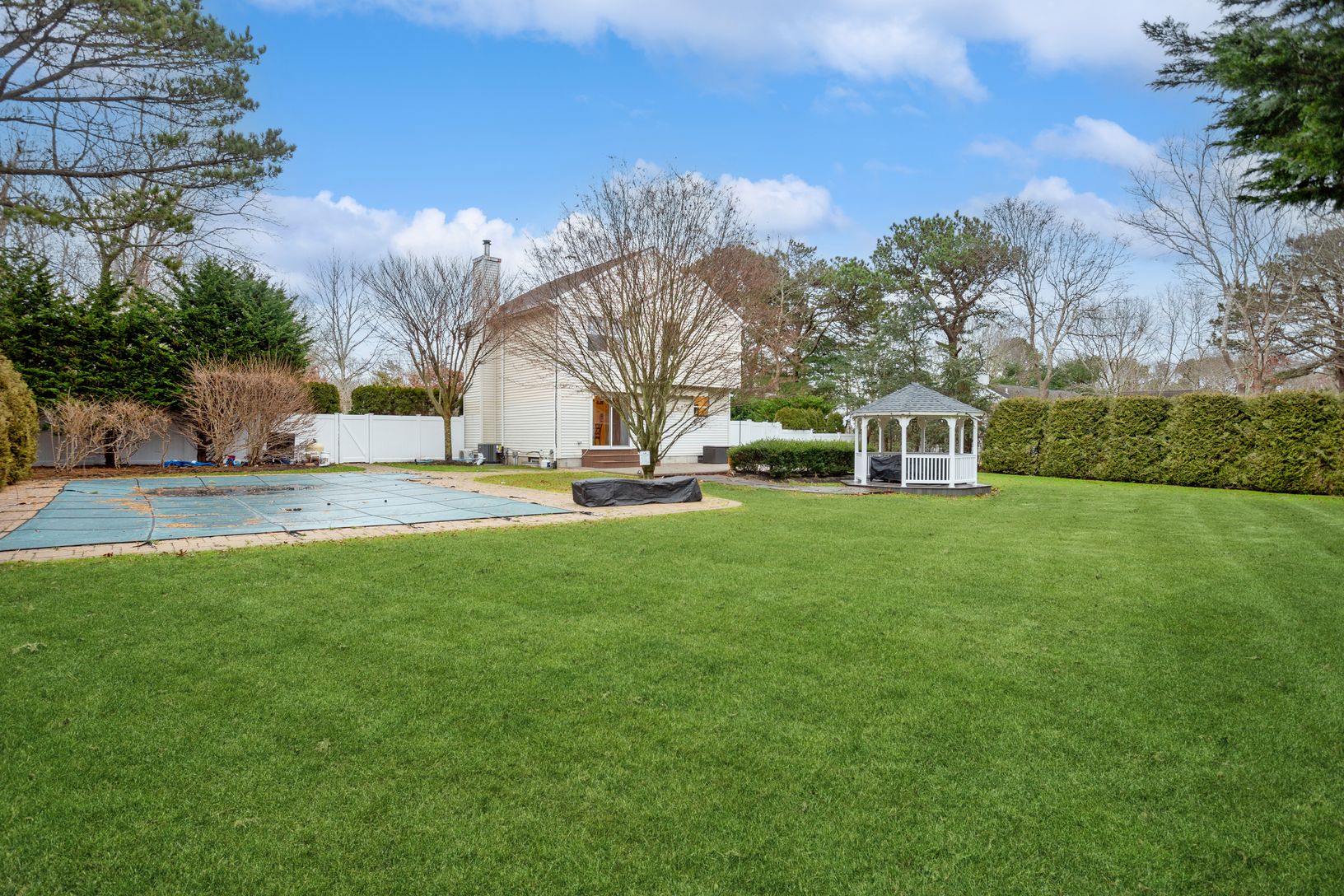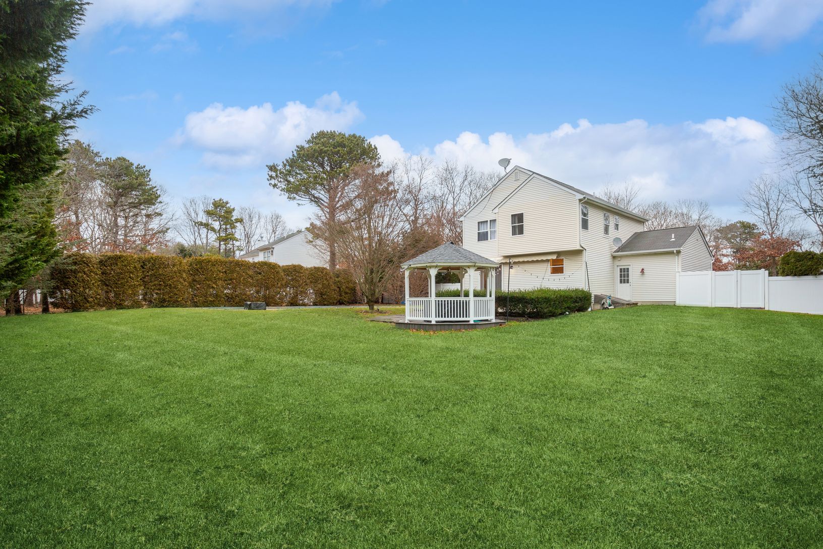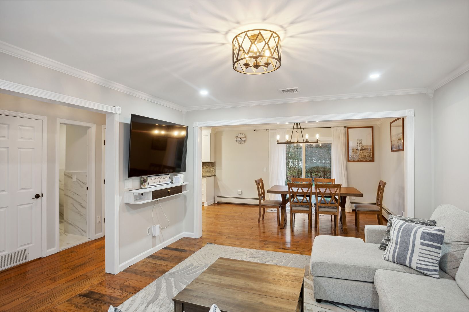 6 Jennifer's Path in Westhampton Beach is a meticulously maintained property featuring 3 bedrooms and 2.5 bathrooms. The home boasts a beautifully renovated interior with hardwood floors throughout. The stunning backyard is an entertainer's dream, featuring a heated pool, gazebo, and charming string lighting, creating a European ambiance. The finished basement with an outside entrance includes an entertainment center, providing additional spac