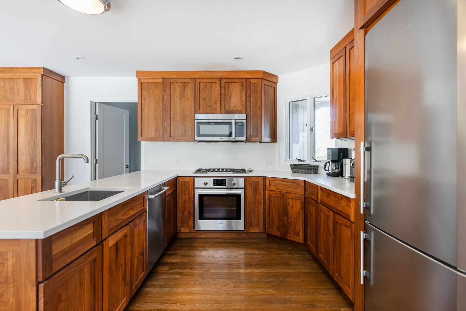 Located on a flag lot off of a cul-de-sac and backed to wooded reserve, this nearly 2 acre property is incredibly private. After entering through the gates, this striking post-modern has been renovated and updated, and is in turn key condition. On the main level you enter an open and bright living space with vaulted ceilings, large windows, and southern exposure flooding the room with light. There are also open kitchen and dining areas leading