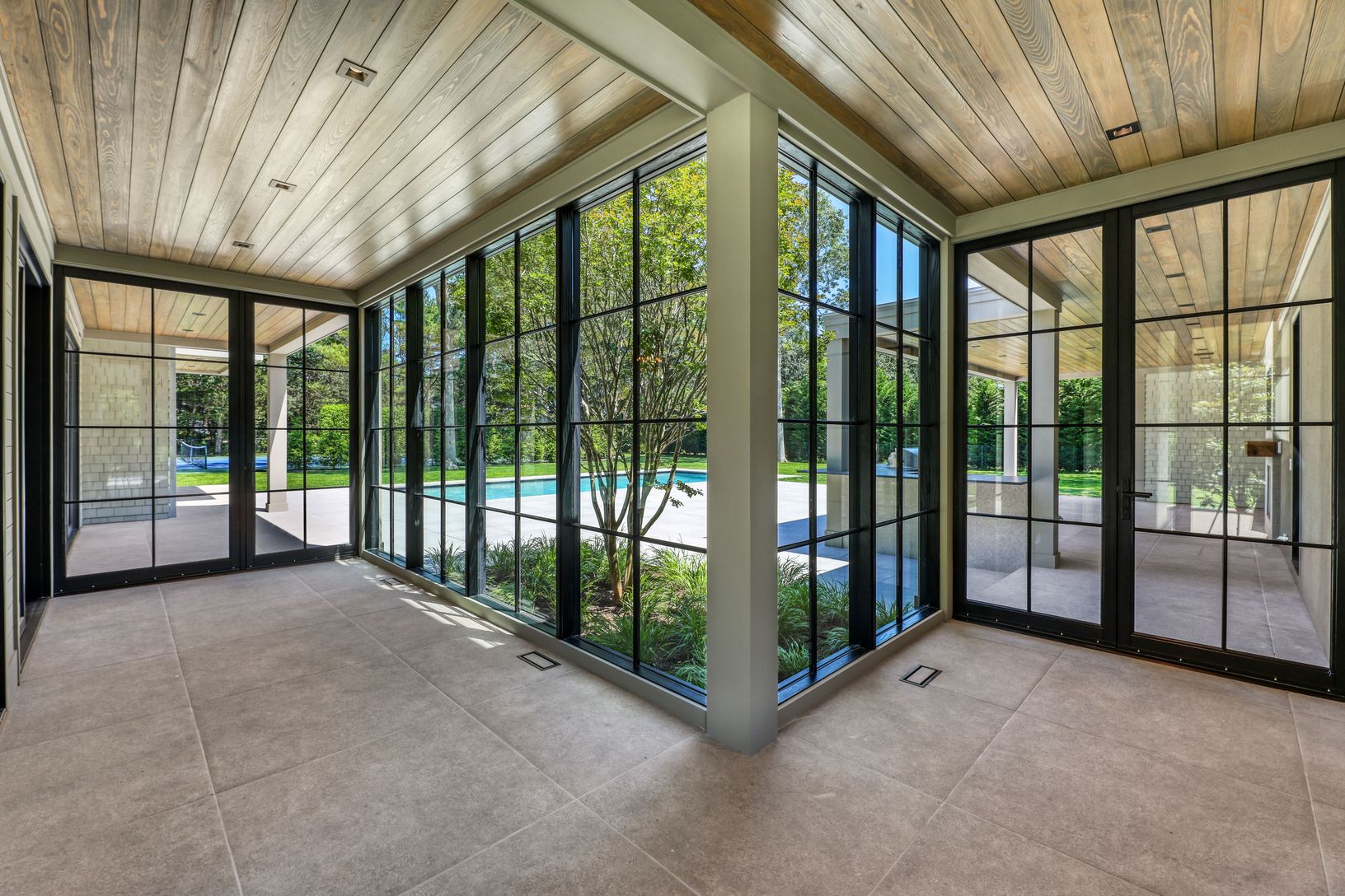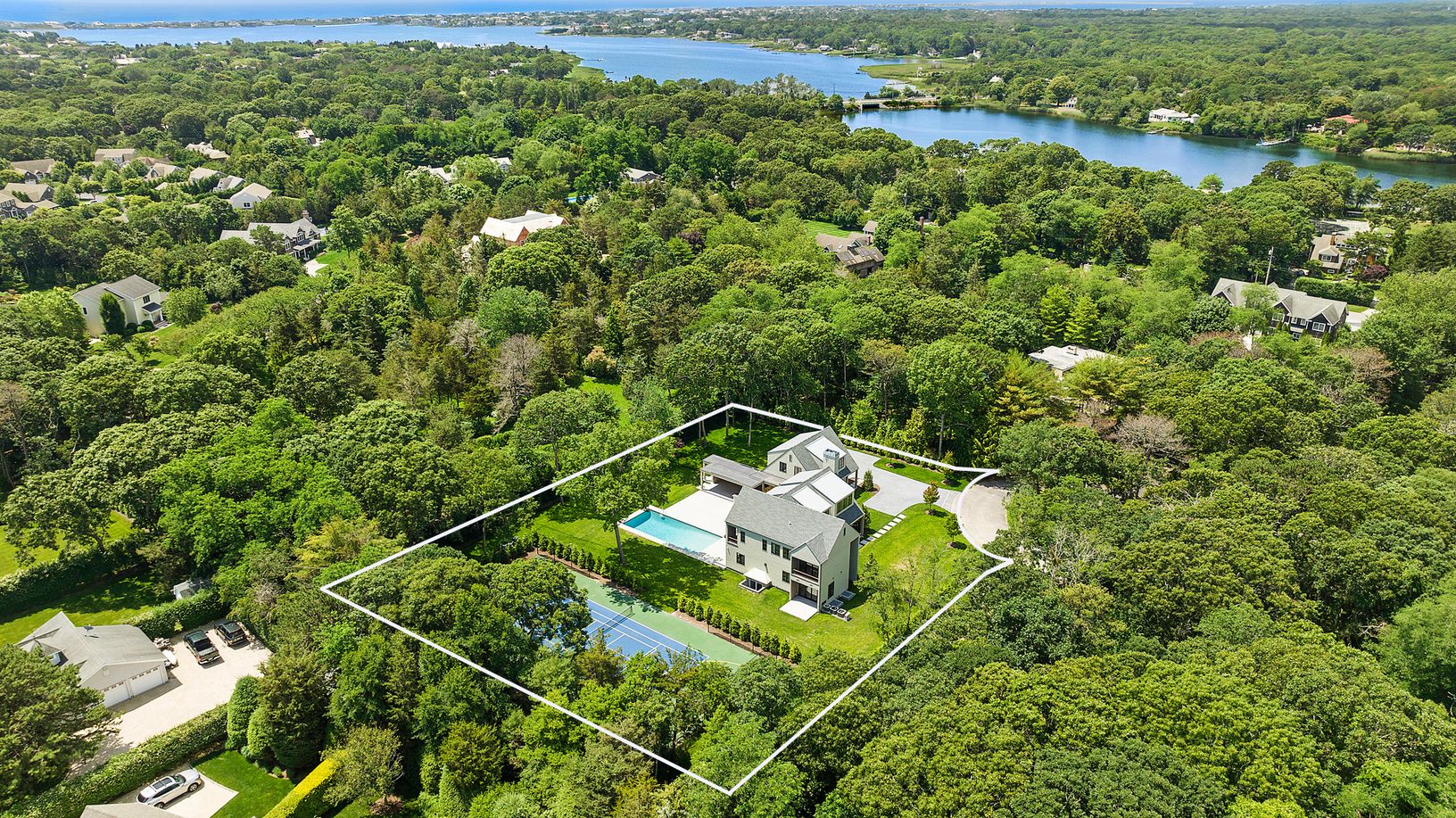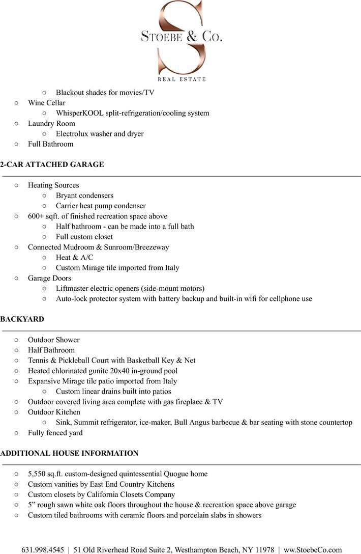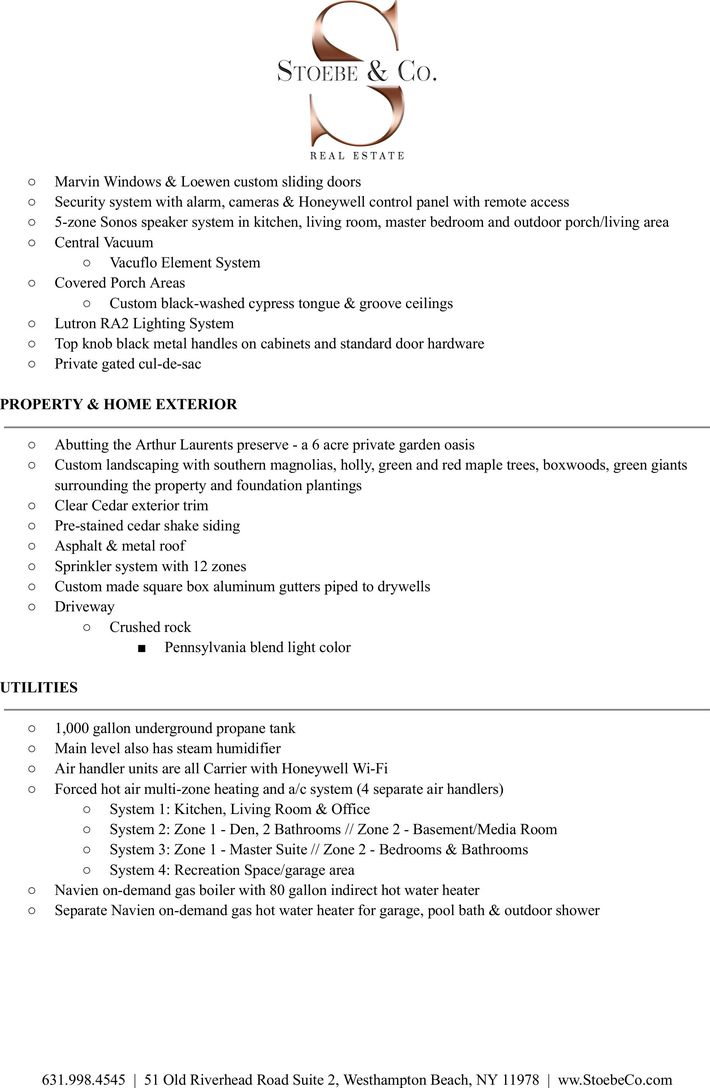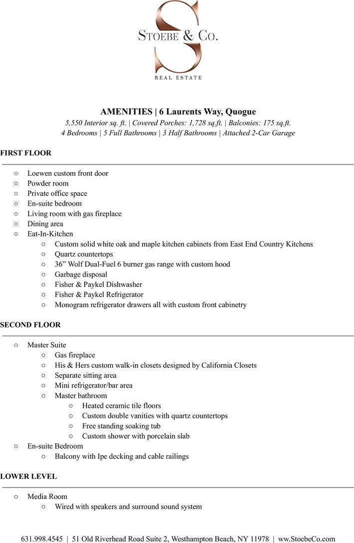 Welcome to 6 Laurents Way, a 5,550 sq.ft. newly custom built home by Surf Builders.This Quogue Village estate is nestled on one private acre within a gated cul-de-sac, just minutes to Quogue Main Street, Village Beach and Quogue Clubs.Throughout the home, you will find 5" rough sawn white oak floors, Marvin windows, Loewen custom sliding doors, custom tiled bathrooms with ceramic floors and porcelain slabs in showers, high end appliances and L