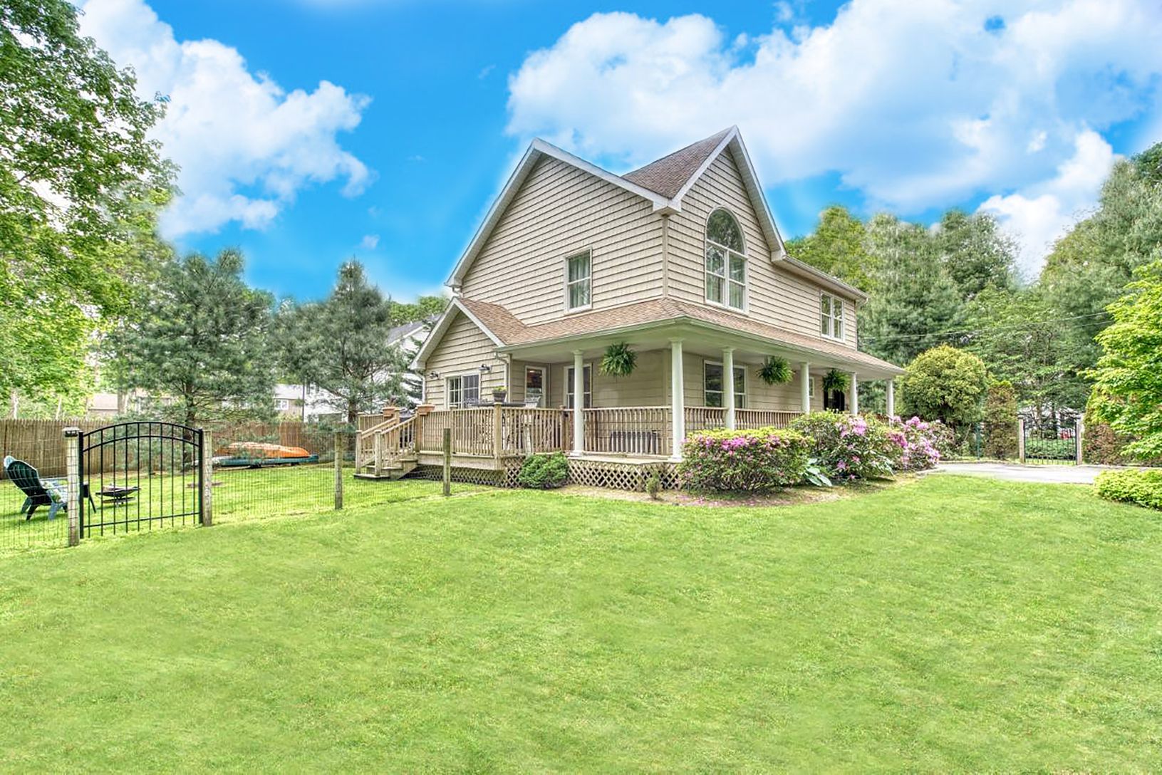 Welcome to this beautiful Westhampton Beach Village home, complete with beach rights. Tucked away in a private location, this home offers multiple outdoor areas, including a lovely patio and inviting covered porches. Inside, the spacious eat-in kitchen boasts stunning stone counters and wood cabinets, making it the perfect space for hosting family and friends. A formal dining room with a sizable pantry and a cozy living room with a fireplace