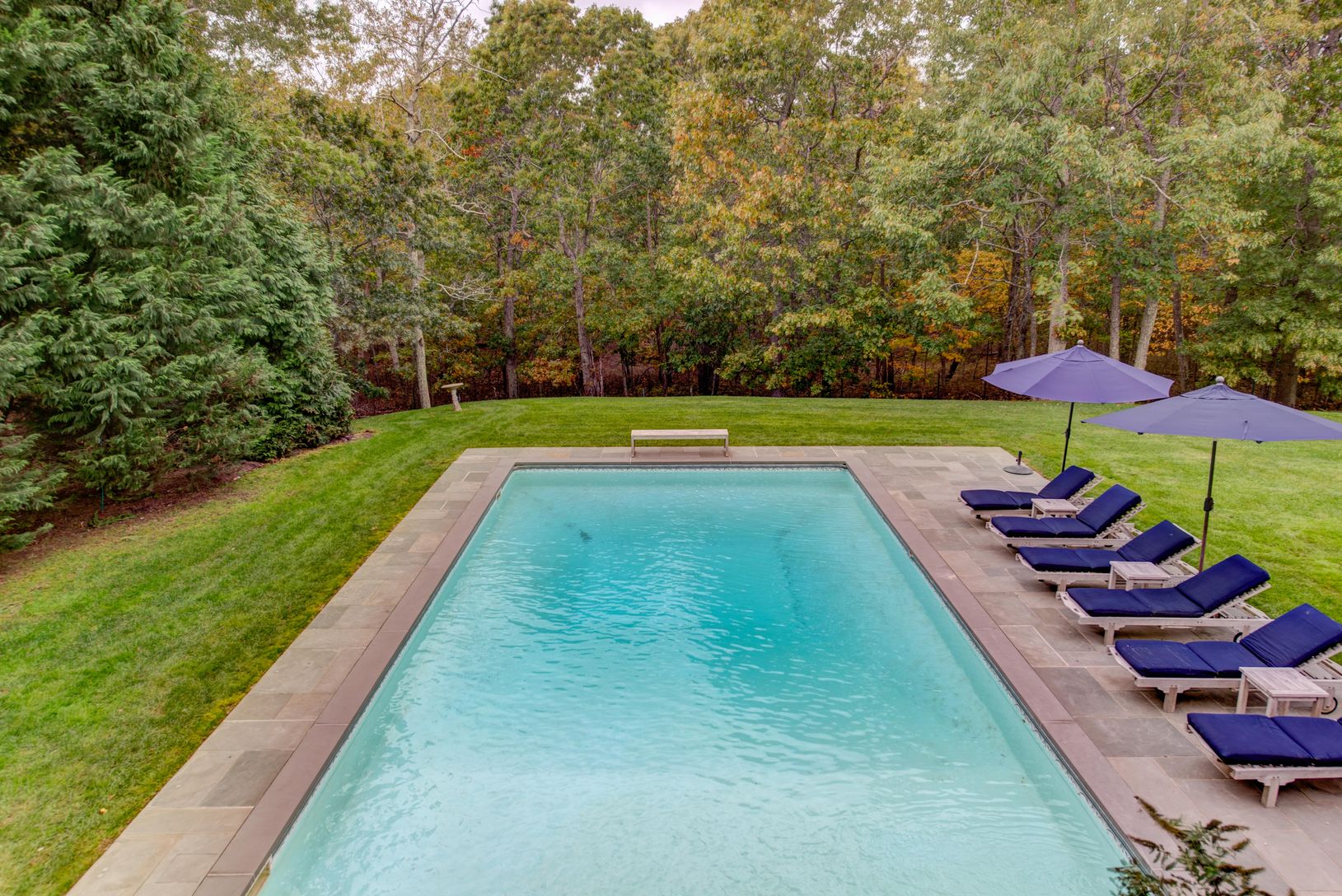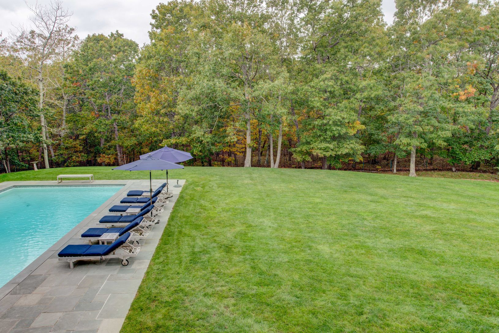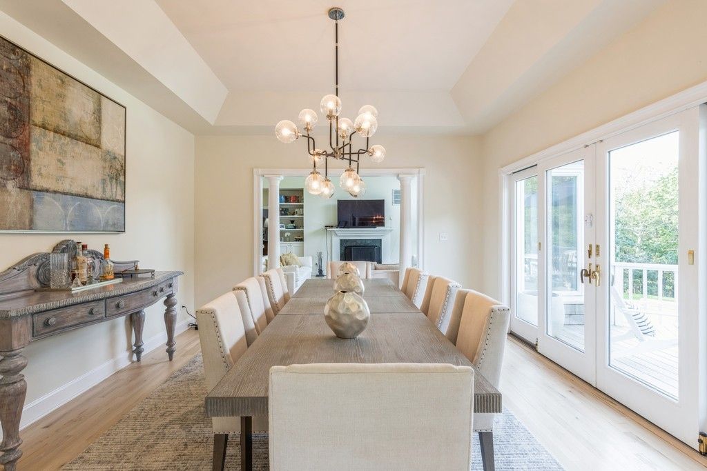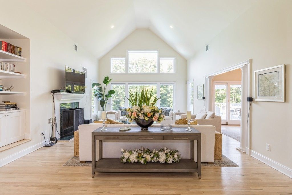 Nestled within a tranquil East Hampton neighborhood, this elegant estate sprawls across 1.47 acres of land, offering a serene retreat. Upon arrival, soaring ceilings and abundant natural light create an inviting ambiance throughout the open-plan living, dining, and kitchen areas on the main level. Modern coastal décor blends seamlessly with charming beach-inspired accents, setting a welcoming tone. Multiple living spaces on both levels provide