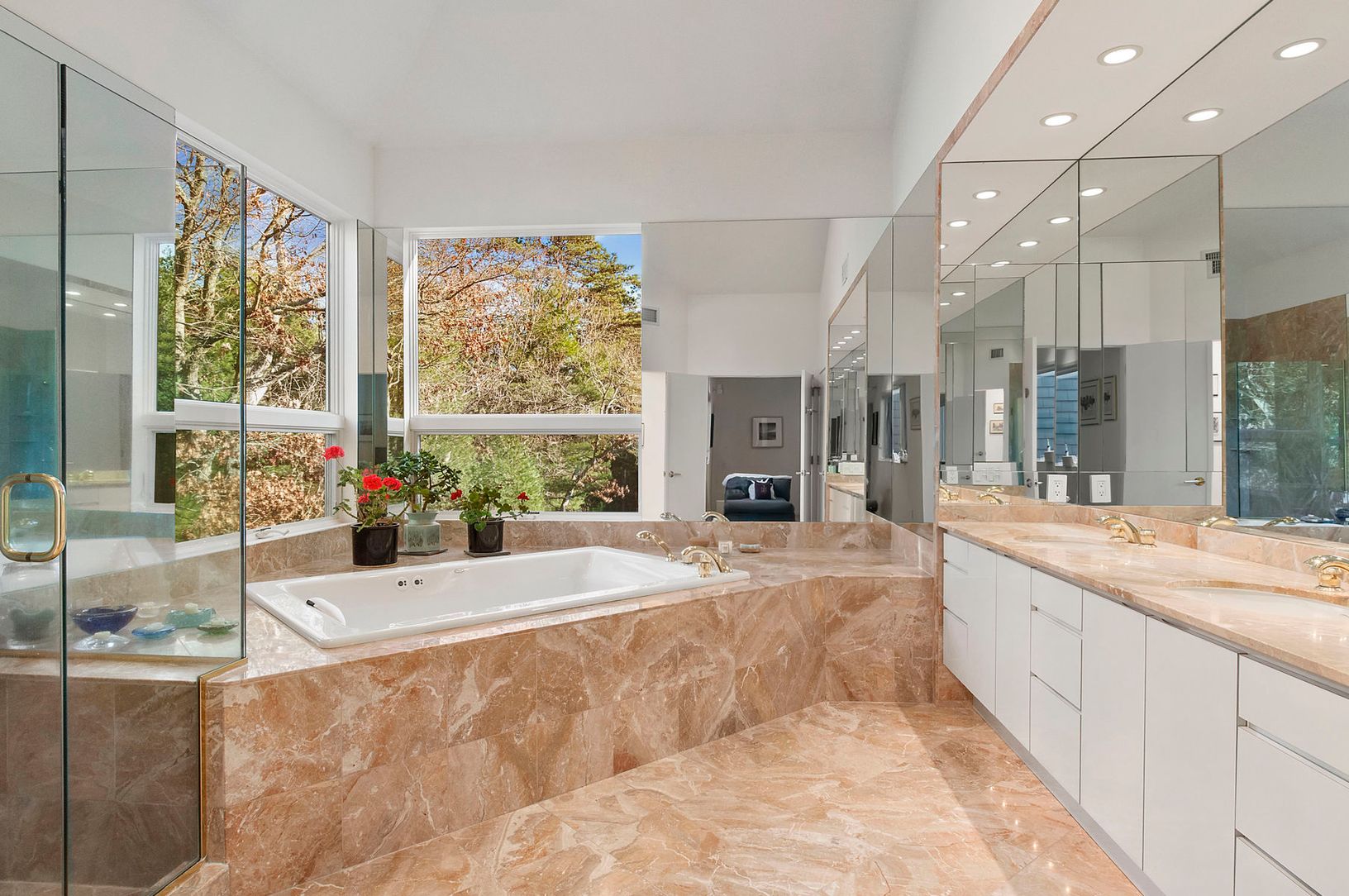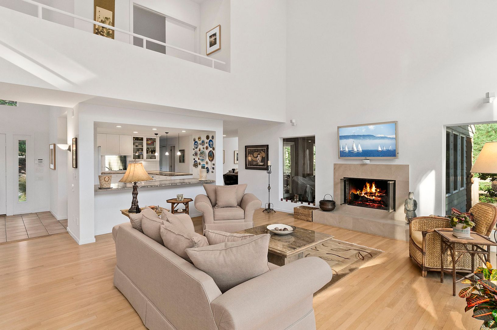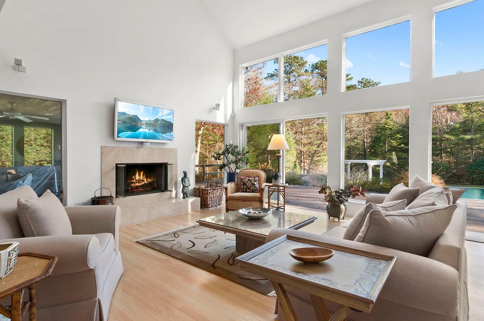 Down a long driveway and bordered by reserve sits this 4.2 acre oasis with a fish pond and gorgeous waterfall. The East Hampton Contemporary is about 4,200 sf with 4 bedrooms and 3.5 baths. When you enter the home you will notice the double-height ceilings in the living room with a wood-burning fireplace, plus the large glass windows letting in lots of light, which looks out to the backyard with lush landscaping and towering pines. The open fl