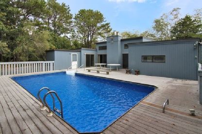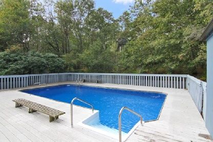 RAVENSWOOD: Walk to Peconic Bay and Shinnecock Canal from this 3 bedroom 2 bath contemporary nestled on .89 acre with large great room and high ceilings. Nicely landscaped with 32 x 16 in-ground vinyl pool and trex decking surrounding pool area. Built in 1984, this home has new features: 2015-a/c, 2015-pool liner, 2013-furnace, 2014-1 inch water line