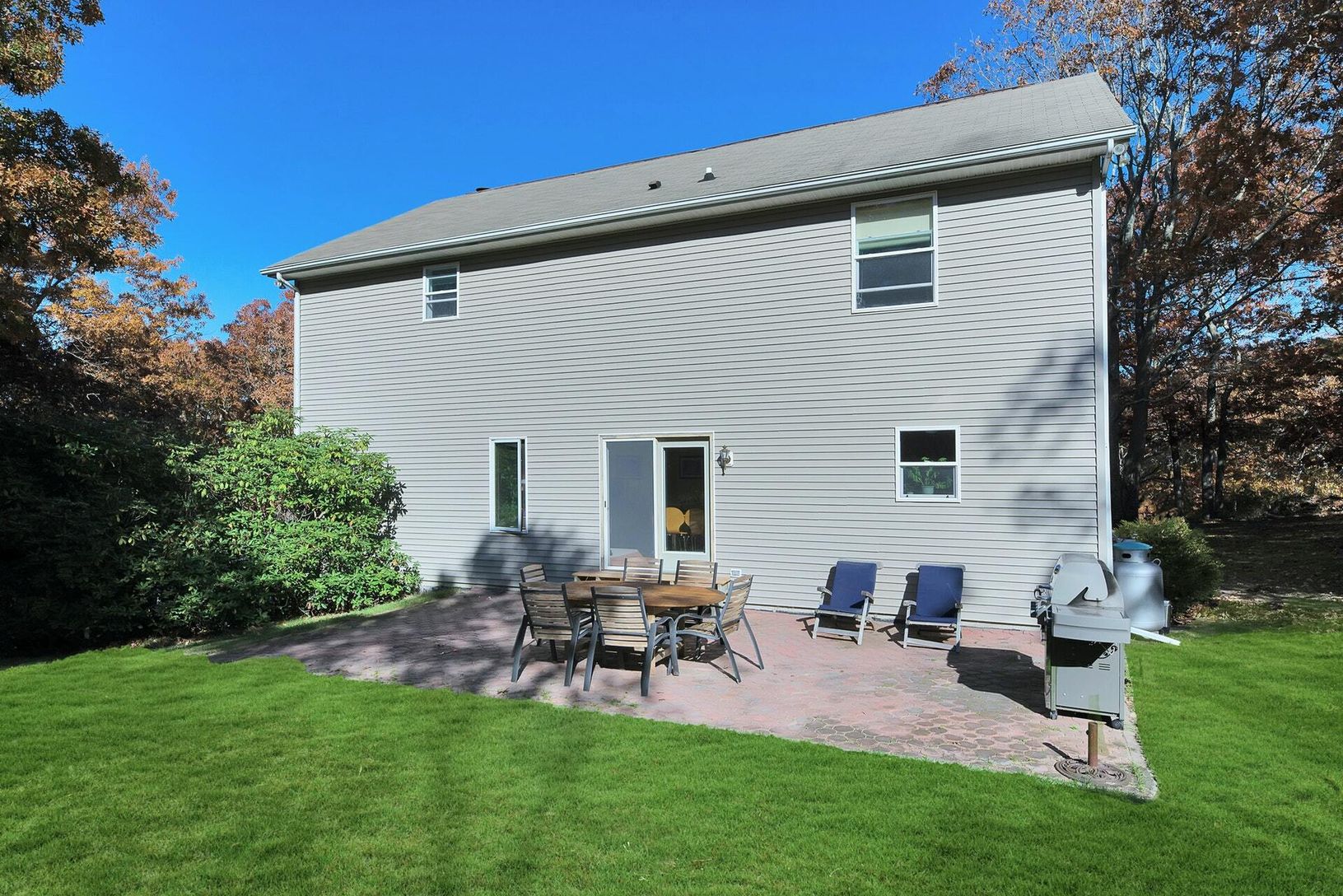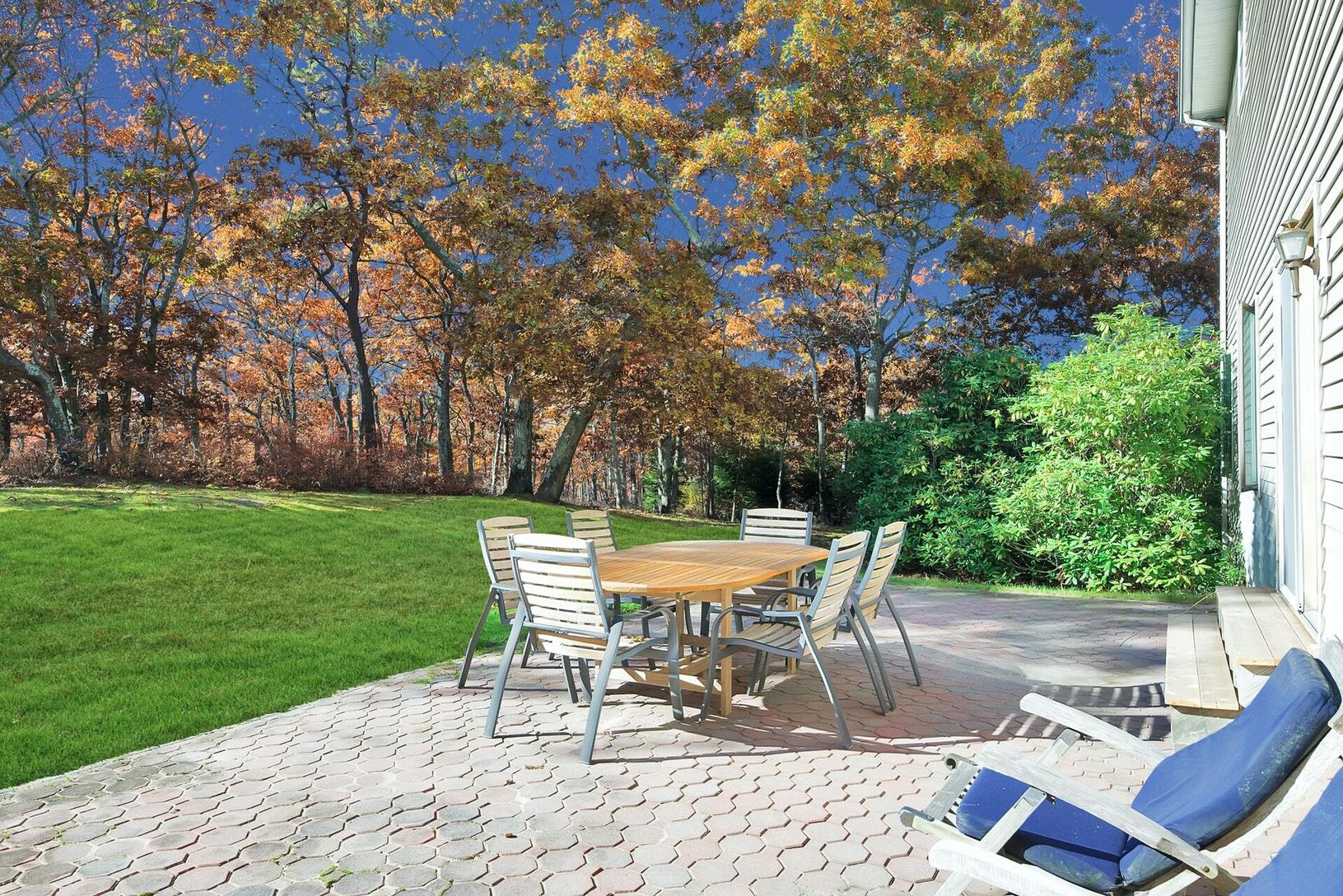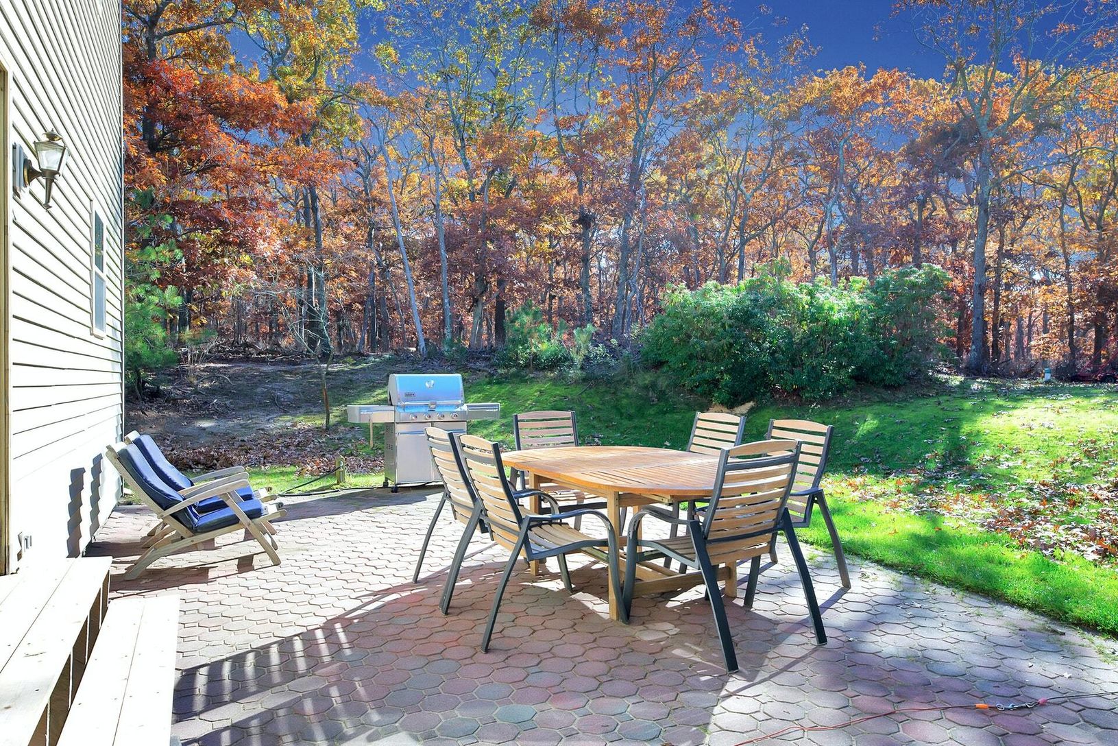 Peaceful tranquility awaits you in this beautiful Post Modern home in desirable Red Creek Ridge in Hampton Bays. Almost an acre of property that backs up to town preserved land makes this an amazing private retreat. The home boasts a large living room with a fireplace, eat in kitchen and great room, formal dining room, four bedrooms, two and a half bathrooms. Step outdoor to your beautiful patio with plenty of room for a pool and endless views