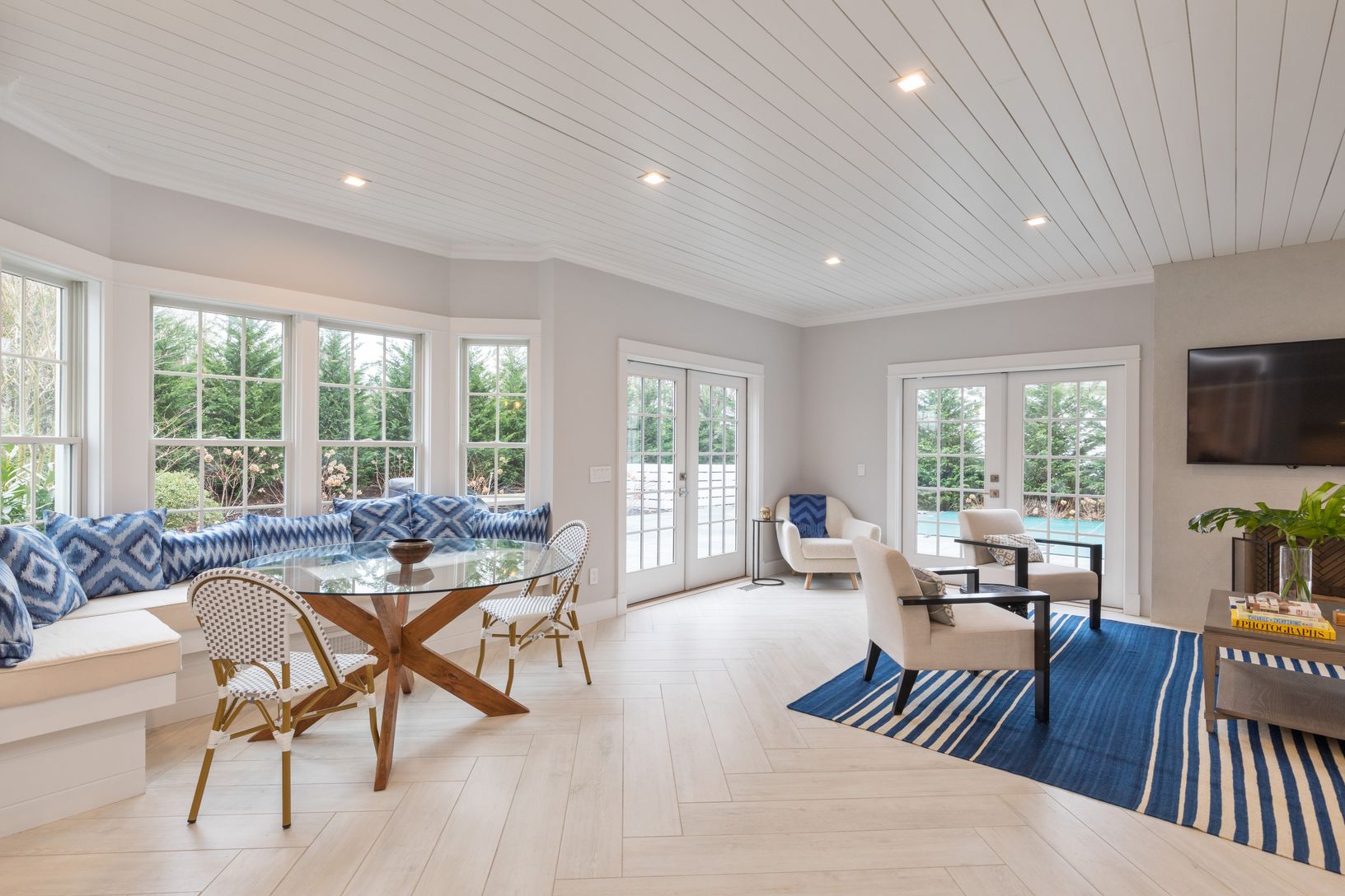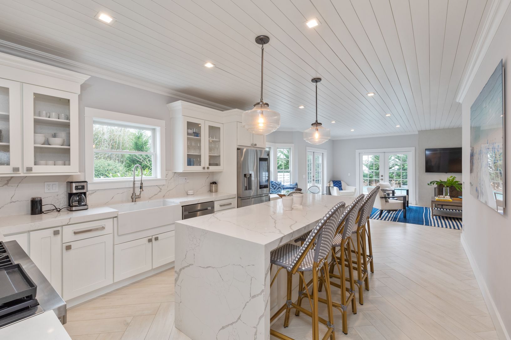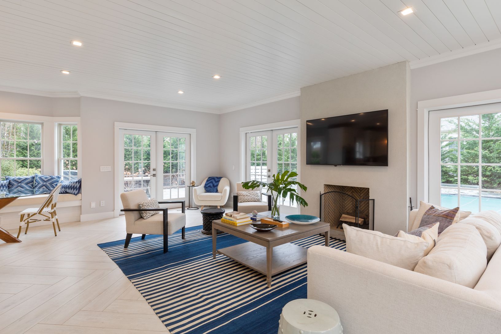 Living is easy in this beachy casual beautifully designed and crafted home Be the first to rent this tastefully furnished and light-filled four bedroom four and a half bathroom home set on .35 acres .Home has living area with fireplace flows through to a sleek and stylish center island gourmet kitchen and separate dining room. The living area's glass sliding doors open up to a spacious patio with heated,gunite saline pool with waterfall and