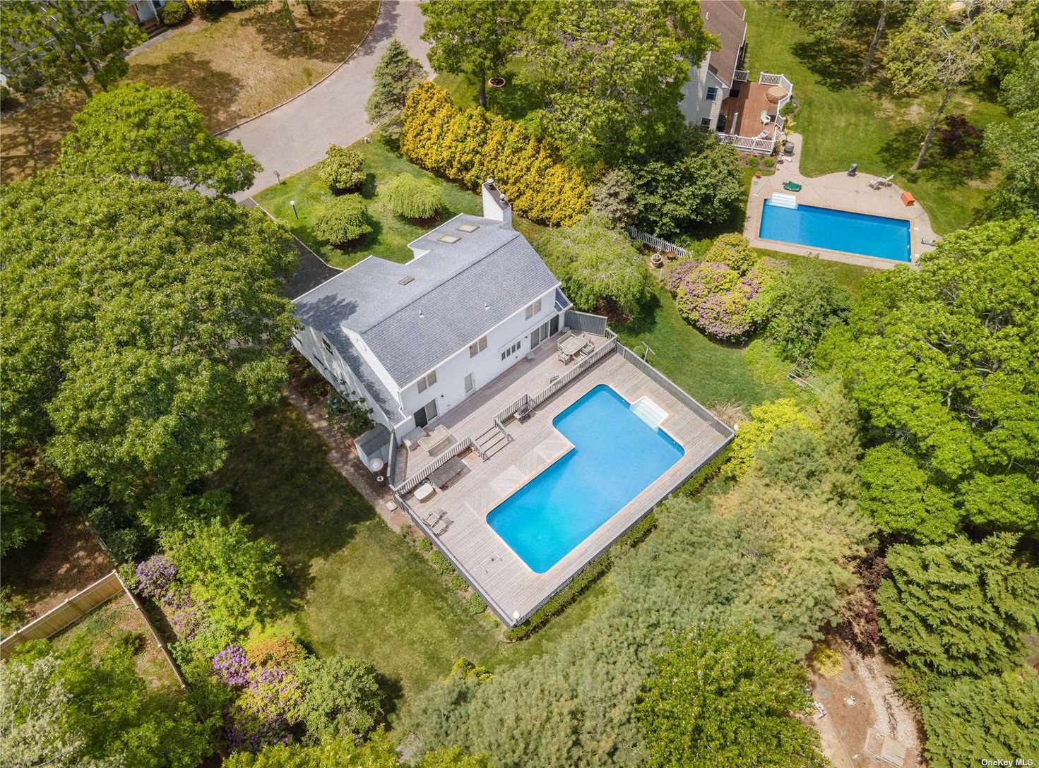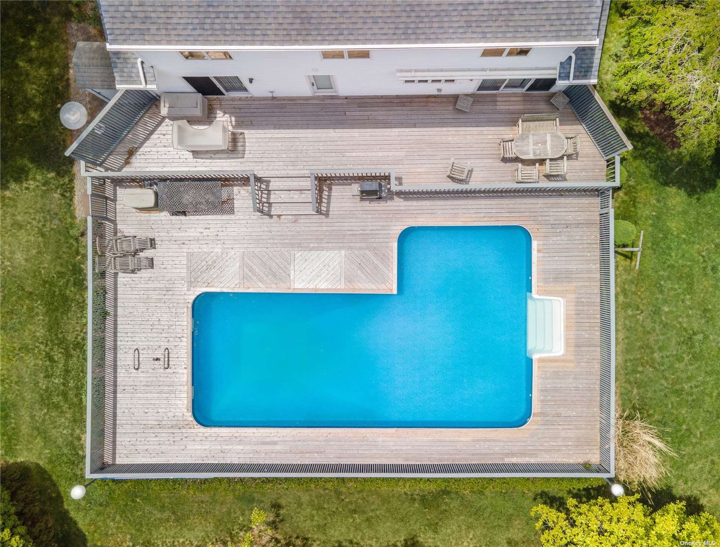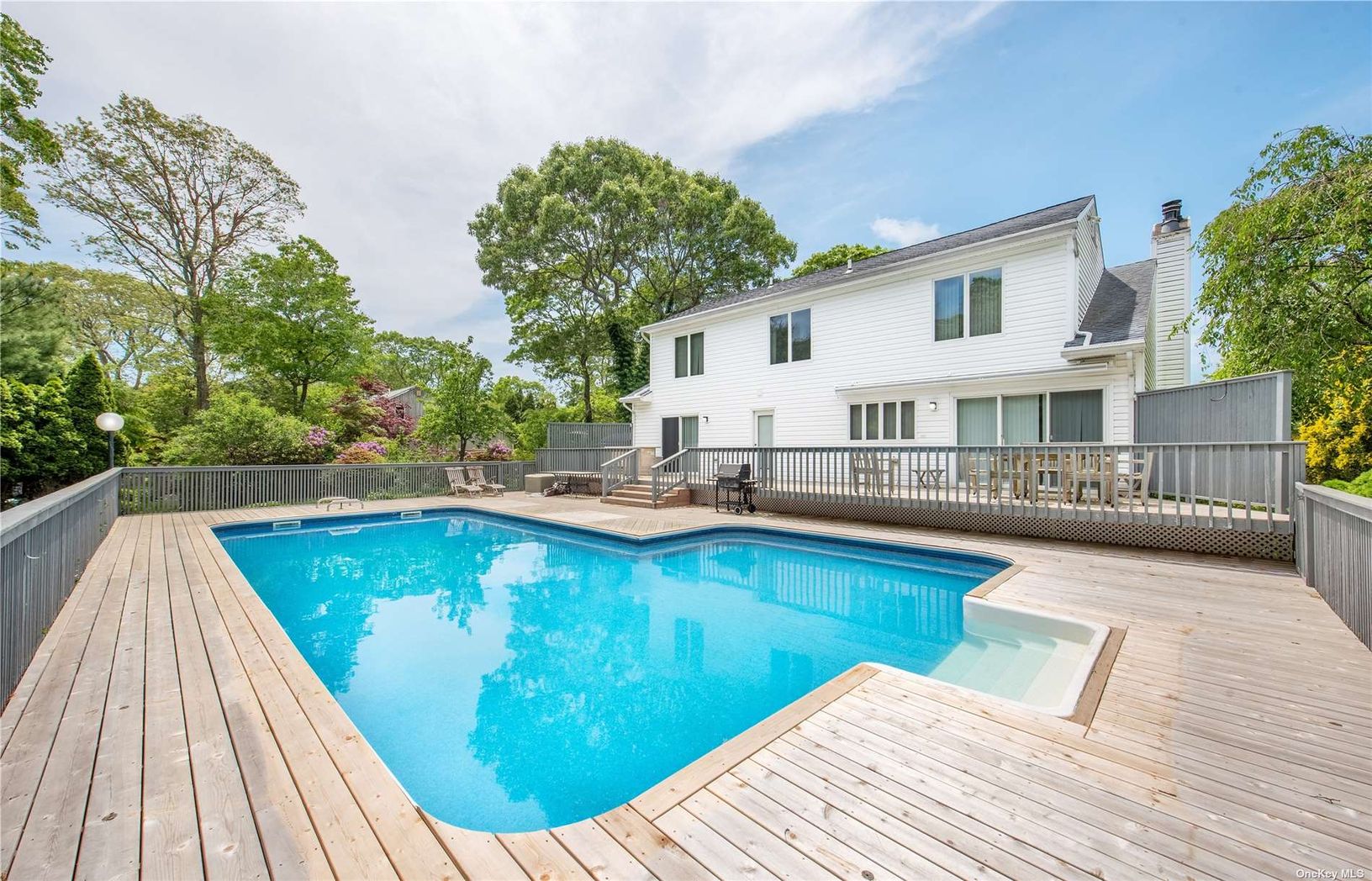 Spacious for bedroom, 2 bath two story contemporary with pool and multi level decking. Located on a shy half acre on quiet cul de sac street south of the highway. Home features multi level decking and custom in ground salt water pool. House is bright and sunny with large windows, skylights and sliding glass doors. Full basement and two car garage offer plenty of storage.