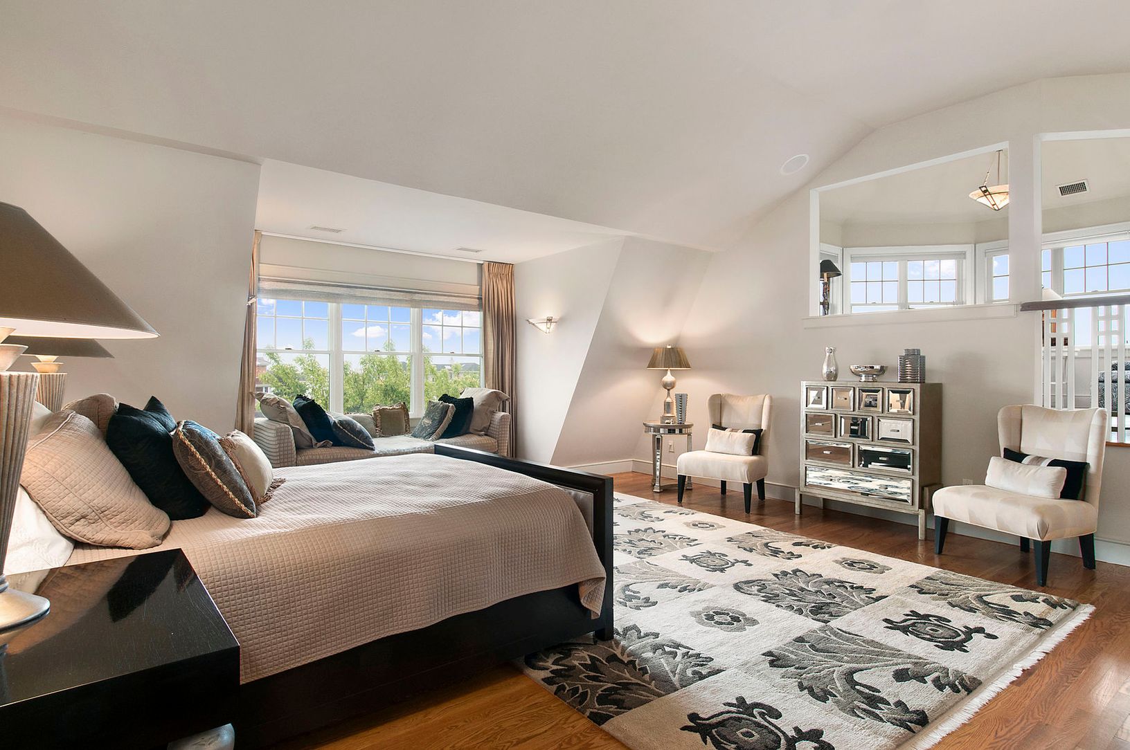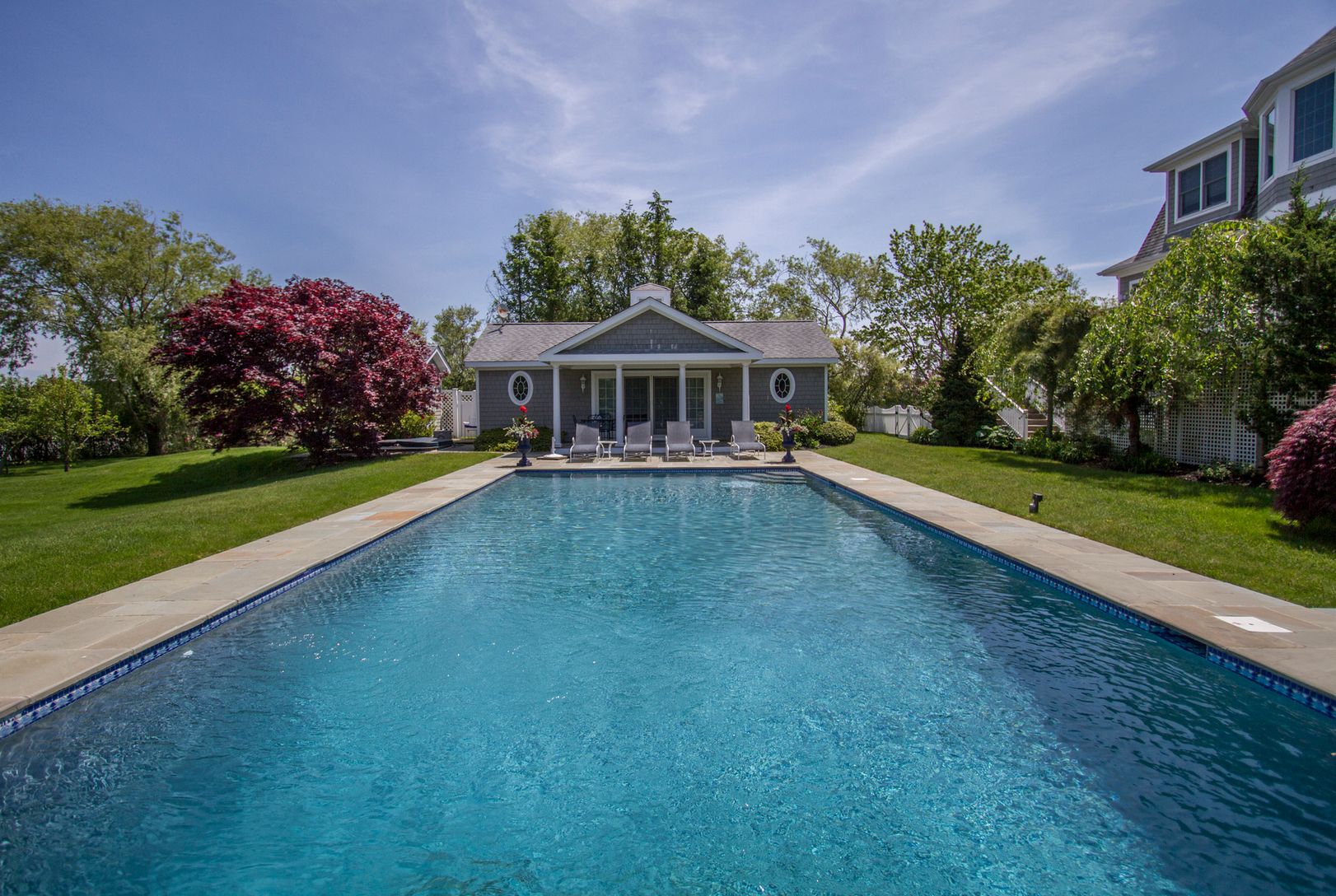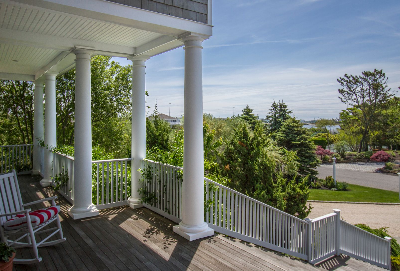 This stately Post Modern located on one of Westhampton Beach's most desirable streets offers 5,500 square feet and bay views. The spacious foyer with vaulted ceilings leads to the light filled living room. Cozy media room, large dining room, custom eat-in kitchen with granite counters and high end appliances. The first floor also offers serene sunroom, two guest bedrooms with one bath. The grand master suite offers tiered sitting area and wate
