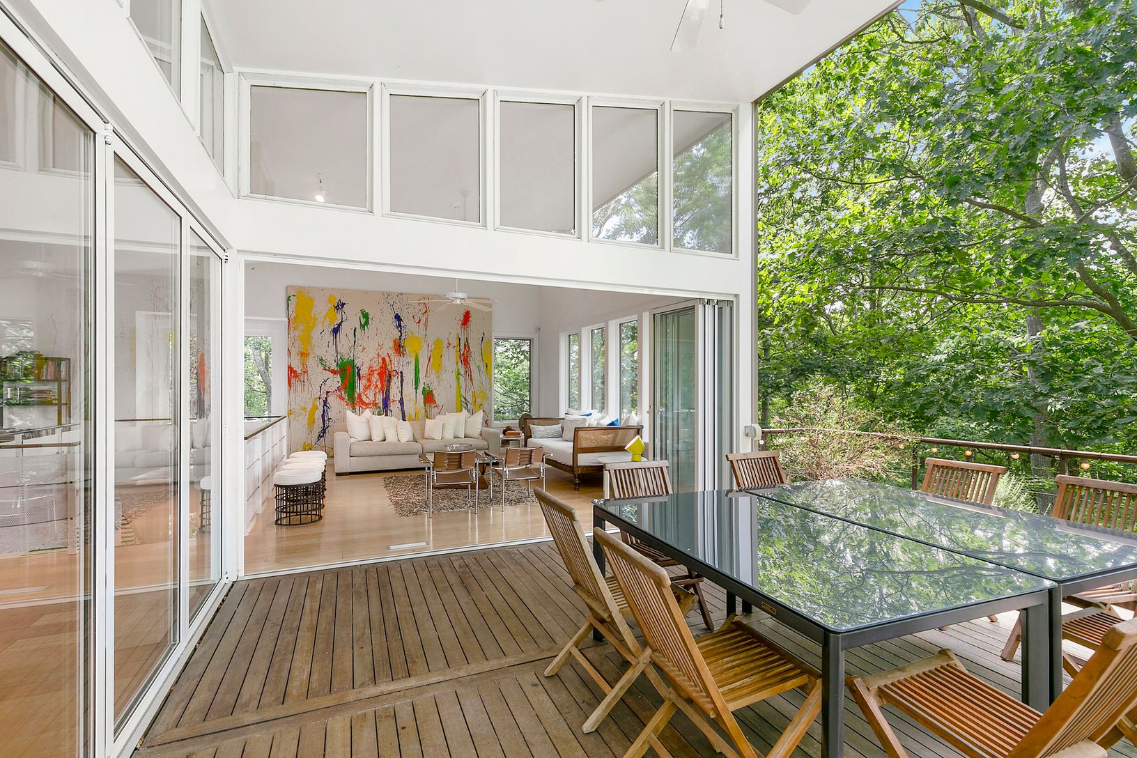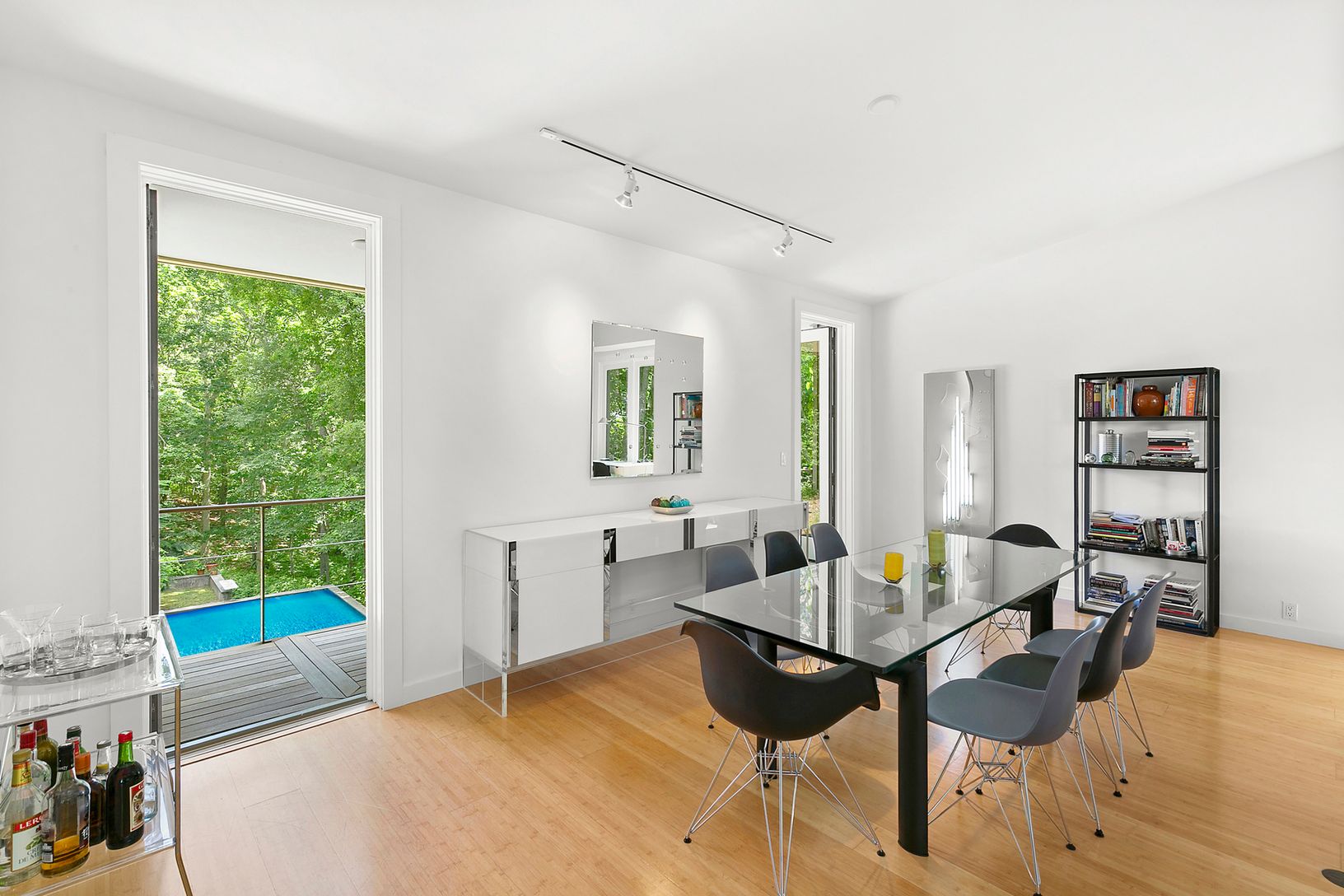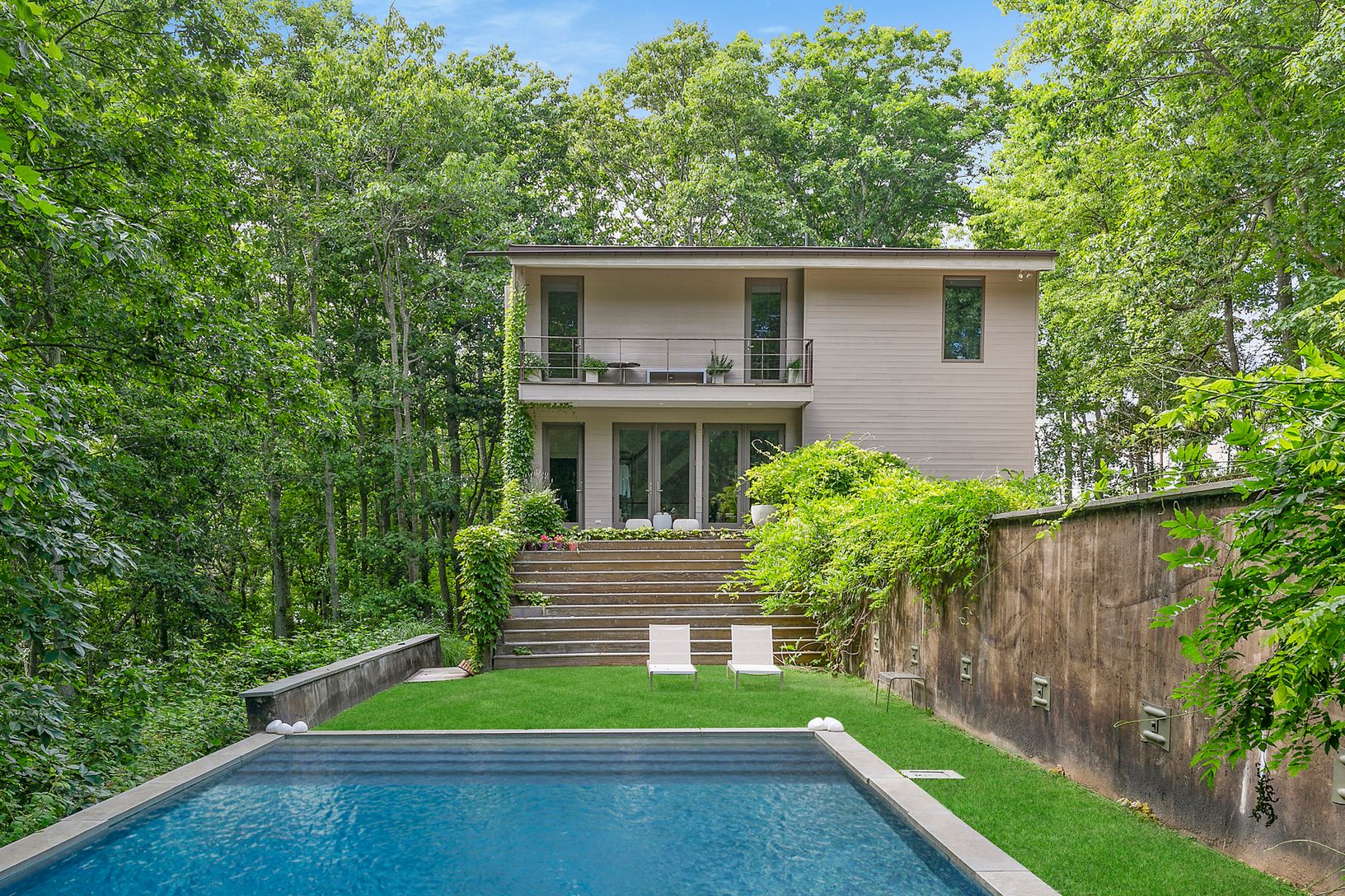 Simply Perfect Modern on Very Private Acre. Open Living Room, Dining Room and Eat-In Kitchen. w/dramatic glass walls. Overlooking a spacious mahogany dining deck in the treetops. Master Bedroom en suite with Balcony. Three additional en suite bedrooms, two lead to pool. Inground 18x36 Gunite pool & outdoor shower. One of the highest elevations on Shelter Island. Near beach, dining, golf.