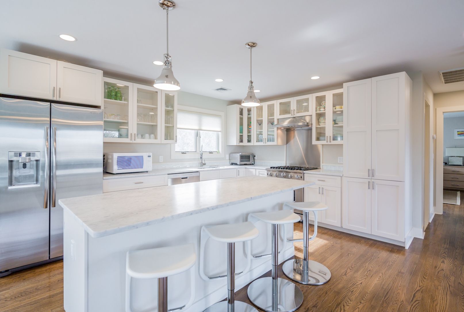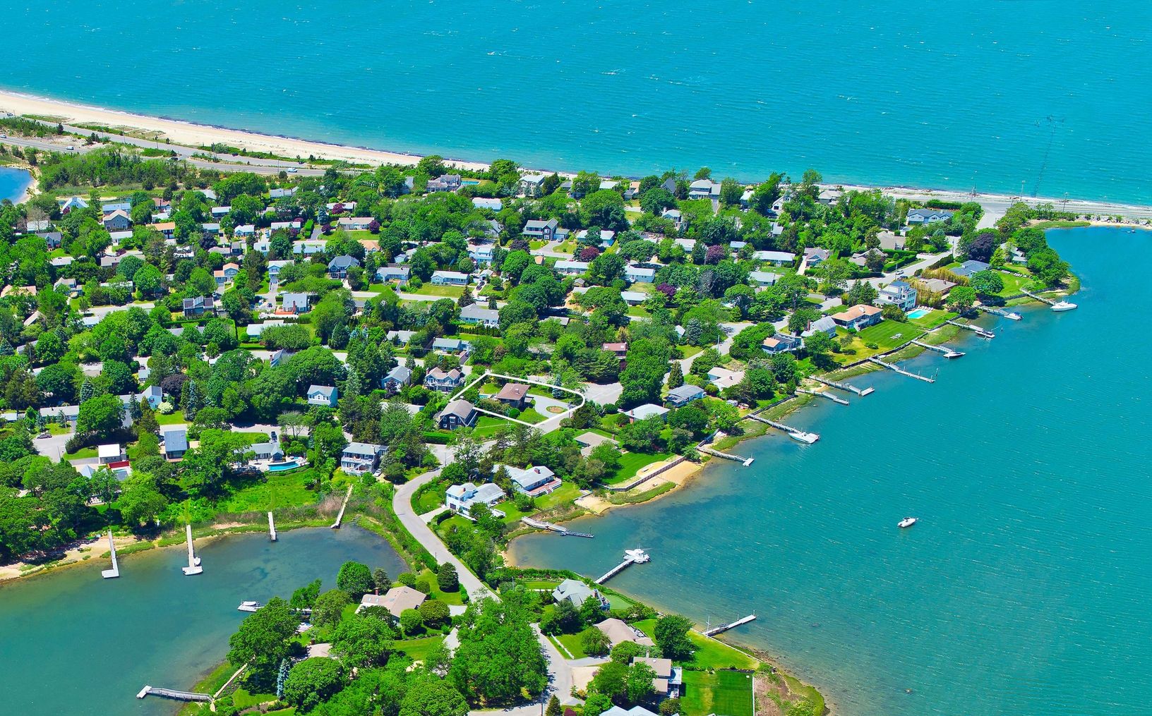 Beautifully renovated 4 bedroom, 3.5 bathroom home in Bay Point, Sag Harbor. The first floor has three guest bedrooms, two bathrooms, and a laundry room. The second floor has an open living room with partial water views, a dining room and professional kitchen with stainless steel appliances and marble countertops. The second floor also has a den, a powder room and the master bedroom with a large marble bathroom. The dining room has sliding doo