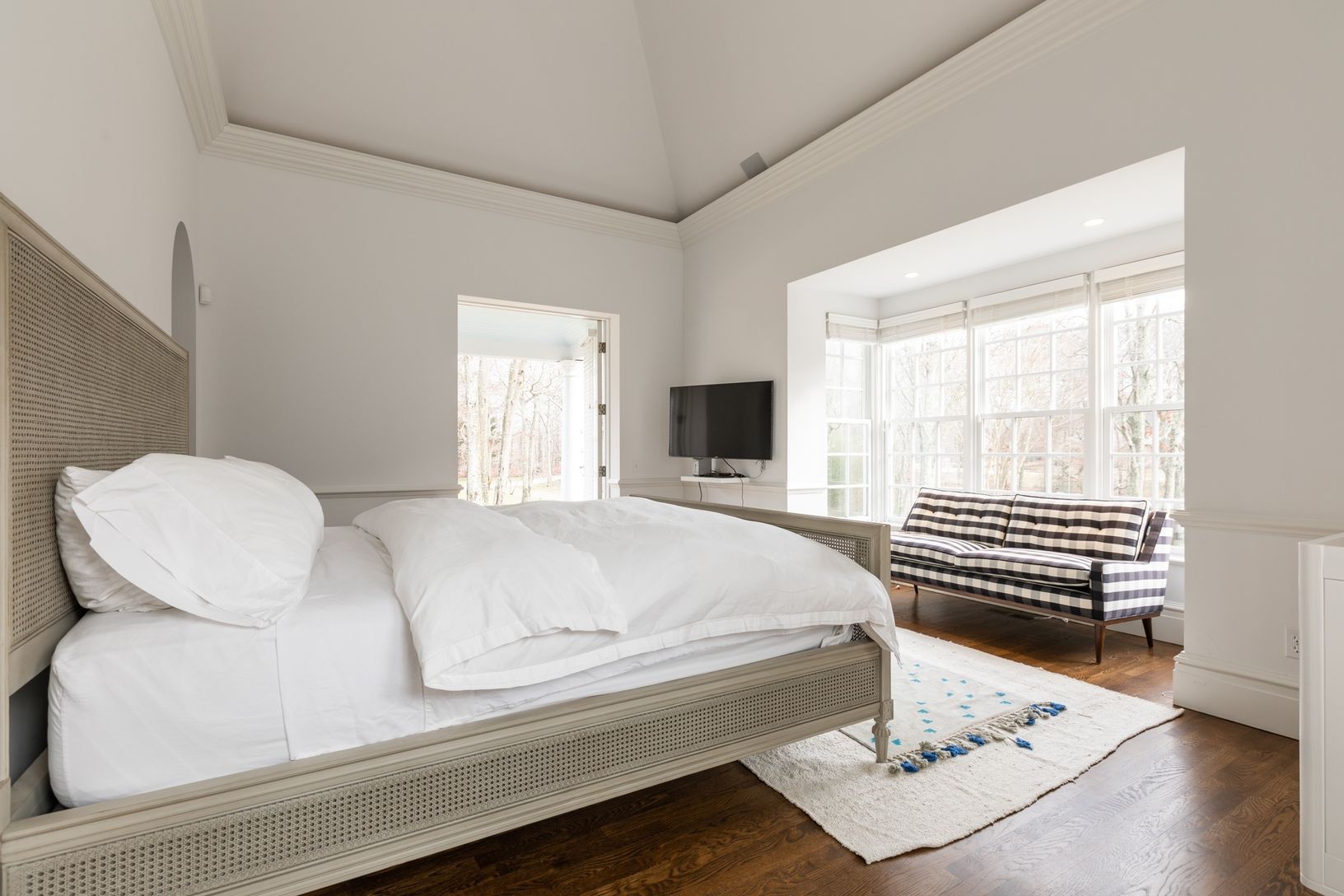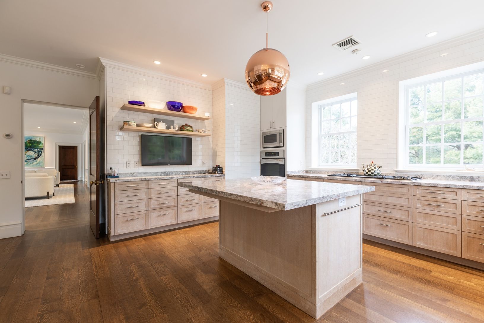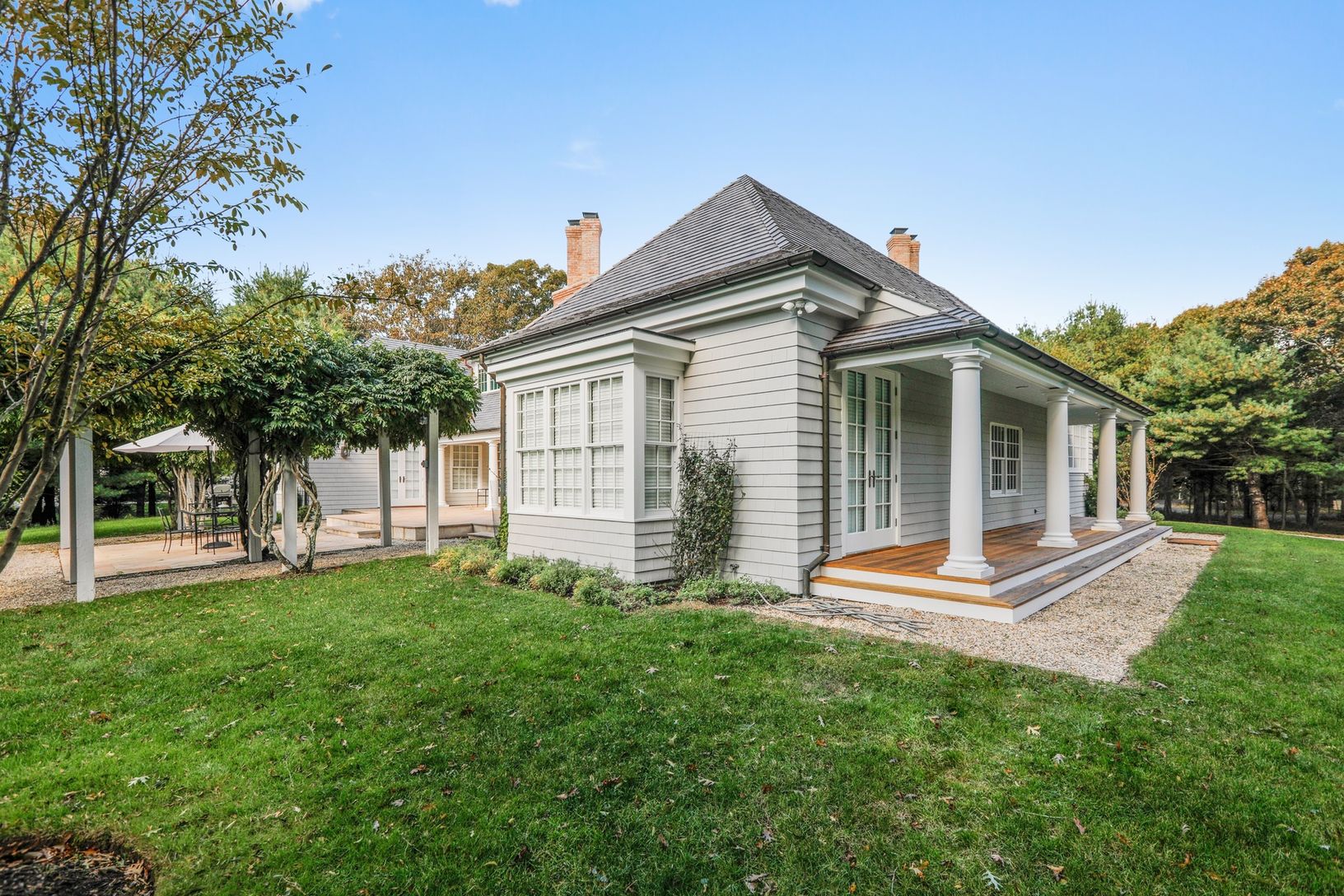Approached by a gravel driveway through rolling lawns on 4.3+/- acres, the single-story house of approximately 5,300+/- square feet is clad in grey cedar shingles with white trim and copper gutters. Enter the stone floored foyer through a covered porch and a pair of custom 9' high mahogany doors. The tall ceiling is pitched with a pair of skylights. Ahead is an arched opening affording access to a large living room with 10' ceilings, a marble