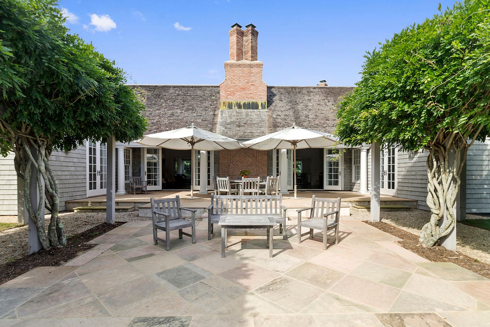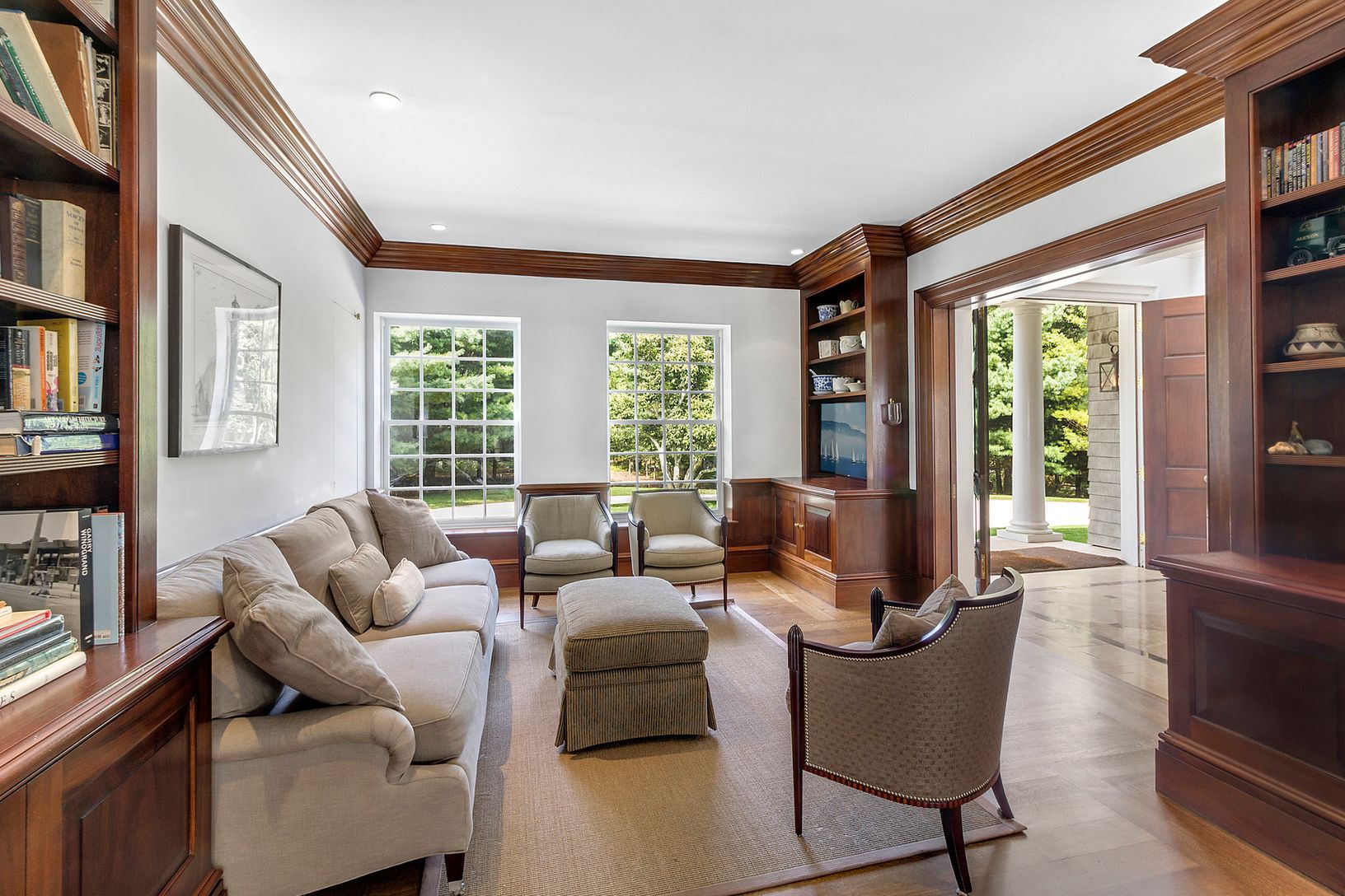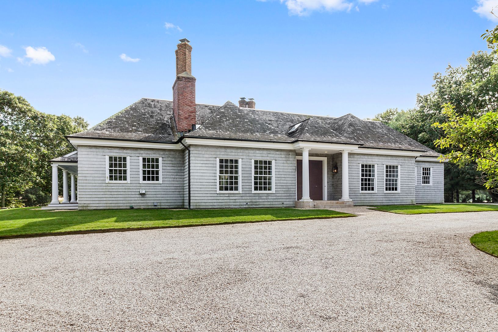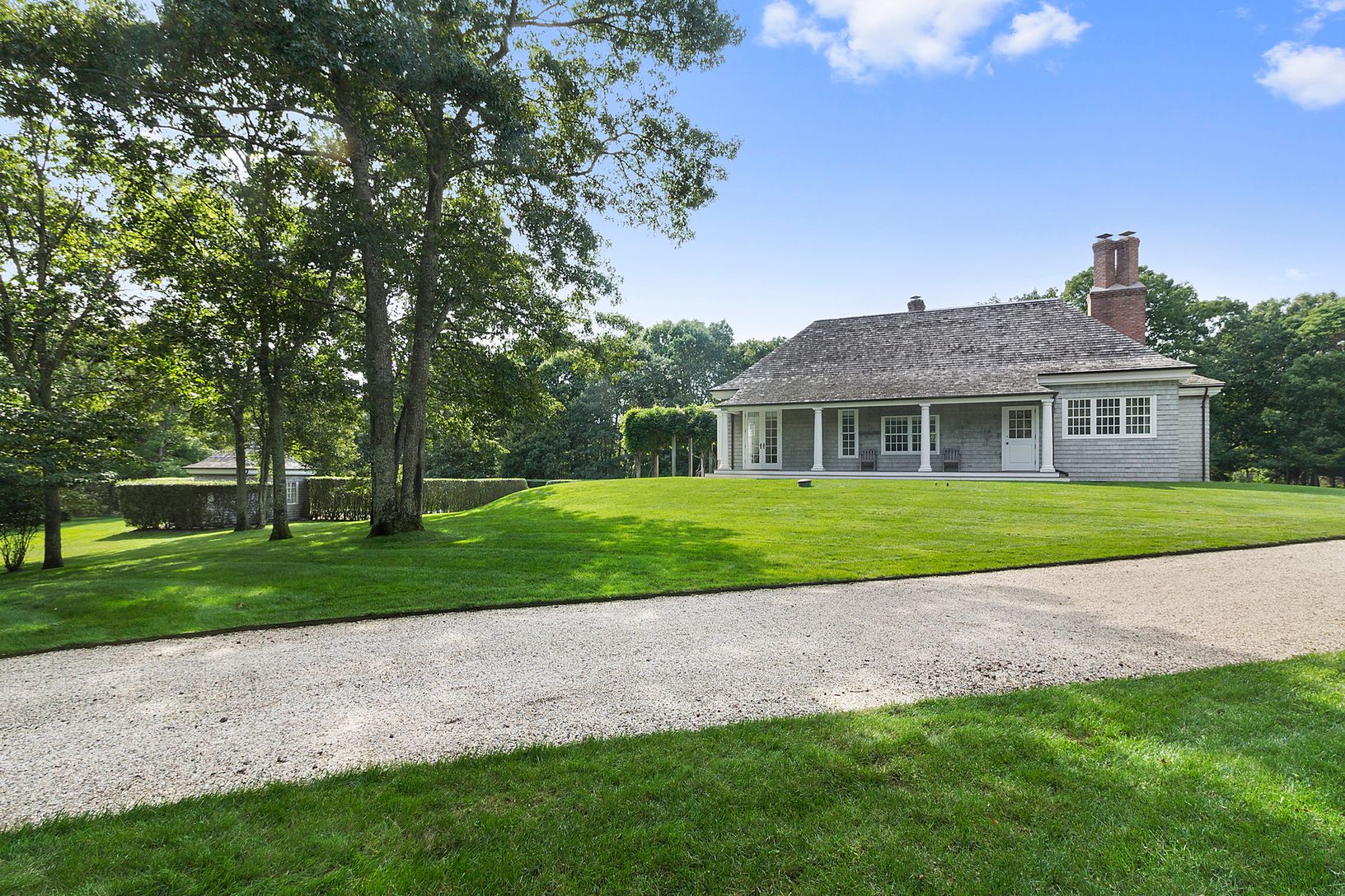 Approached by a gravel driveway through rolling lawns on 4.3 acres, the single story house of approximately 3,300 square feet is clad in grey cedar shingles with white trim and copper guttering. Enter the stone floored foyer through a covered porch and a pair of custom 9' high mahogany doors. The tall ceiling is pitched with a pair of skylights. Ahead is an arched opening affording access to a large living room with 10' ceilings, a marble fir