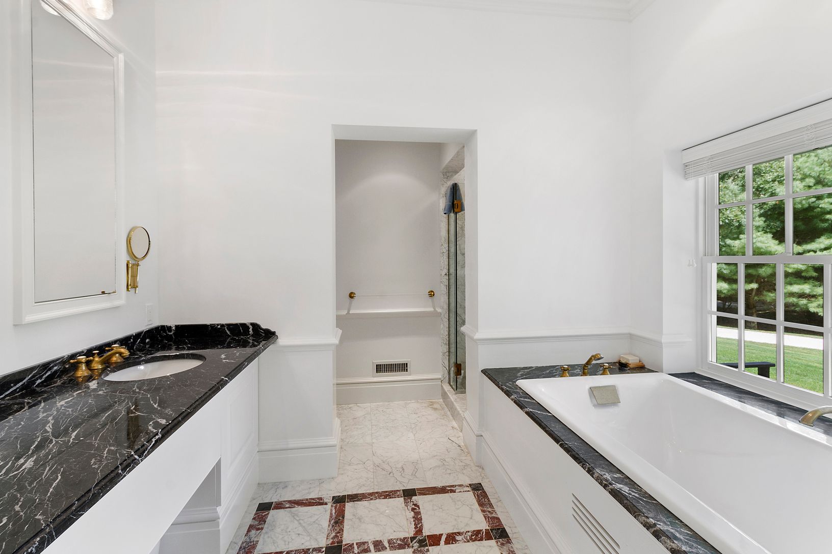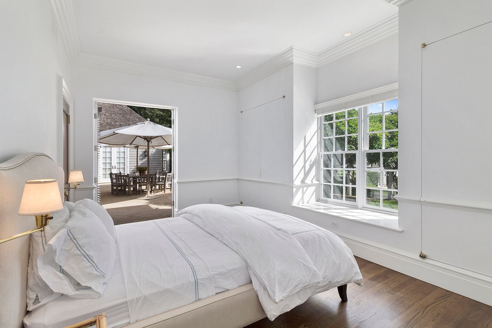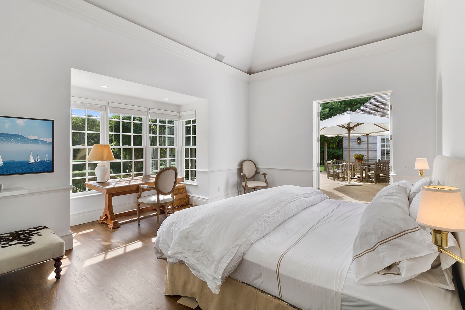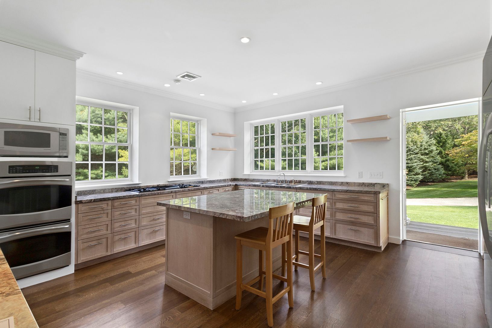 Approached by a gravel driveway through rolling lawns on 4.3 acres, the single story house of approximately 3,300 square feet is clad in grey cedar shingles with white trim and copper guttering. Enter the stone floored foyer through a covered porch and a pair of custom 9' high mahogany doors. The tall ceiling is pitched with a pair of skylights. Ahead is an arched opening affording access to a large living room with 10' ceilings, a marble fir