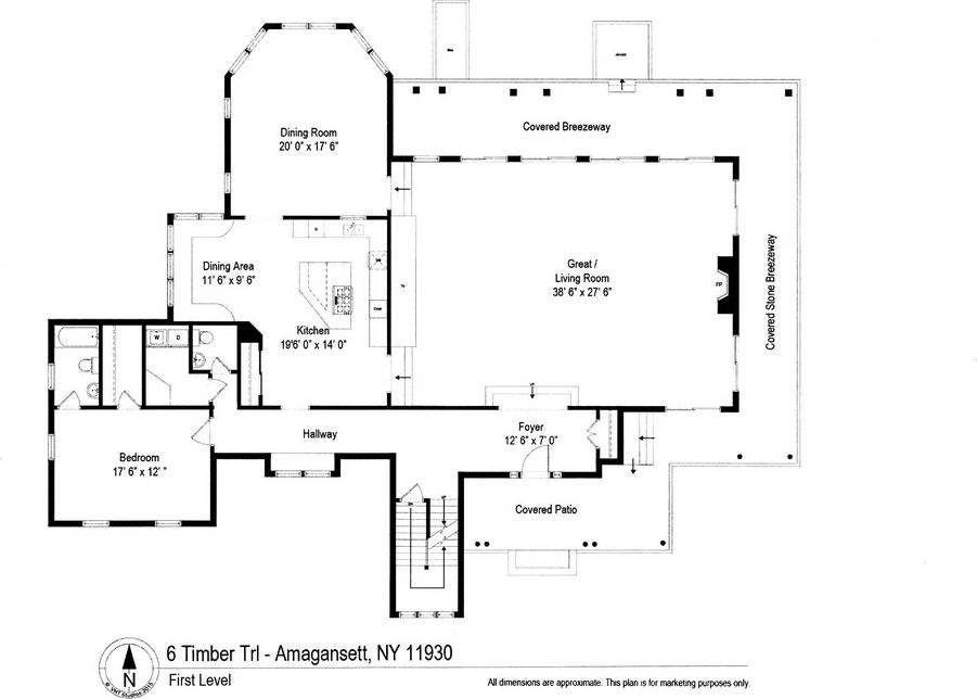 This sprawling home, in the coveted Bell Estate of Amagansett, was built with attention to detail and has custom features throughout. The 1000+ sq. ft. living room is surrounded with windows and French doors, allowing the beauty of this 1.95 acre parcel to be enjoyed throughout all seasons. Soaring 10+ ft. ceilings and wood-burning fireplace complete this gracious great room. A formal dining room shares a two-sided fireplace with the custom ki