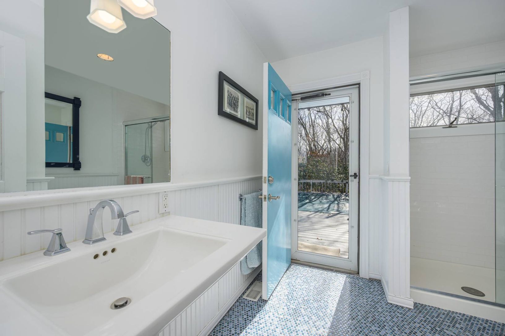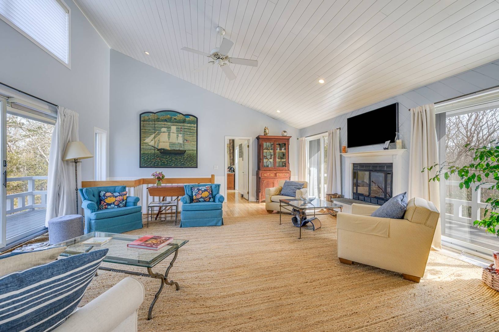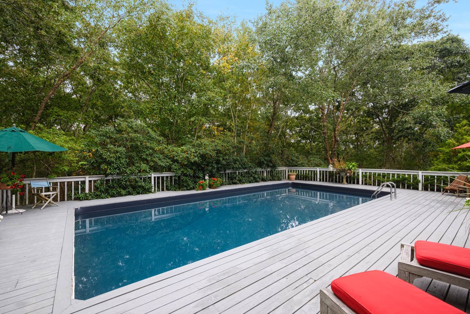 Perched on 1.25 acres with 200' elevation on a quiet cul-de-sac, WITH ROOM FOR TENNIS, the setting is strikingly serene. Ready for chic coastal contemporary living in the Hamptons with 2,738 +/- sq. ft. on 2 levels, 4-5 bedrooms, 3.5 baths, attached garage, 18'x36' pool, and room for tennis. Arrive to a dramatic second-floor living space with vaulted, shiplapped ceilings, clerestory windows, and glass doors that open to north- and south-facing