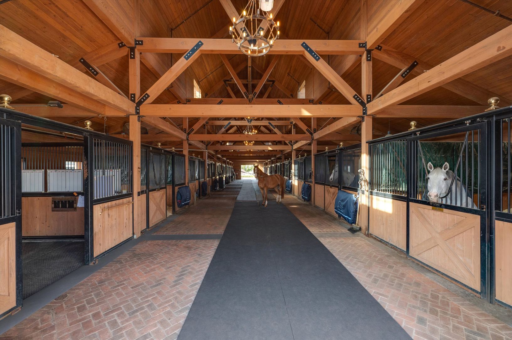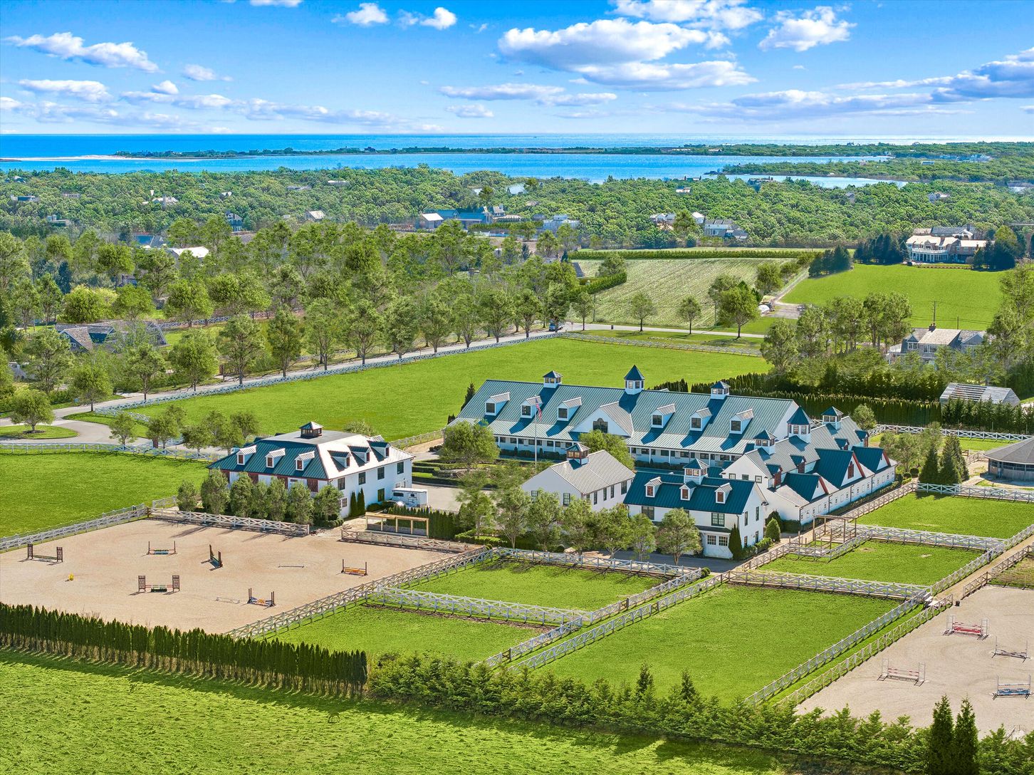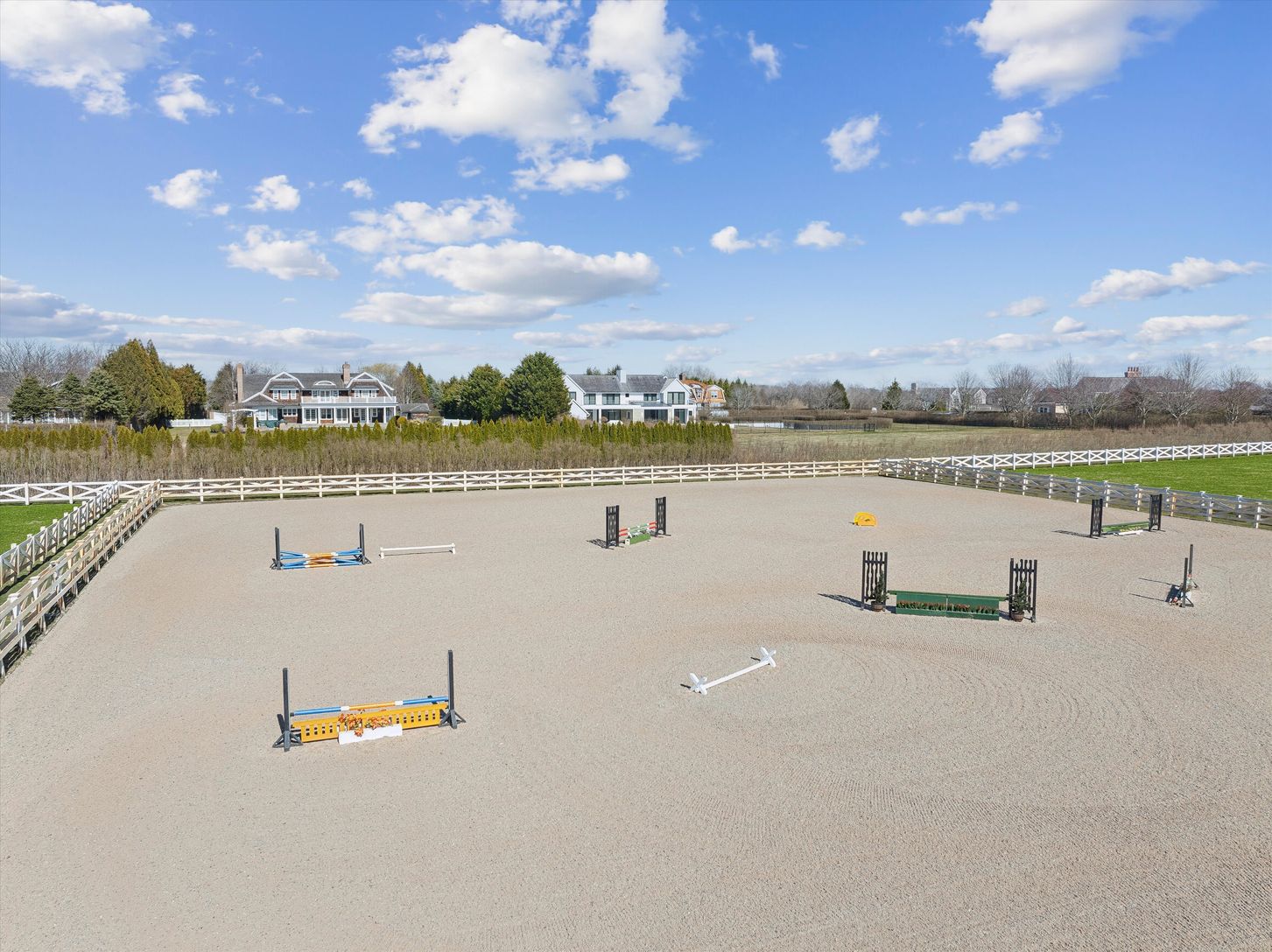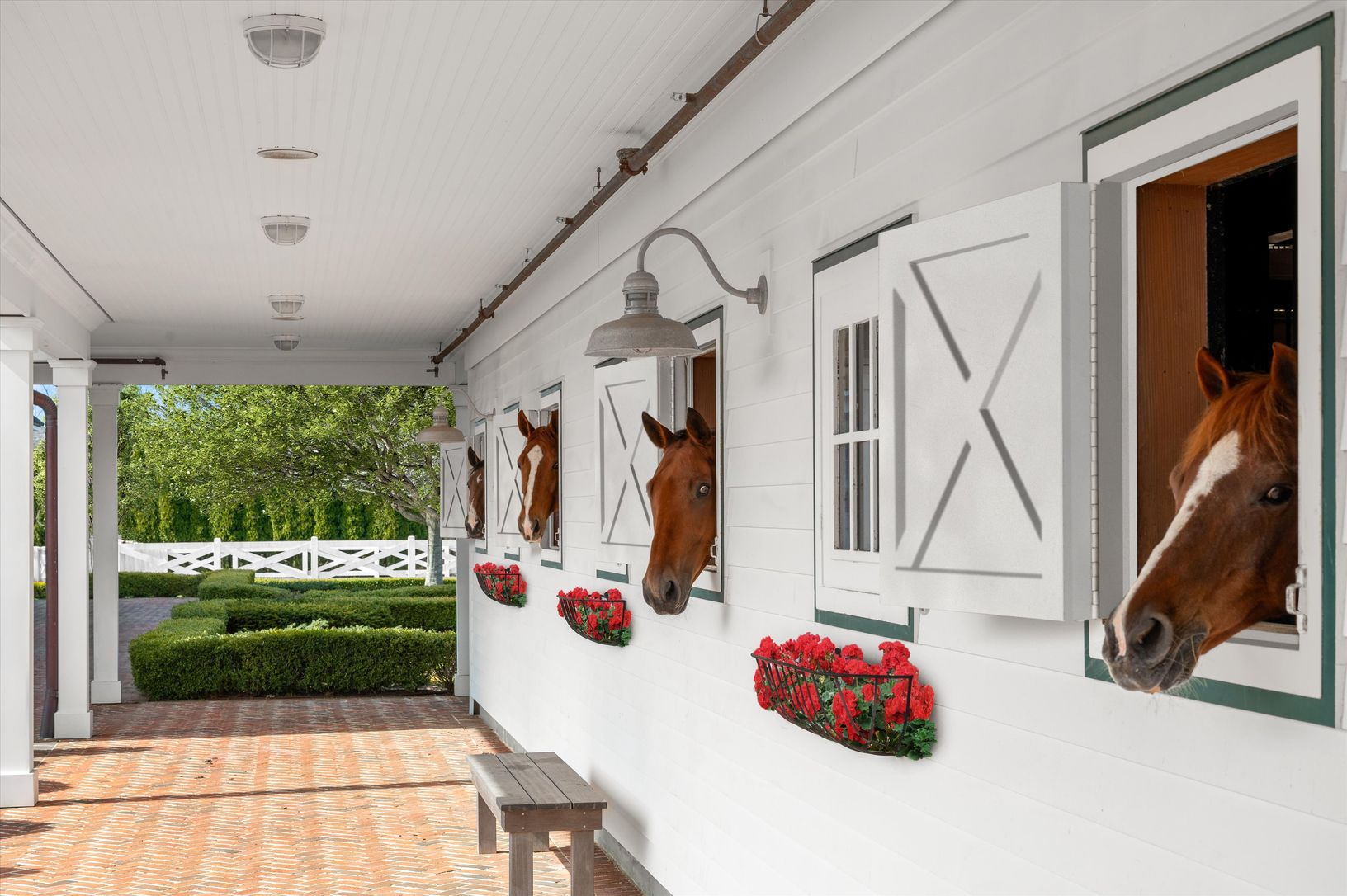 Set upon more than 19 acres of captivating landscape in Bridgehampton South, Khalily Stables stands as a prestigious equestrian sanctuary, catering to the needs of discerning competitors and passionate enthusiasts alike. This exceptional property boasts a wealth of amenities meticulously crafted to ensure unparalleled comfort and convenience for both horses and riders. With 27 spacious stalls, 15 expansive grass paddocks, and two meticulously