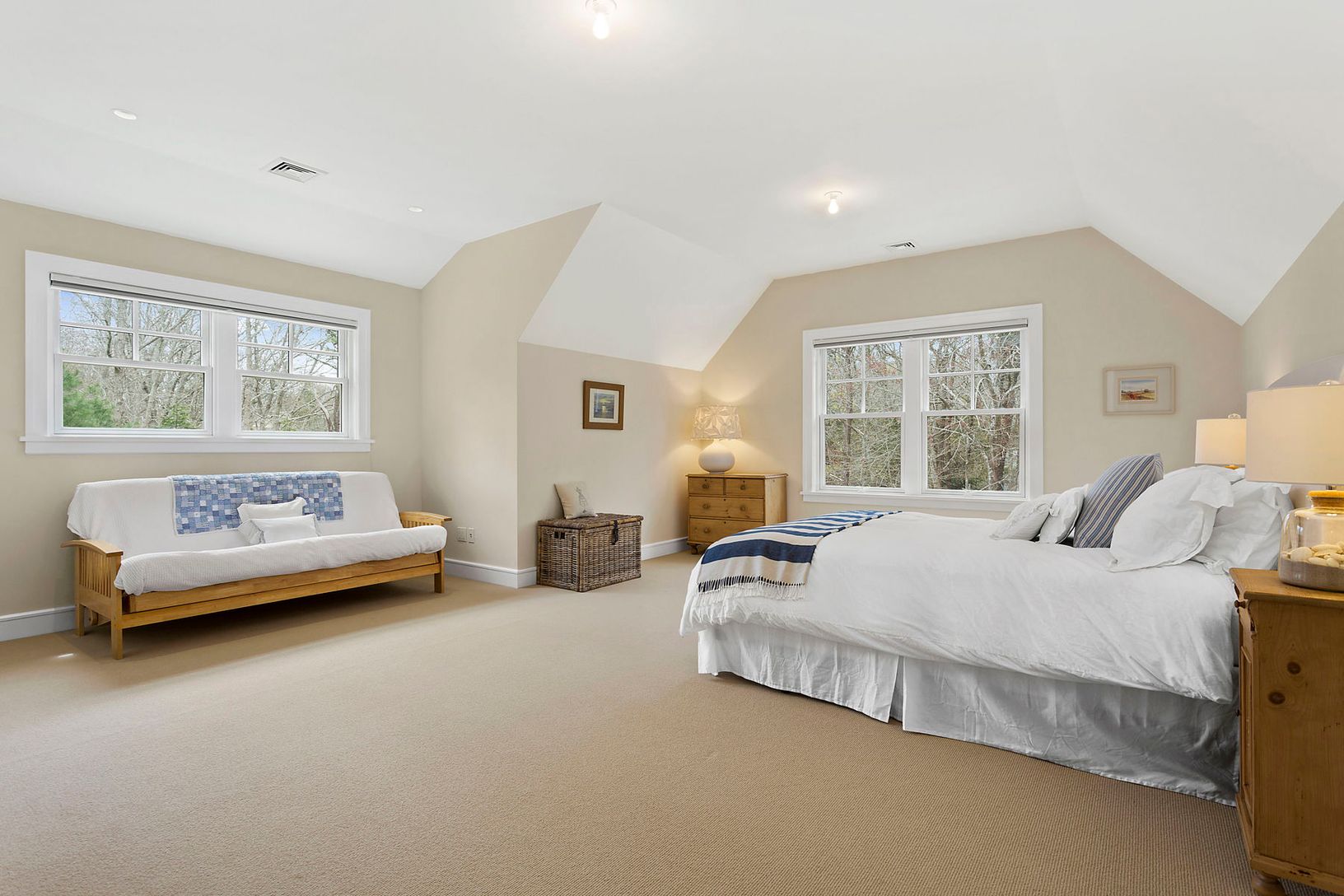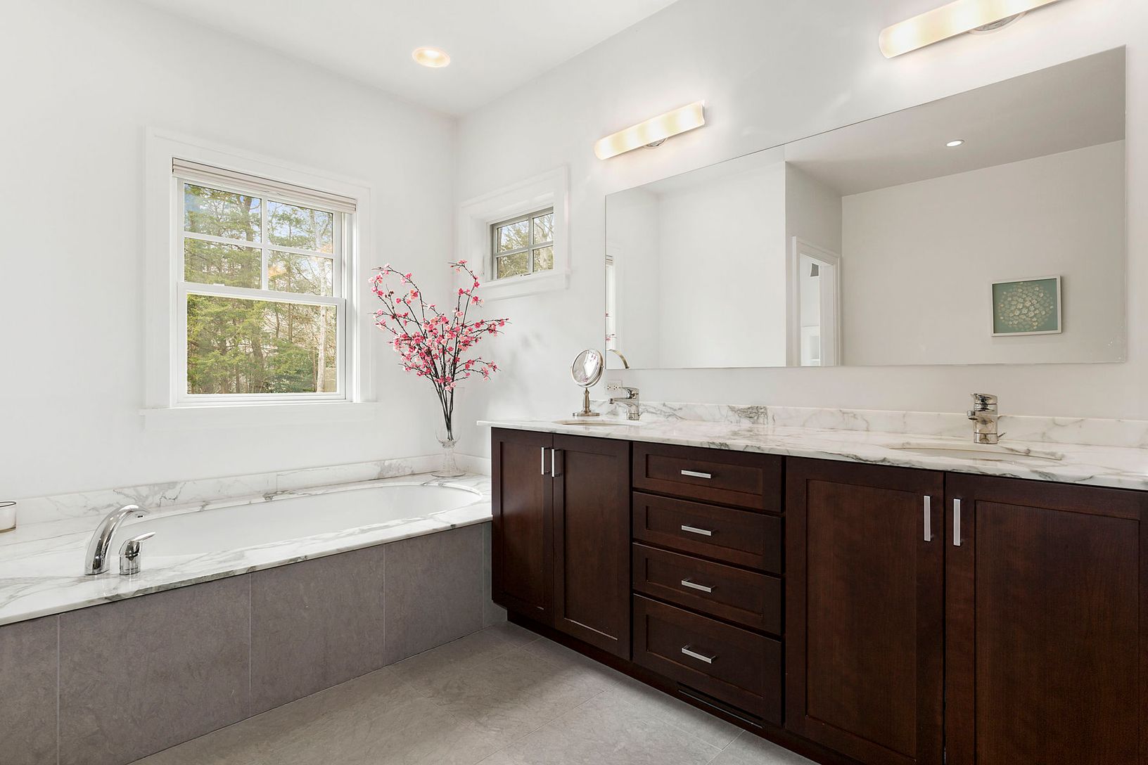 This very private 1 acre flag lot offers a builders own 4500 square foot home in a classic Post Modern style. The feel is casually elegant featuring wide planked barn wood oak floors, yet beautifully finished moldings and coffered ceilings. The open floor plan is perfect for entertaining. Grand first floor master suite. Chefs kitchen with huge island, top of the line appliances and 3 dishwashers. Formal dining room. Many built-ins throughout t