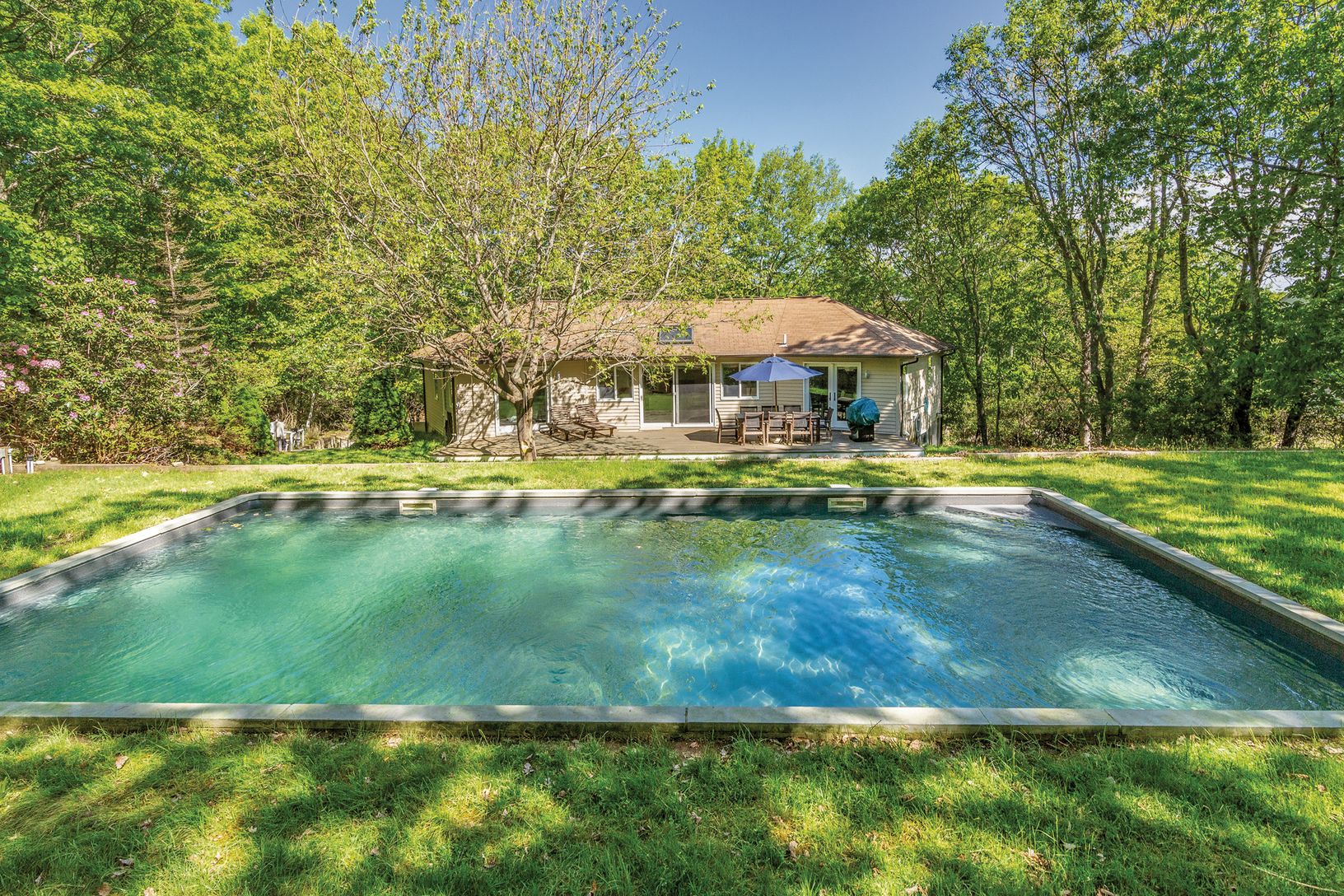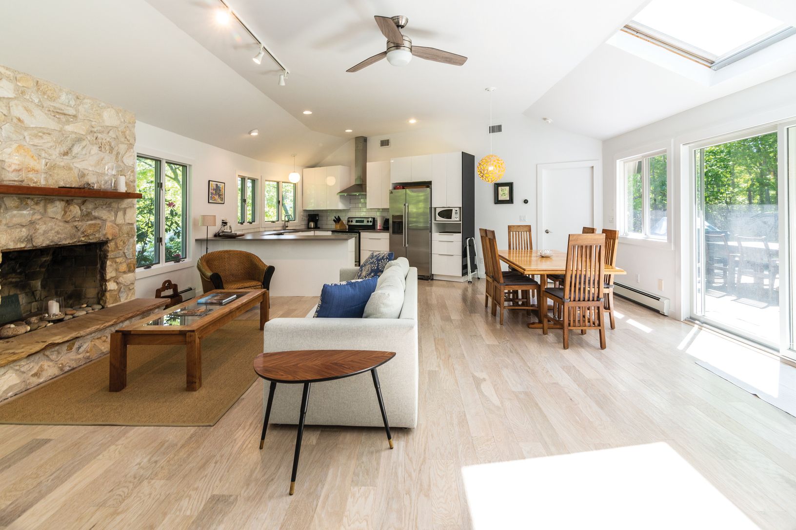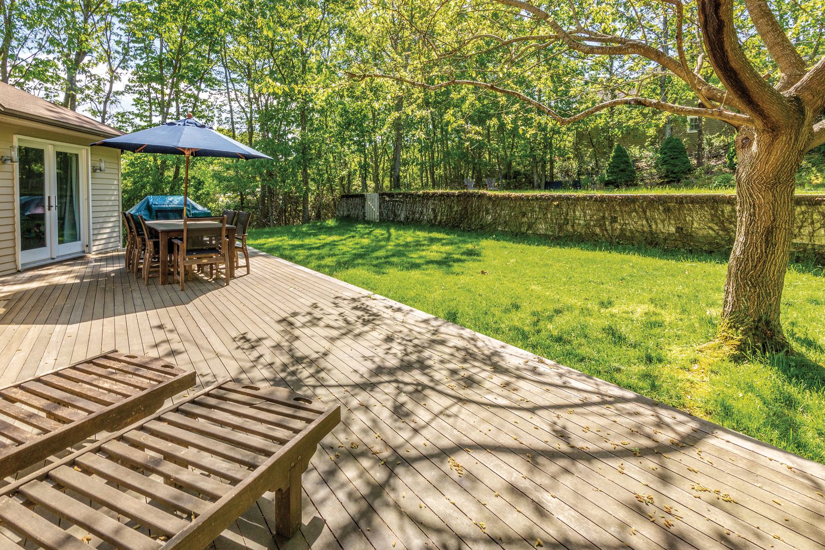 On a quiet street in Sag Harbor, this recently renovated 2,486+/- sq. ft. (including finished lower level) three bedroom, three bath traditional home on a just-shy half acre is beautifully finished and appointed, with new kitchen, baths, appliances and flooring. Contemporary light-filled open living areas with vaulted ceilings flow among a living room with fieldstone fireplace, eat-in kitchen with stainless steel appliances and subway tile bac