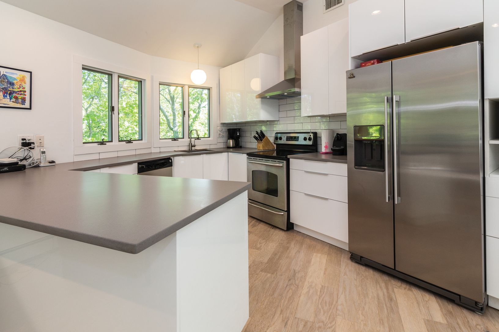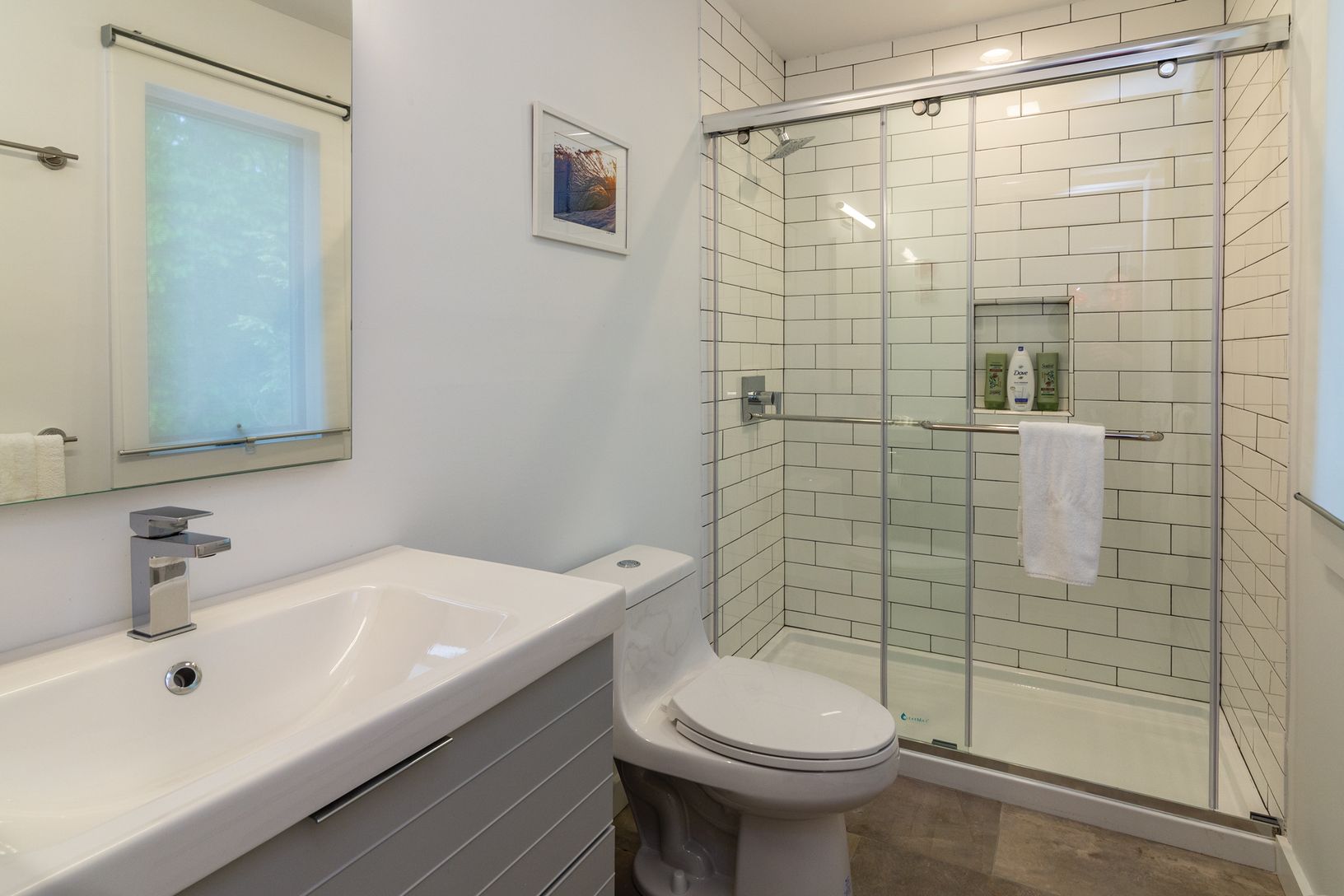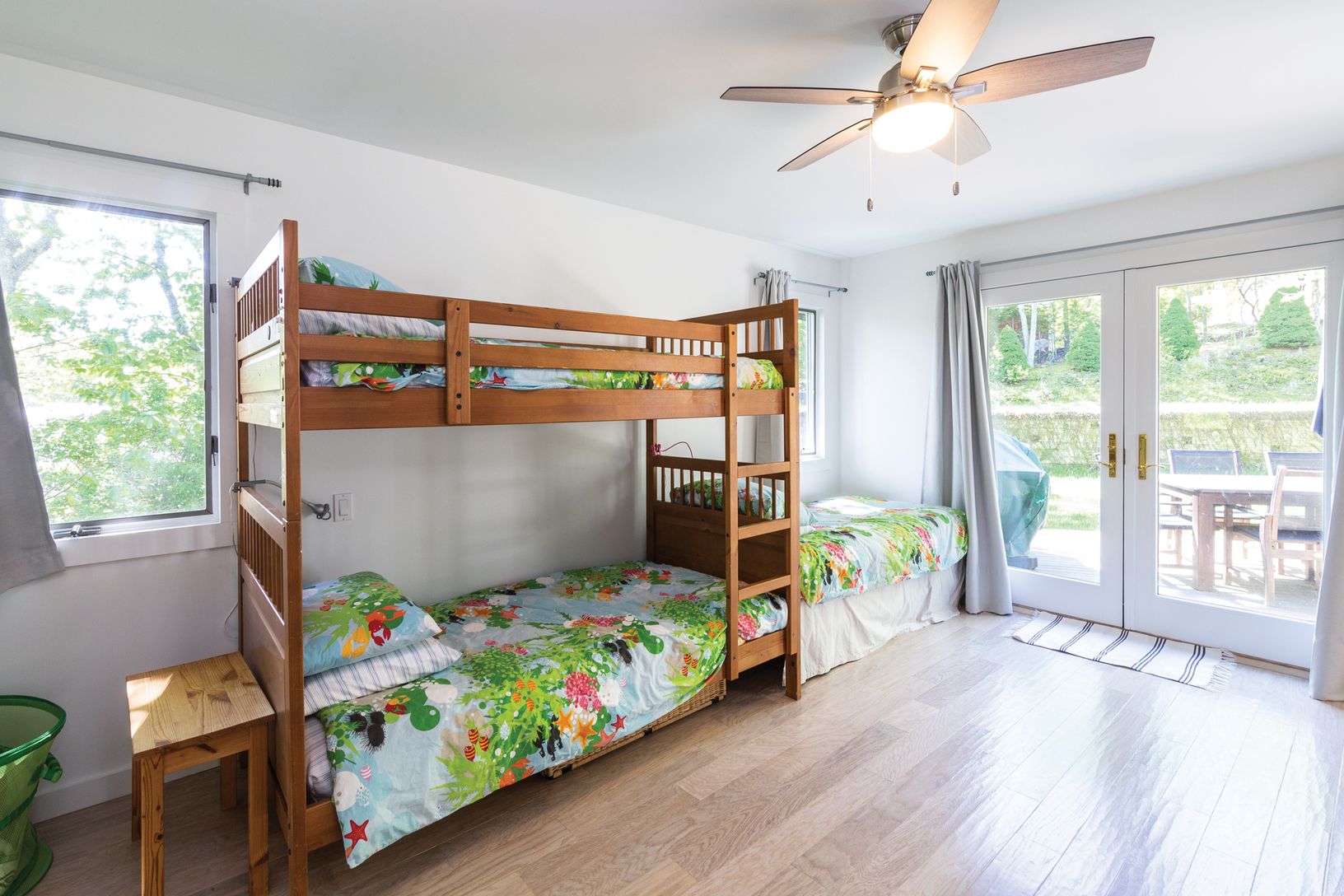 On a quiet street in Sag Harbor, this recently renovated 2,486+/- sq. ft. (including finished lower level) three bedroom, three bath traditional home on a just-shy half acre is beautifully finished and appointed, with new kitchen, baths, appliances and flooring. Contemporary light-filled open living areas with vaulted ceilings flow among a living room with fieldstone fireplace, eat-in kitchen with stainless steel appliances and subway tile bac