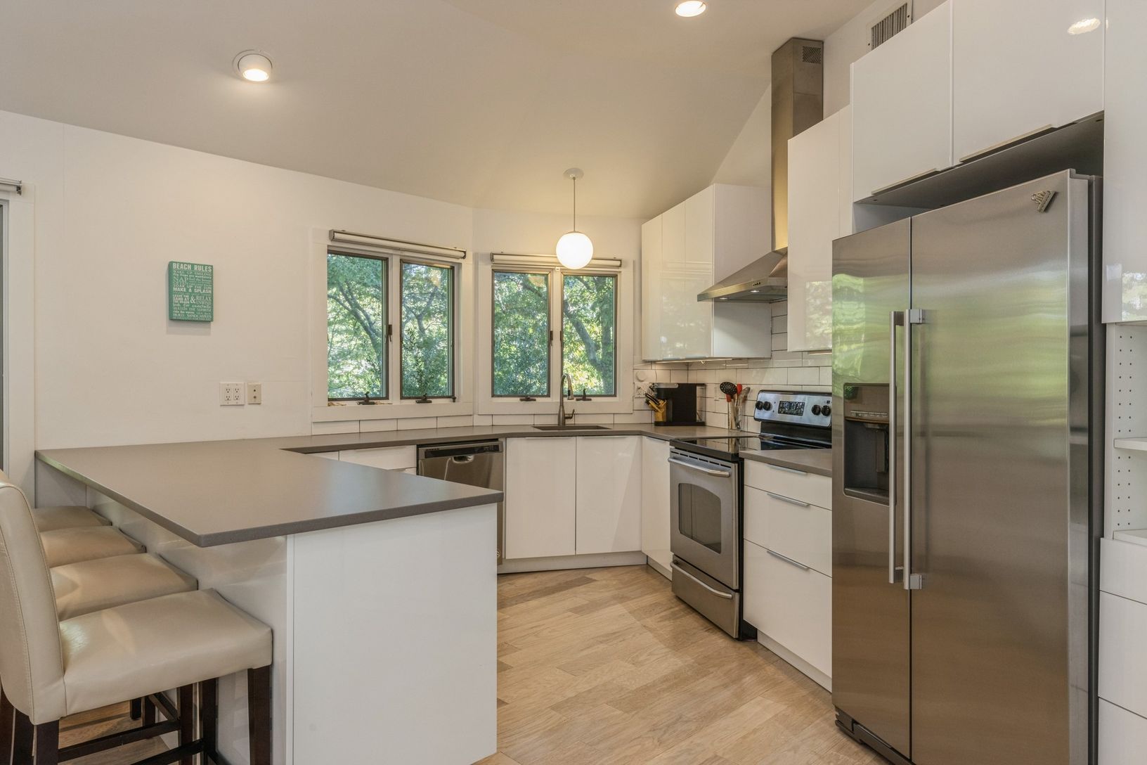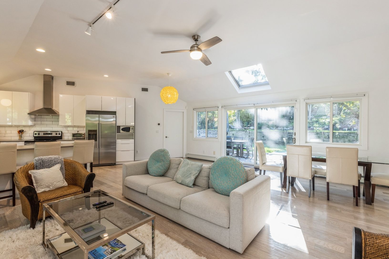On a quiet street in Sag Harbor, this recently renovated three bedroom plus home office, three bath traditional home on a just-shy half acre is beautifully finished and ready for your summer. Appointed with a new kitchen, 3 new baths, appliances and flooring. Contemporary light-filled open living areas with vaulted ceilings flow among a living room with fieldstone fireplace, eat-in kitchen with stainless steel appliances, and dining area with