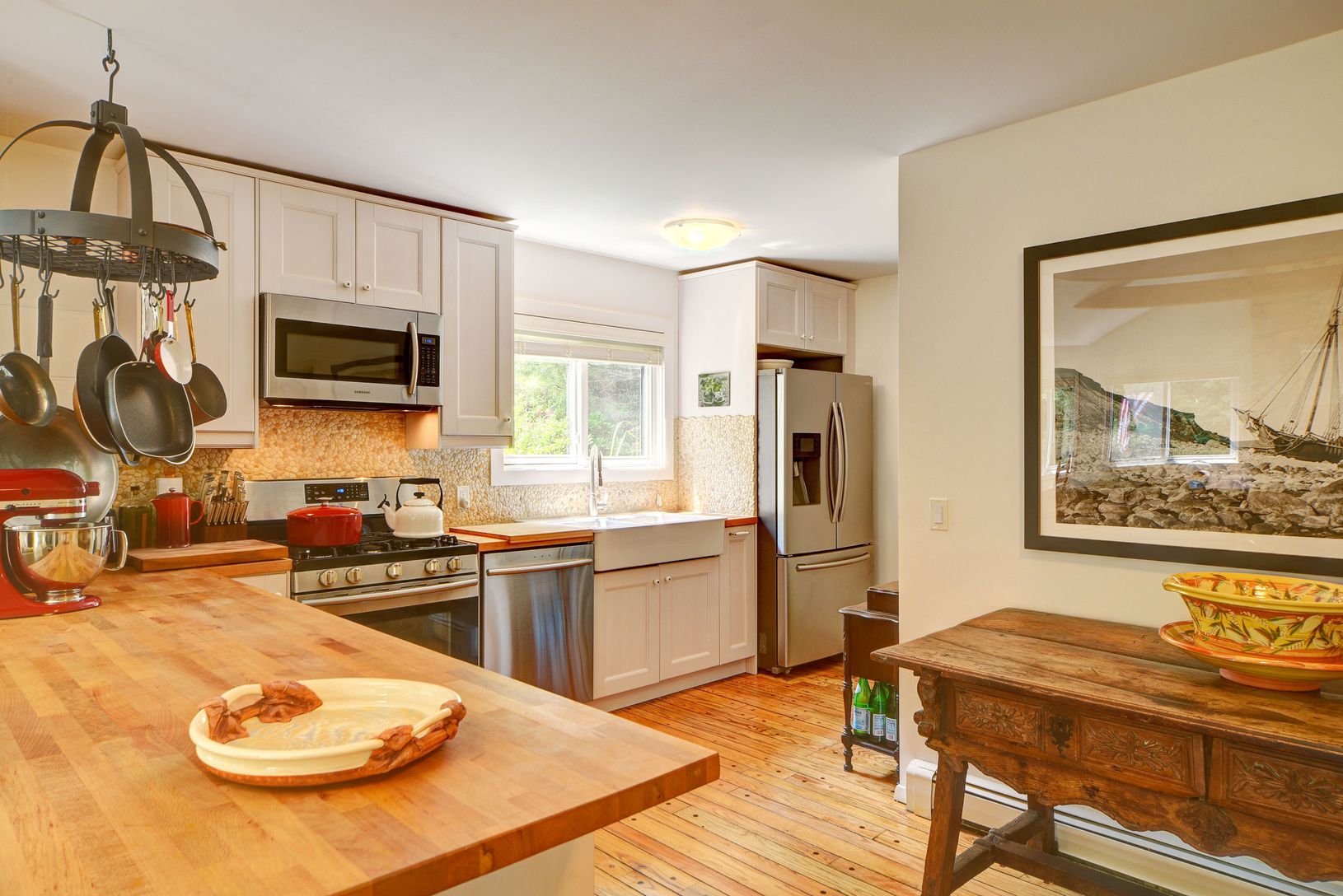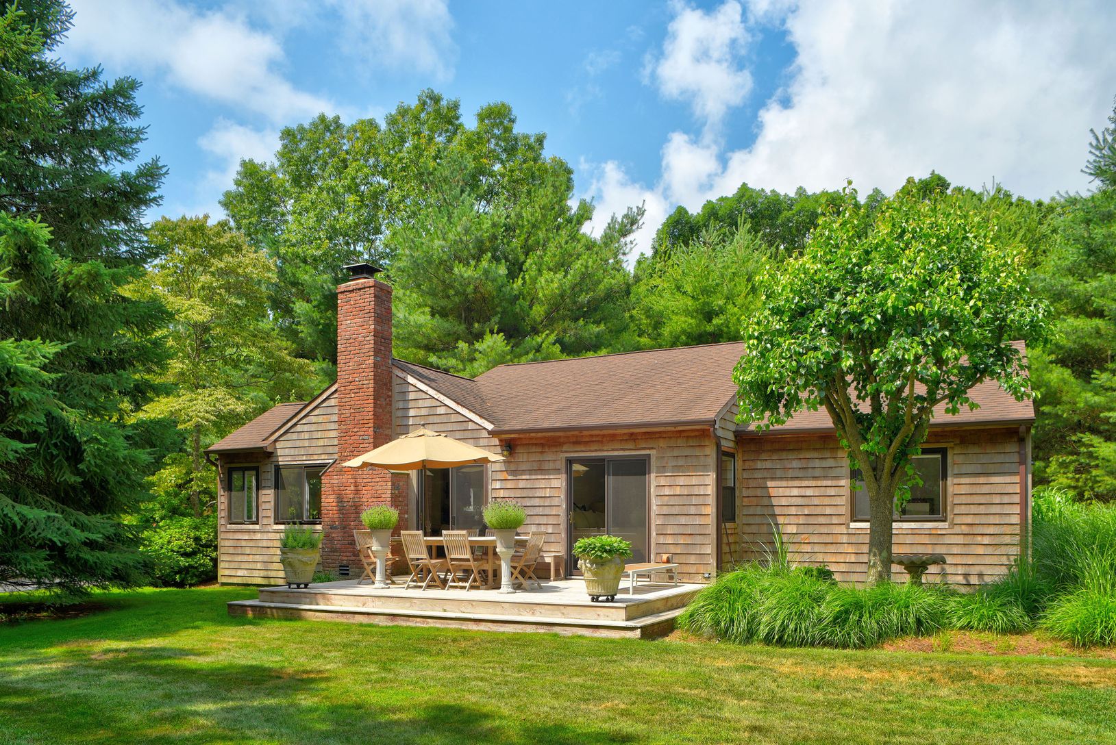 Nestled on a verdant 1-acre parcel, a well maintained, renovated 3-bedroom 2 bath cottage awaits on a quiet country lane that ends with a beach, a boat launch and blazing sunsets over Northwest Harbor . The charming open kitchen and living area under cathedral ceilings anchor a serene space warmed by a stone fireplace. The master bedroom with private bath is joined by two guest bedrooms and additional full bath. Doors lead to the deck well sui