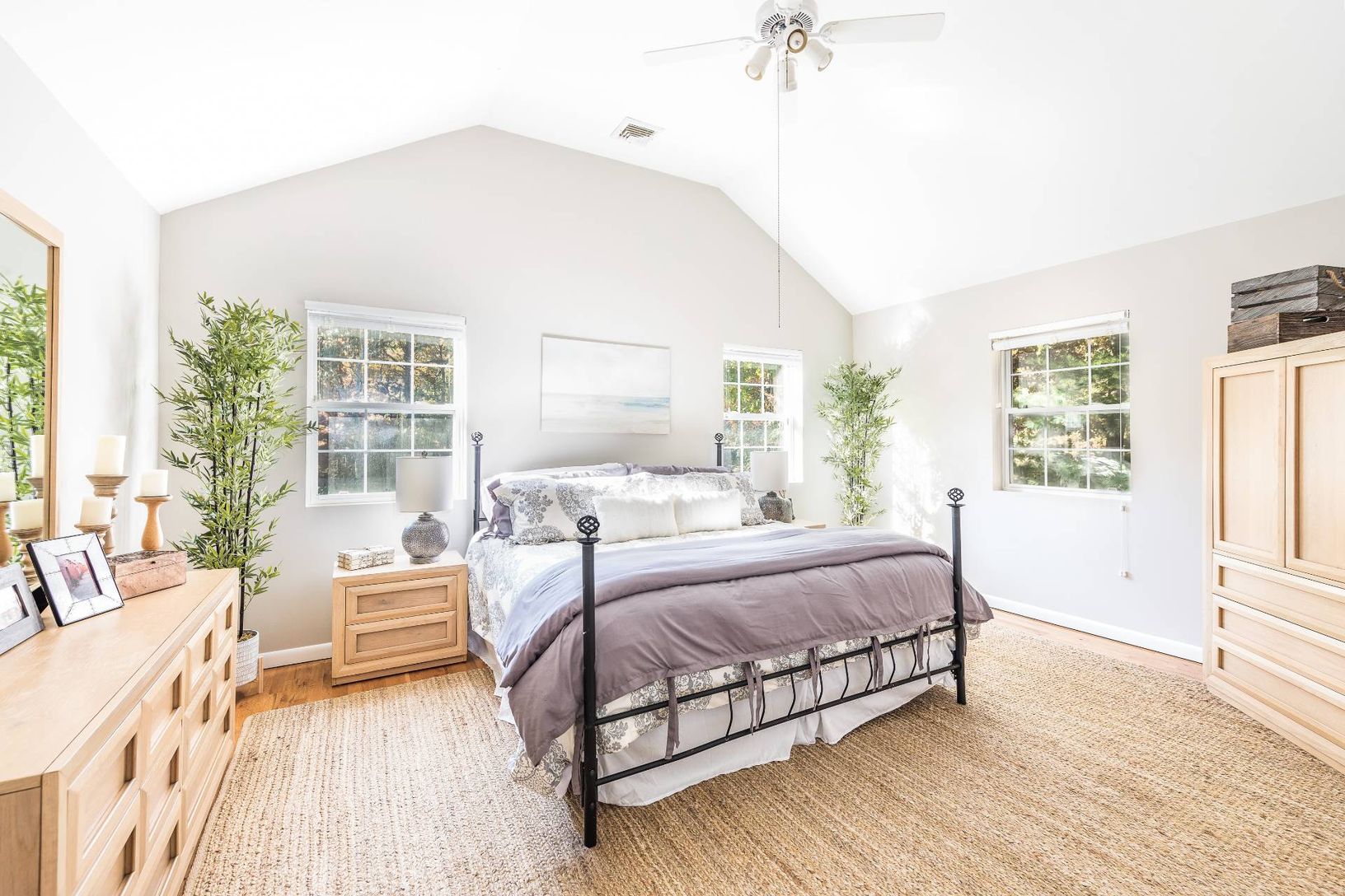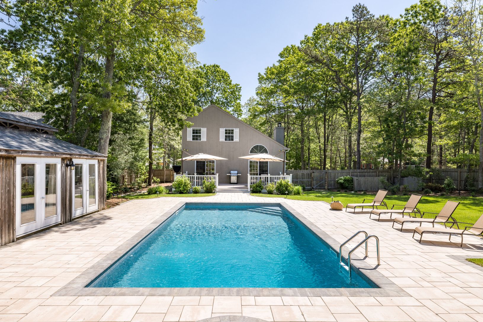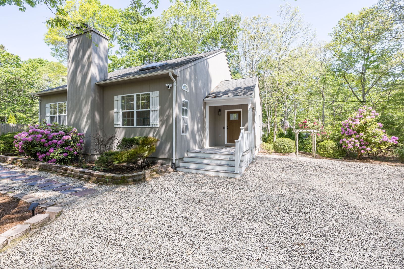 This beautifully updated and light-filled home on a quiet road along the East Hampton Village fringe offers the perfect summer getaway. The open floor plan with high ceilings creates a bright and airy setting perfect for entertaining. The newly updated chef's kitchen is fully equipped for all of your cooking needs. The main level features an ensuite bedroom, and upstairs lies two additional bedrooms and a full bathroom. The lushly landscaped a