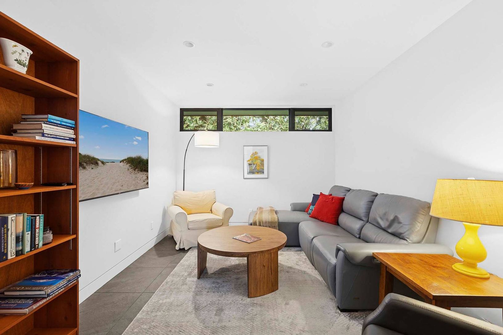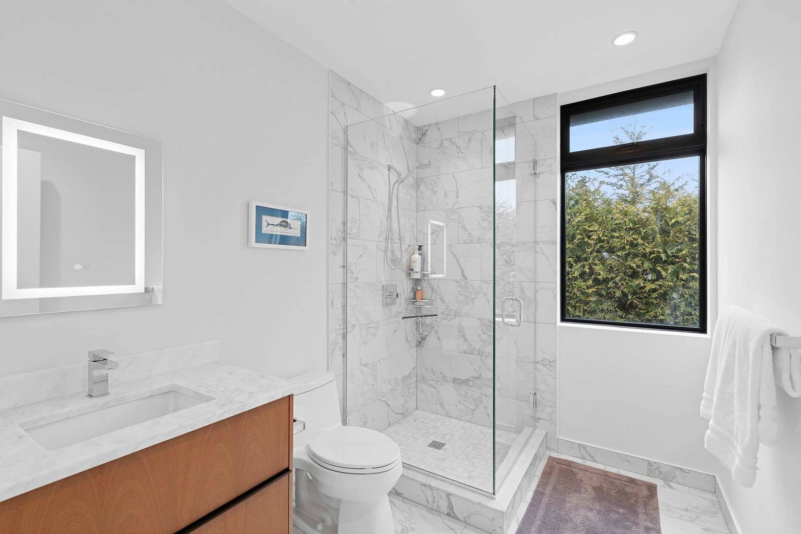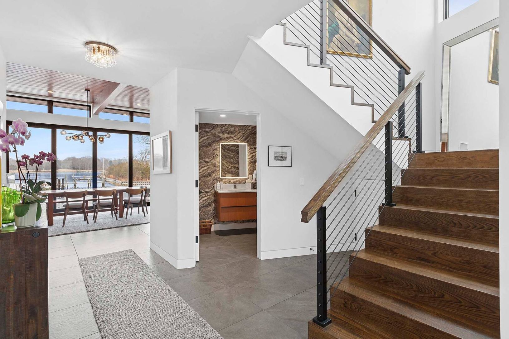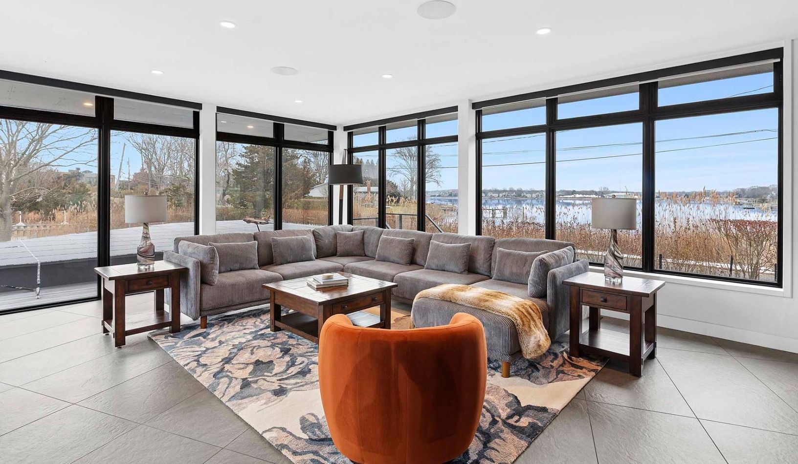 A brand-new architectural masterpiece on Sag Harbor Cove in the coveted Baypoint area of Sag Harbor, thoughtfully designed by the world-renowned Turkel Design. This striking waterfront residence spans approximately 4,500 square feet and is meticulously crafted to harmonize modern design with its extraordinary natural setting. A dramatic two-story foyer opens into an expansive open-concept great room, where walls of floor-to-ceiling glass frame
